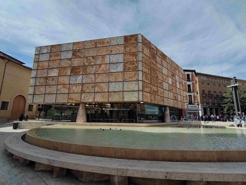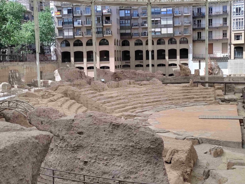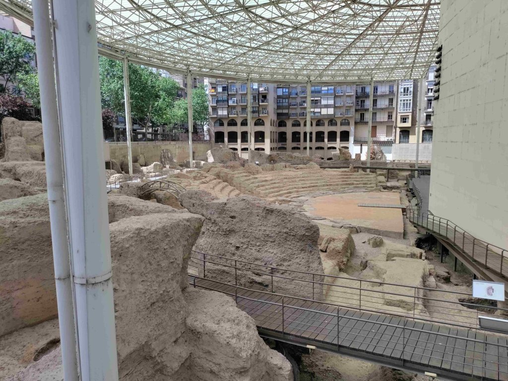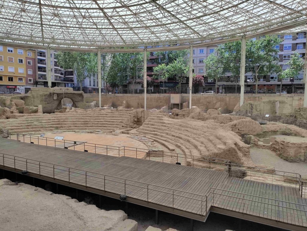 Hunting down somewhere to eat we walk down a sidestreet and notice a huge canopy which we find is protecting the remains of the Teatro de Caesaraugusta. It’s a Roman 6000 seat theatre from the 1st century AD, built in the Age of Tiberius and Claudius. It’s closed but we can peer through the bars and be wowed by the fact that it was only rediscovered in the 70’s.