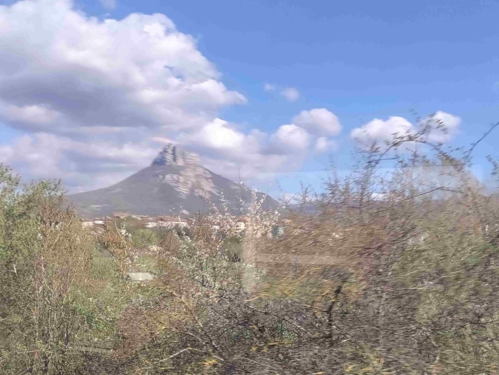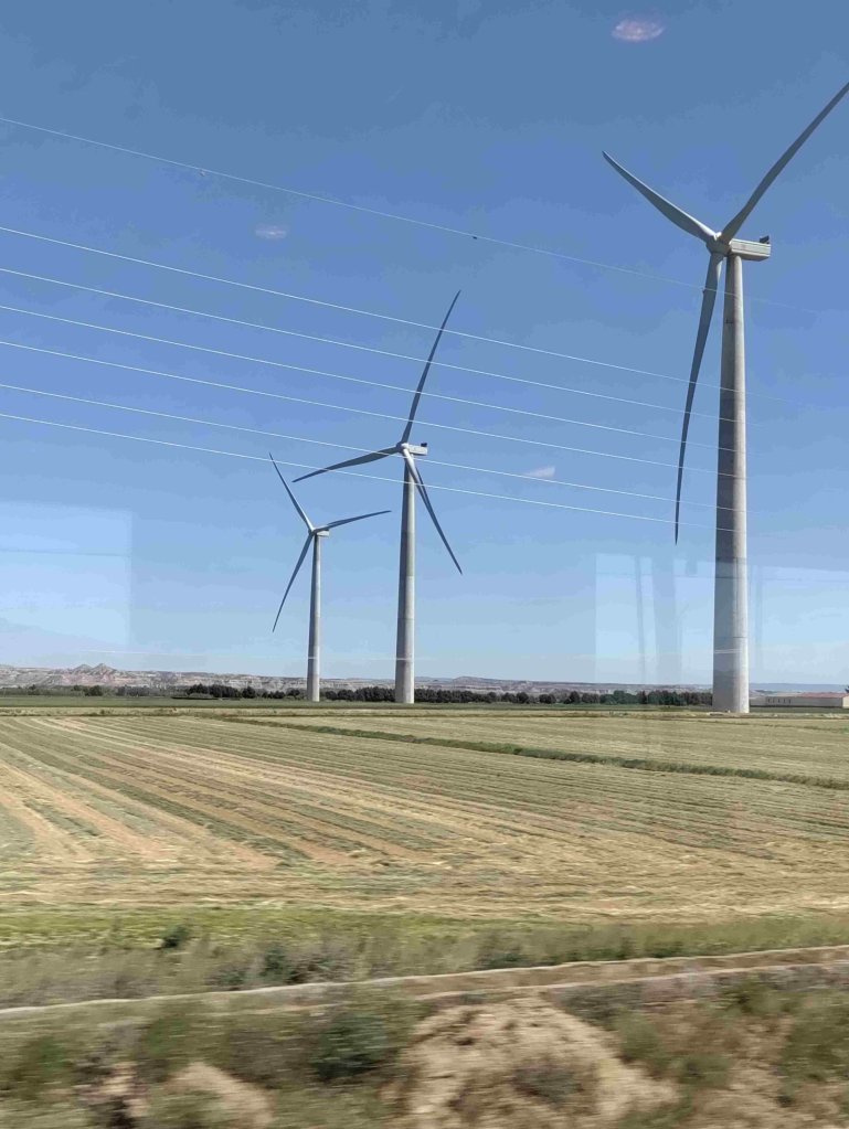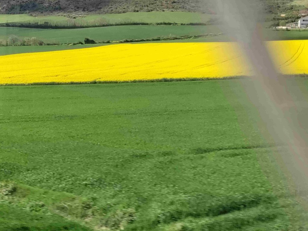 Pamplona is our first stop where we have an hour to wait for our connection. We see loads of wind farms and rape fields in full colour along the route. Jacky and I mind the bags and drink tea in the sunshine outside the station whilst the rest walk into Pamplona to see the view and hop on the funicular on the way back.