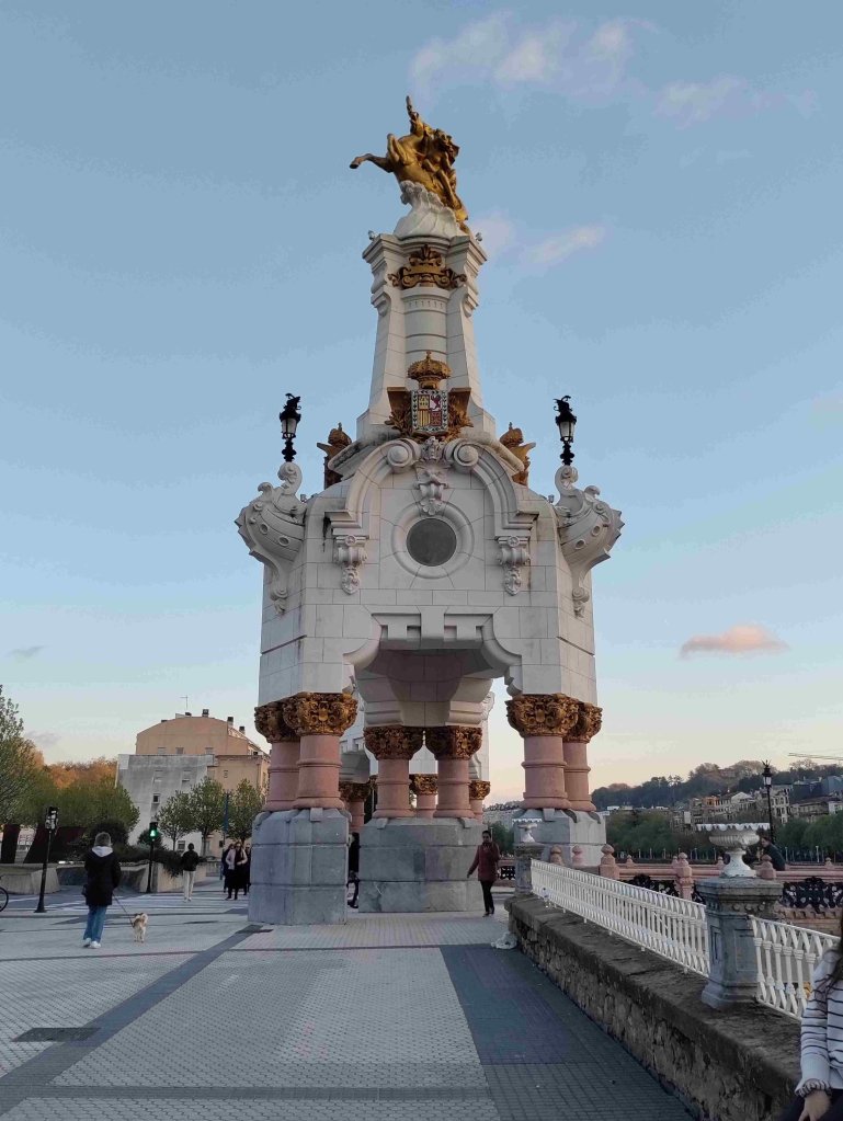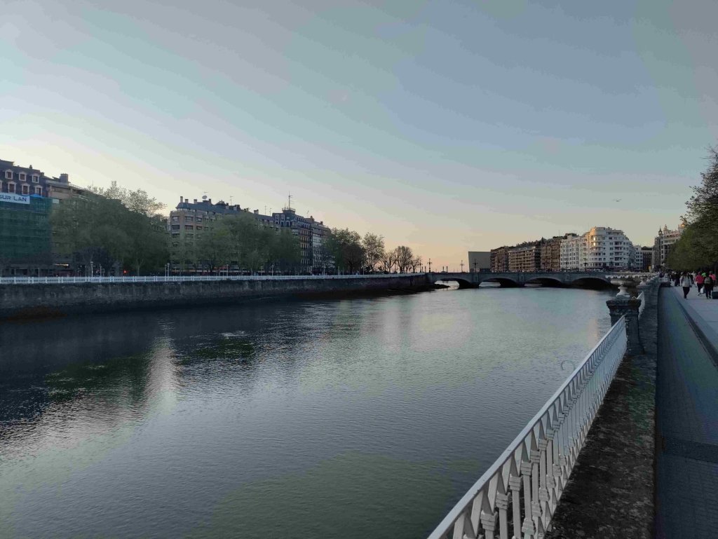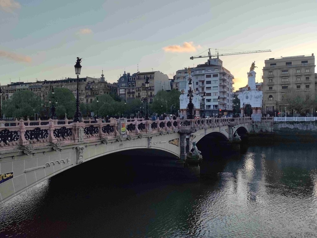 We arrive at 8:15pm and cross the river Urumea over a very ornate bridge and walk to our apartment.