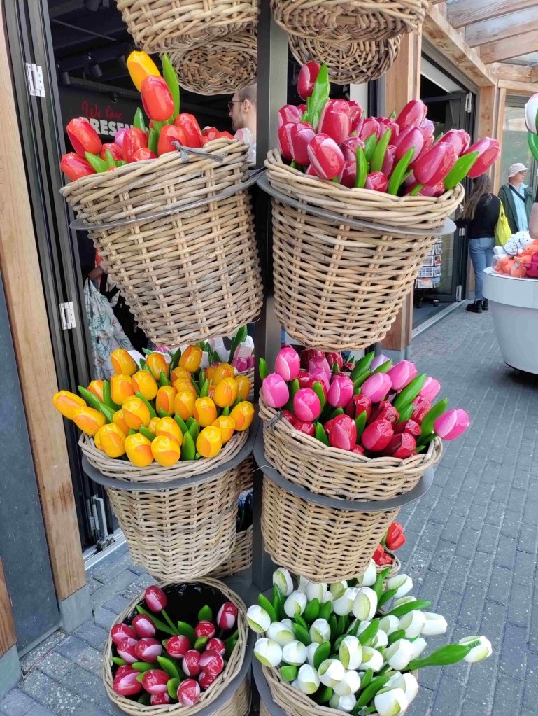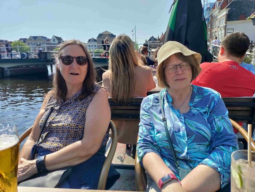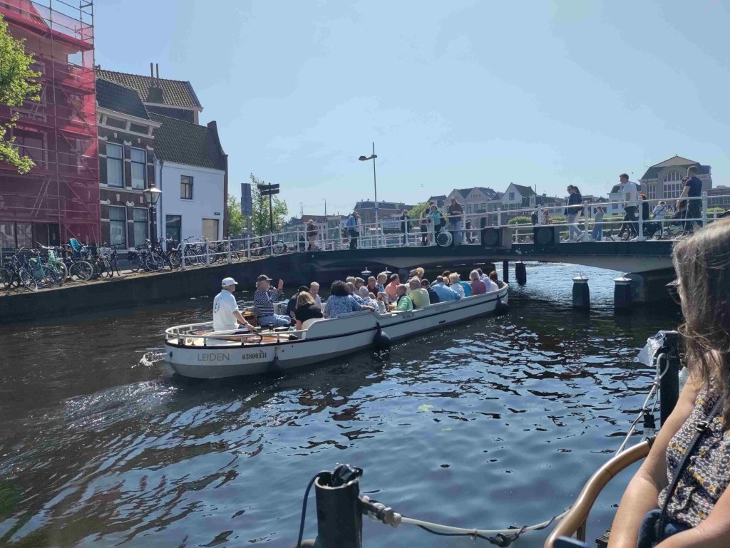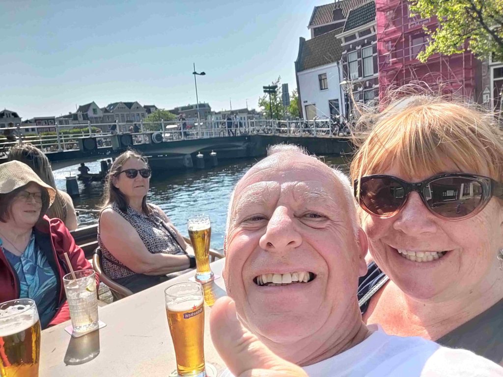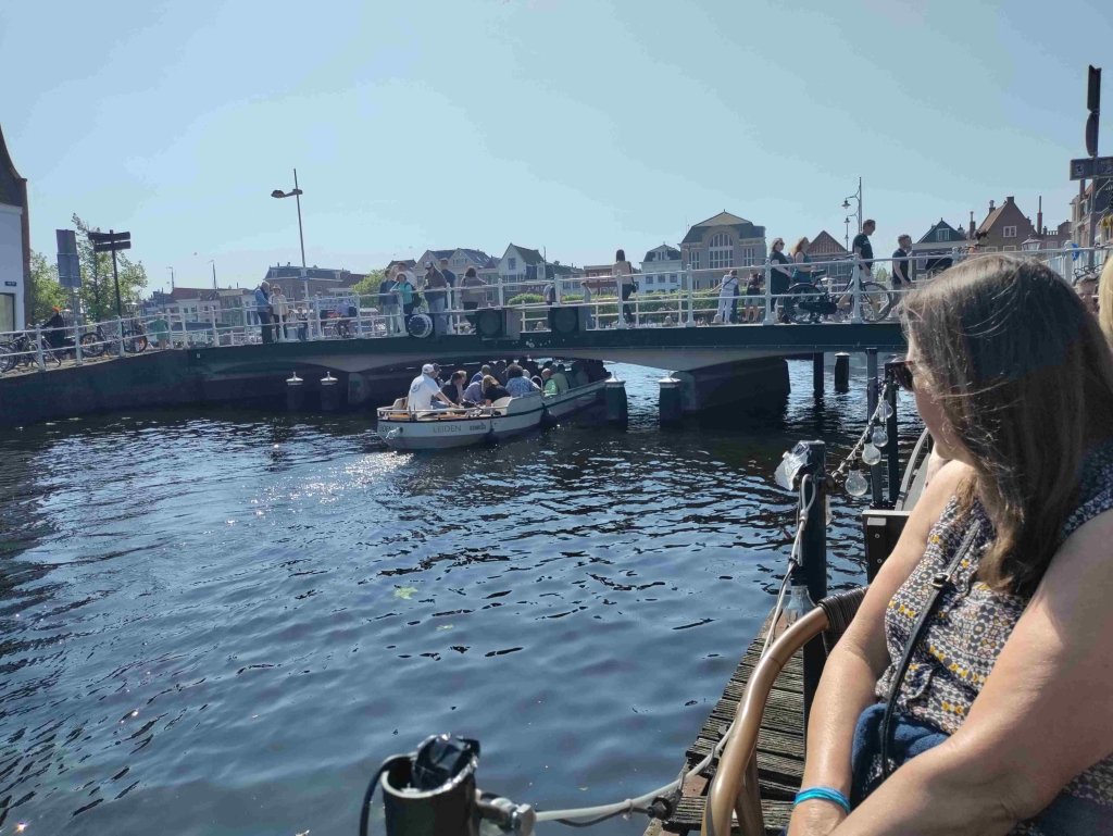 We stroll around the gardens and displays inside and out and 2.5 hours later are ready to depart. No wait for the bus back into Leiden where we wander into the main square and sit in the sunshine next to the canal and watch the world go by on the canal, eating chips and drinking beer. We are entertained by the boat goers having to duck under a nearby bridge to avoid being knocked out.