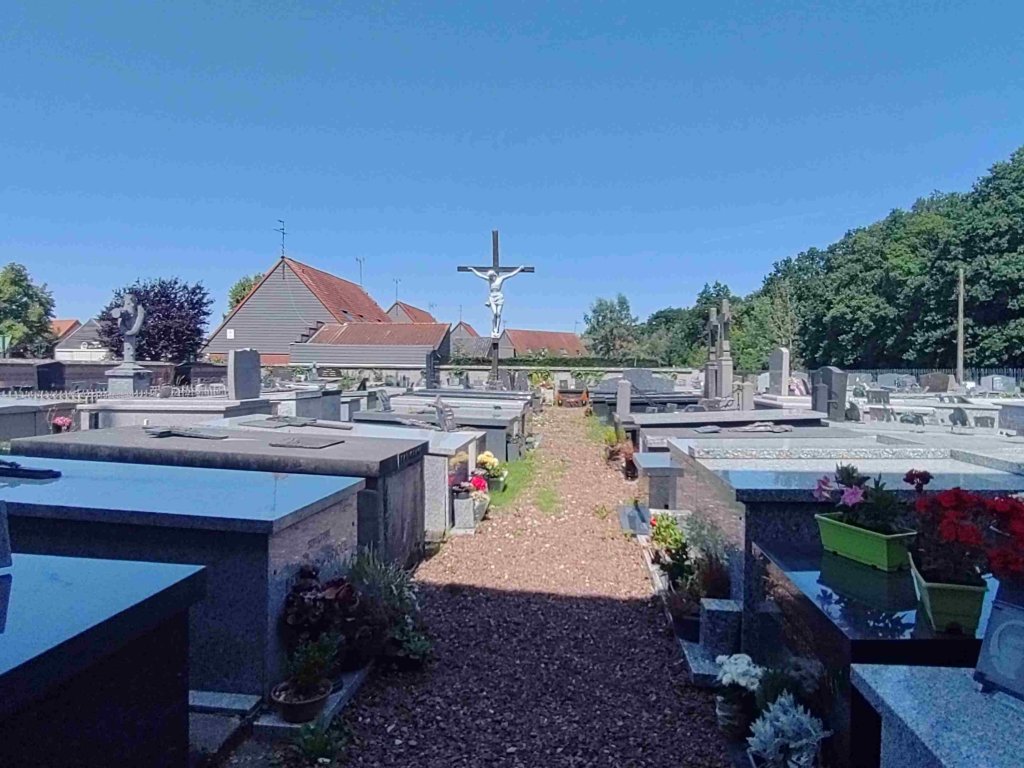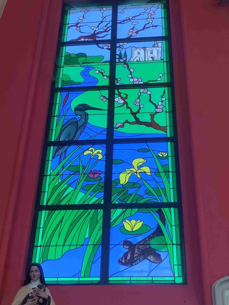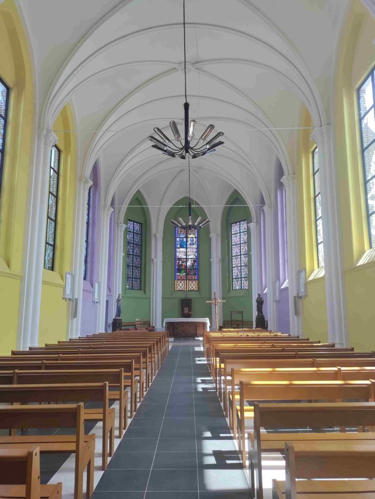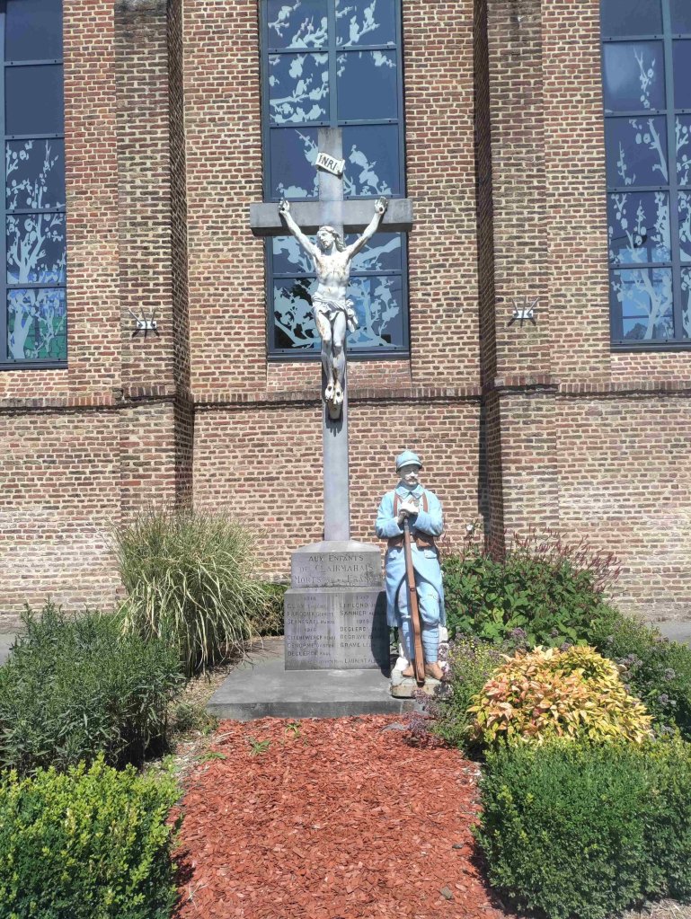 Eventually we land in Clairmarais and visit St Bernards church. It’s brightly painted walls and modern stained glass windows are unusual and attractive. Spend 50c trying to light a couple of candles but failing. The cemetery next to the church is full of monumental grave stones and two WWII war graves.