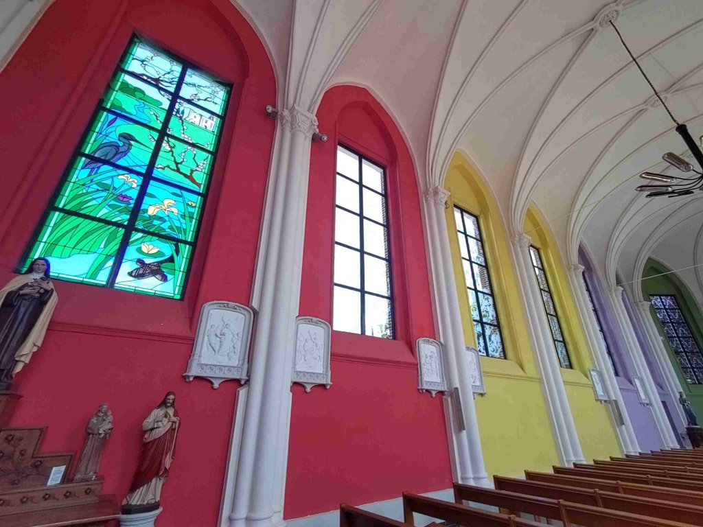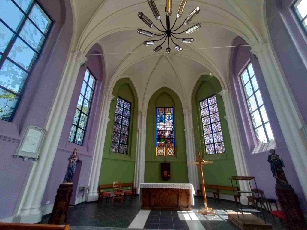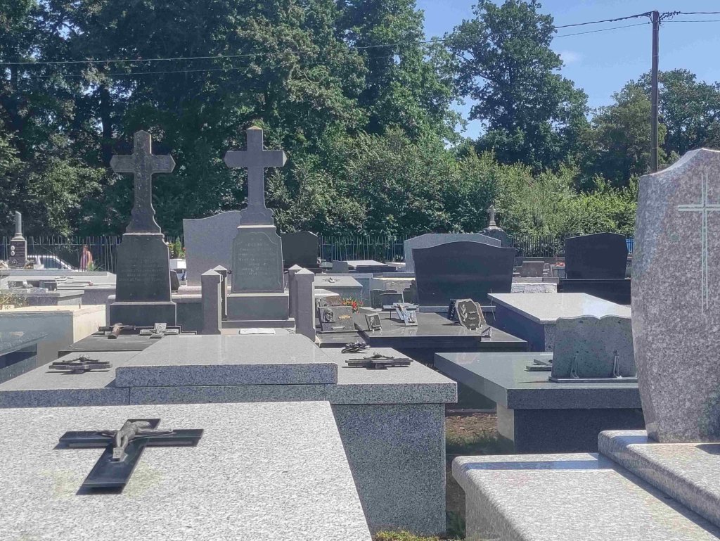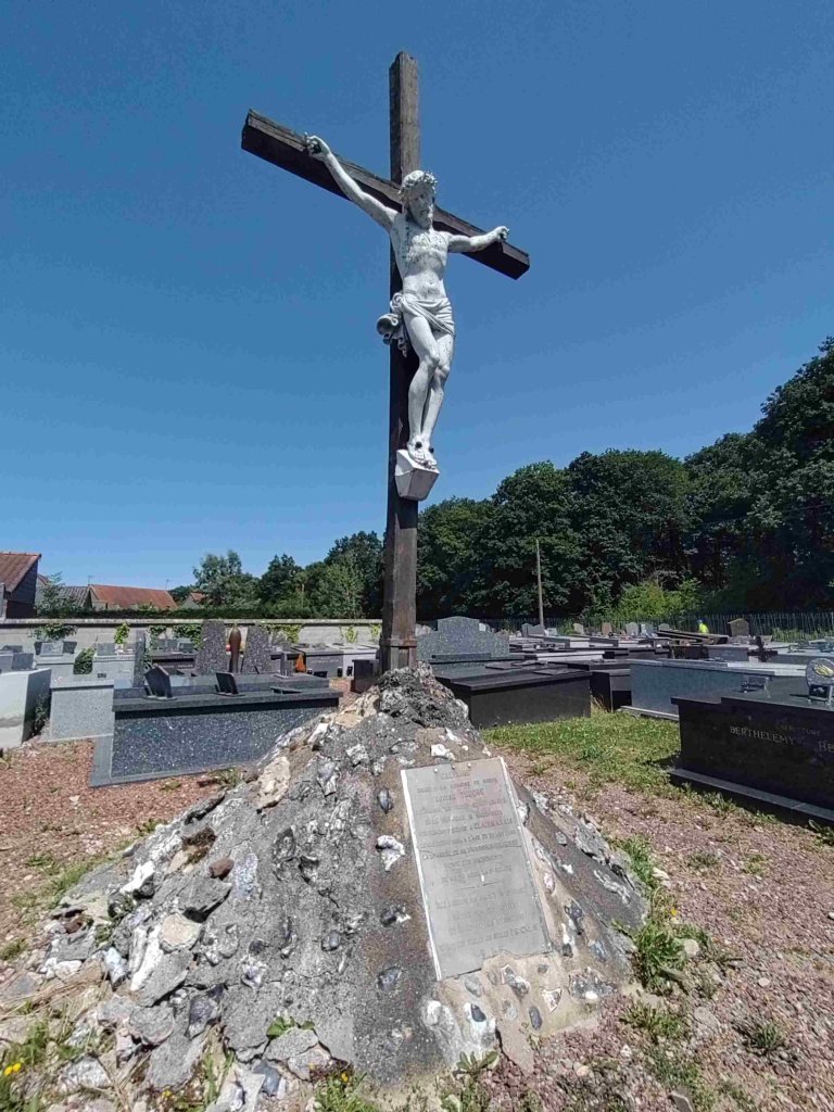 Eventually we land in Clairmarais and visit St Bernards church. It’s brightly painted walls and modern stained glass windows are unusual and attractive. Spend 50c trying to light a couple of candles but failing. The cemetery next to the church is full of monumental grave stones and two WWII war graves.