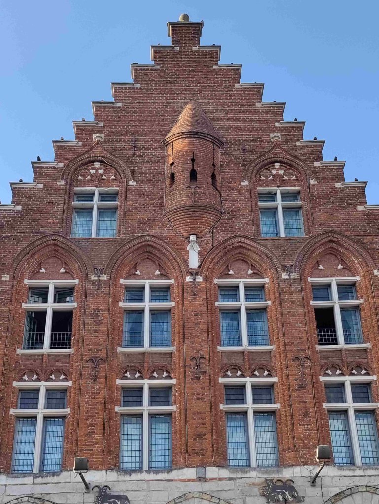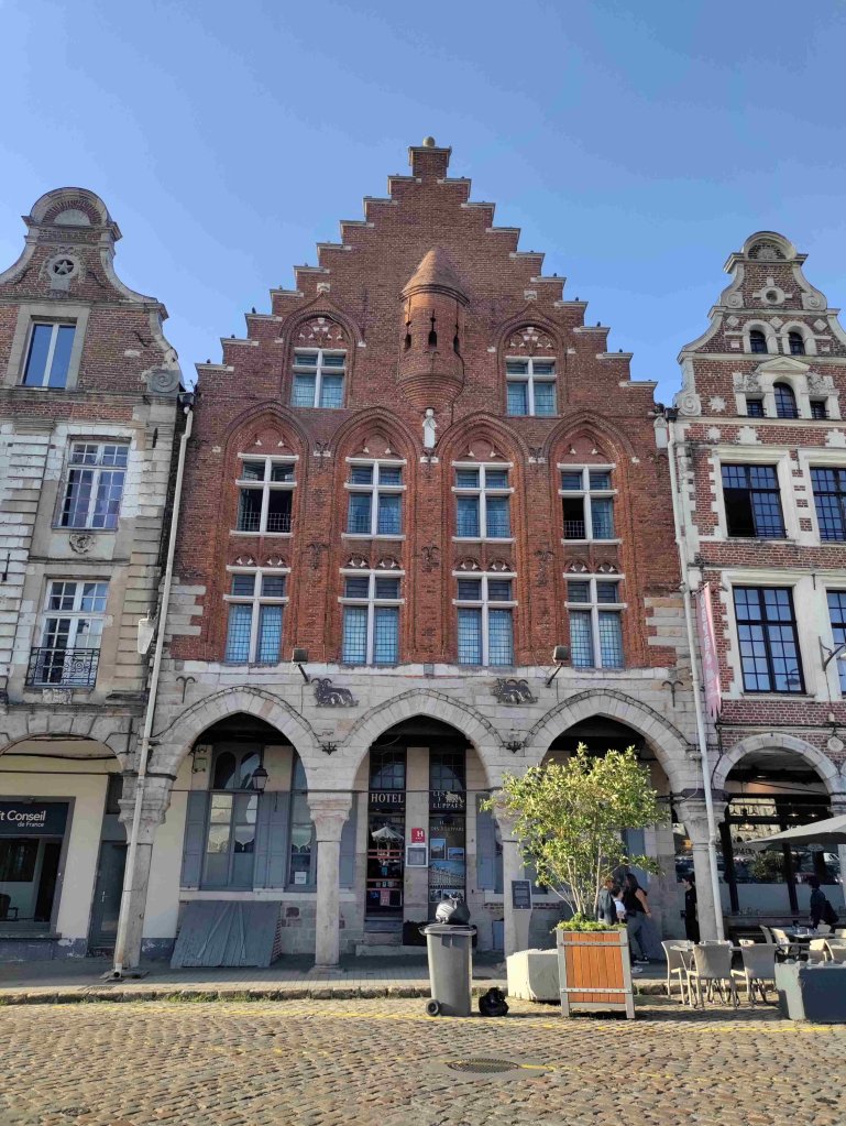 We walk along the river in the sunshine and then up into the town passing by a monumental building but we don’t stop as it looks closed. We continue up the road into the impressive and amazing Place des Heroes. It’s a massive square surrounded by buildings built in the Flemish style with a huge Town Hall building and Belfry towering over one side of the square. Although it all looks very old, and was first built in 1501, it and most of the square was destroyed in WWI and subsequently rebuilt identically after the war. The square originally Called The Petite Place, was renamed in 1945 in honour of the resistance fighters who were shot in WWII. Small it is not.