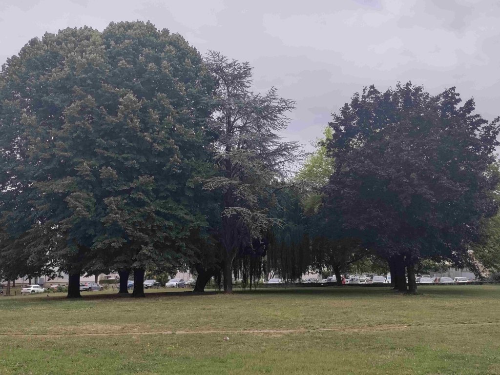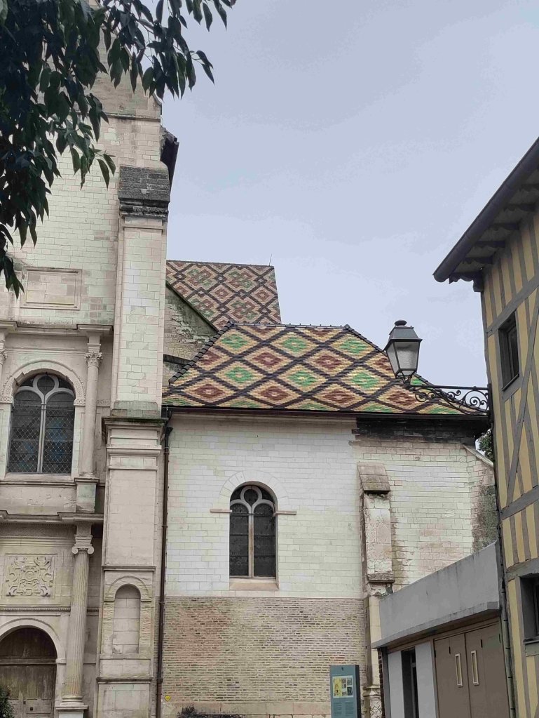 It’s starting to spit a bit as we wander towards Eglise Saint-Nizier which is shut but we take a photo of the tiled roof hiding under a nearby tree.