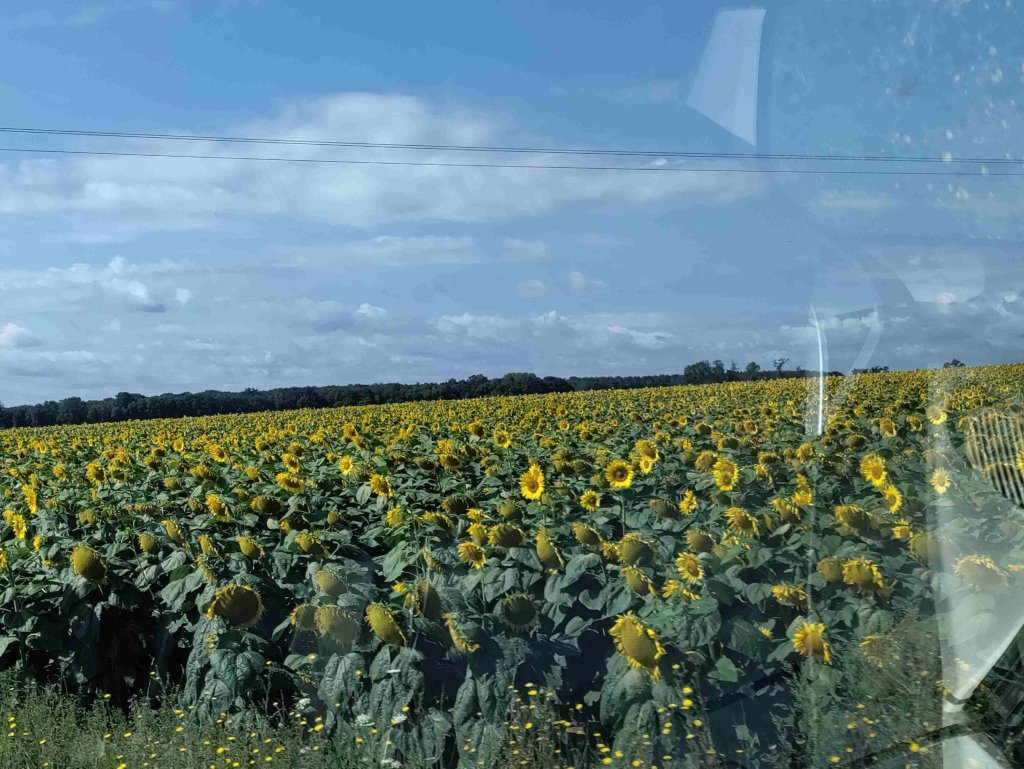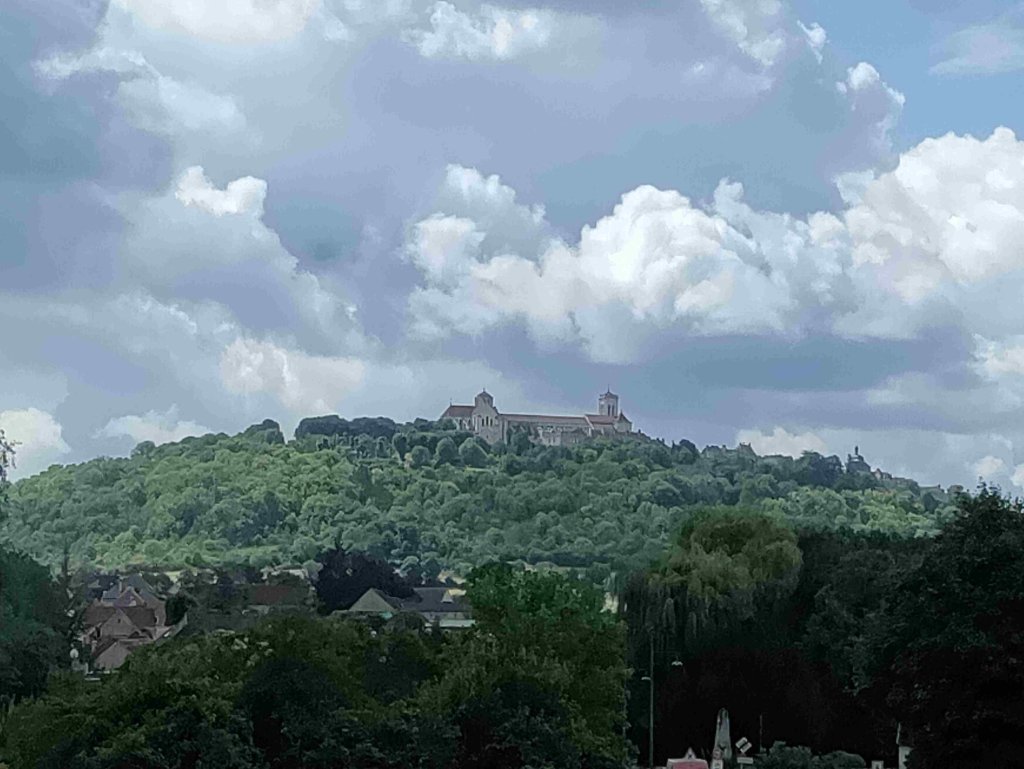 It’s a good journey in the sunshine passing lots of fields of sunflowers and vineyard’s along the way. As we land in Saint-Pere we can see Vezelay in the distance at the top of the hill.