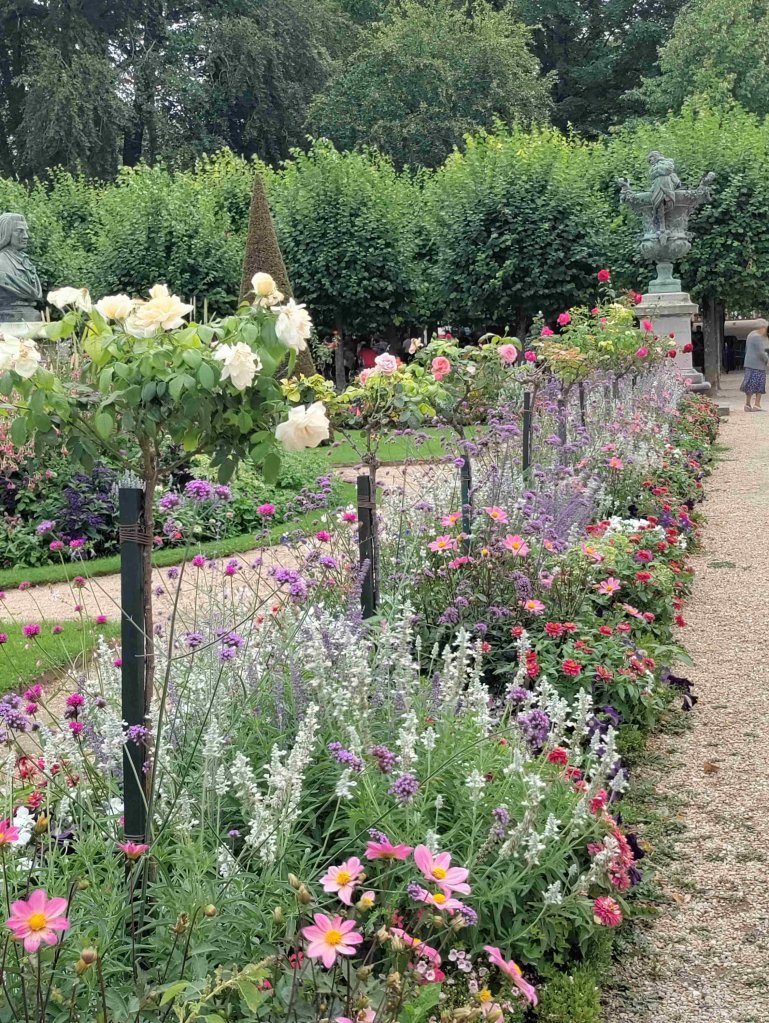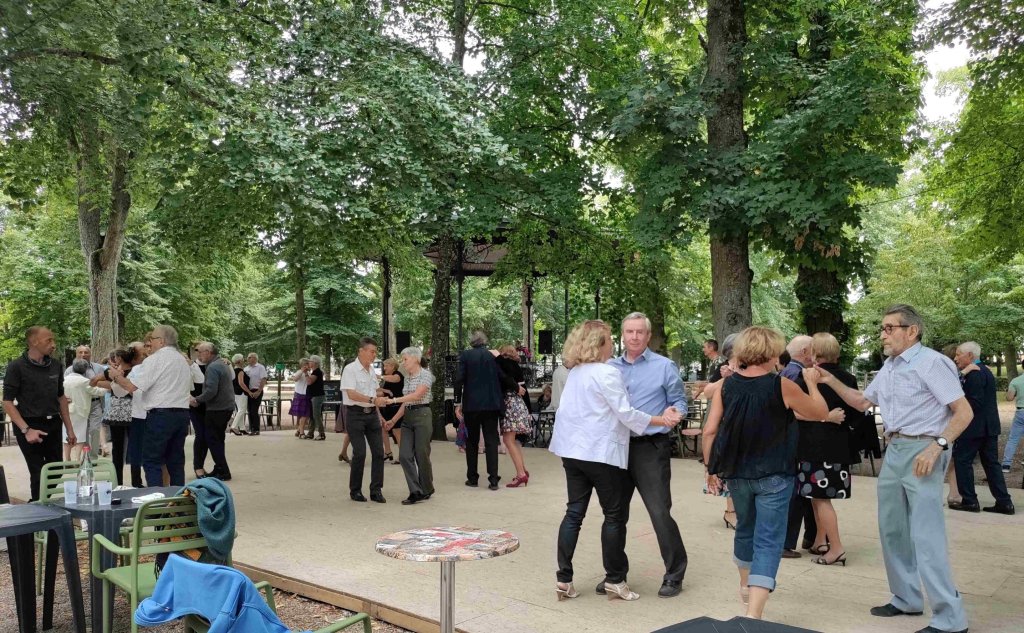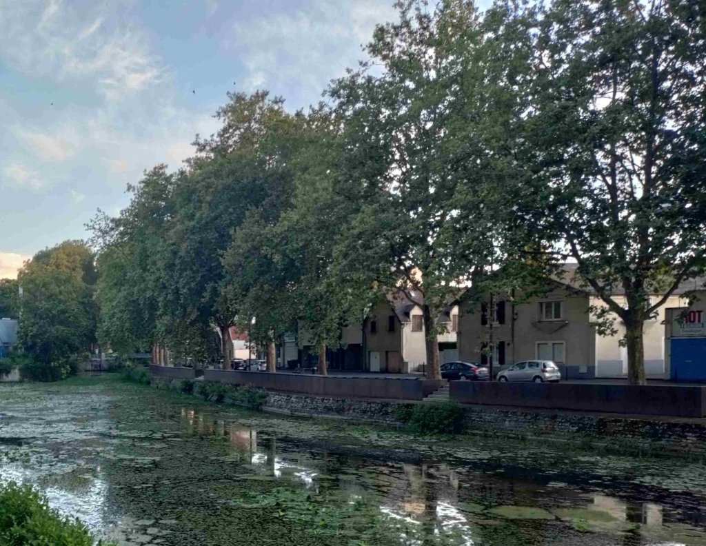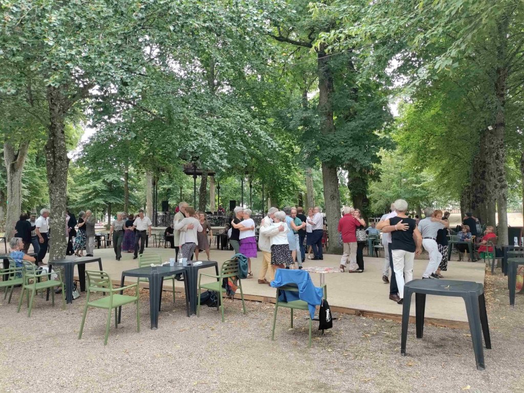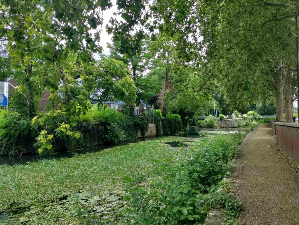 The space outside the cathedral is being set up for some sort of festival. We walk towards the park next door on our way to the Marais de Bourges, a swamp. The park is a riot of colour with flowers in full bloom everywhere. There’s a bandstand, a band and a dance in full flow with loads of mostly pensioners showing off their moves and having a wonderful time.