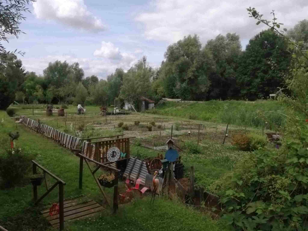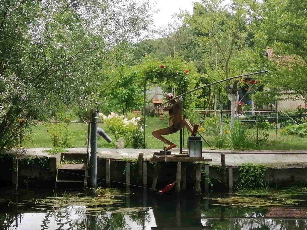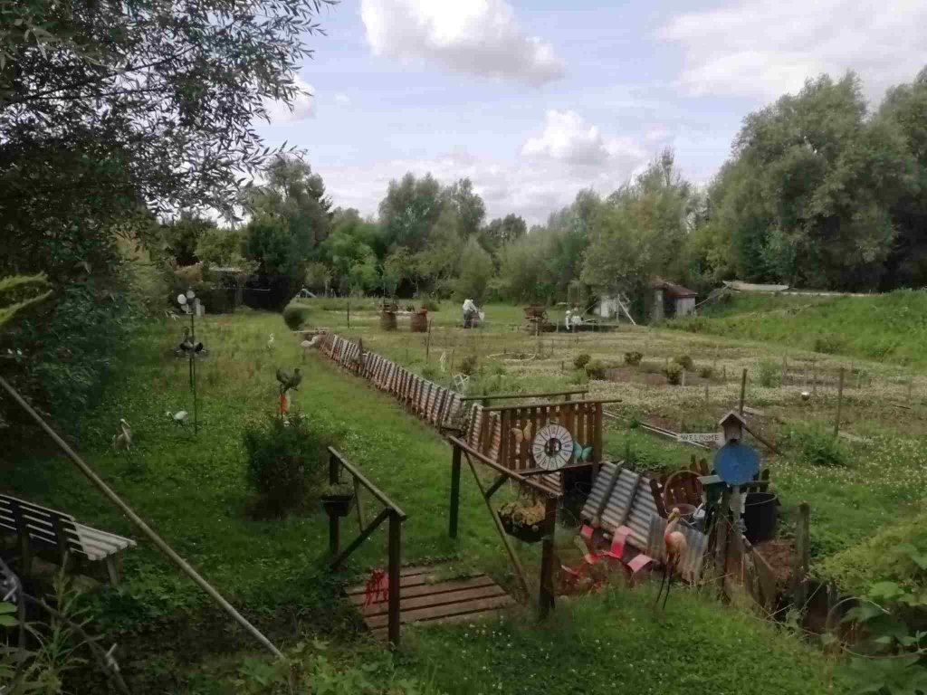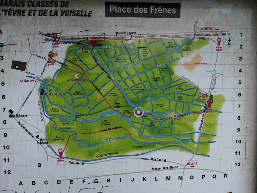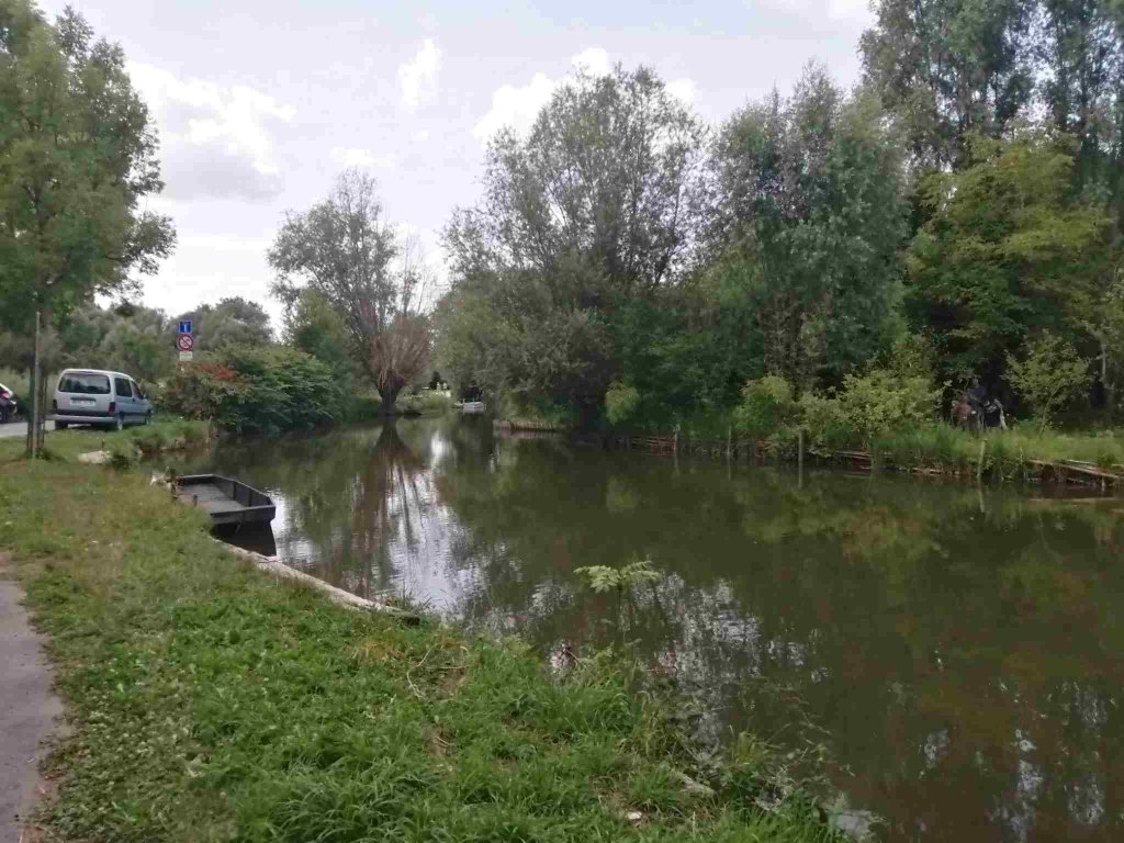 Down the hill to the Marais entrance we cross a little bridge and walk along the waterways. It’s a strange place as on both sides there are what look like allotments and gardens in various states of being loved, some filled with vegetables, some overgrown with collapsing sheds and fences. As we wander around we realise all these plots must be privately owned as we spot a couple of for sale signs.