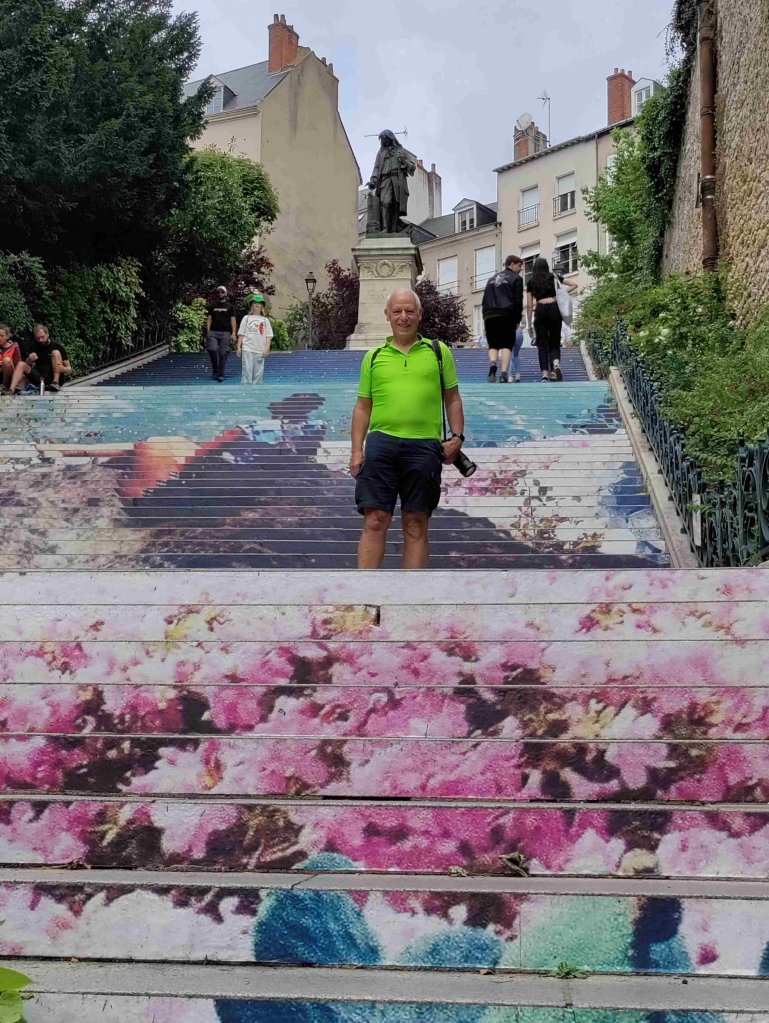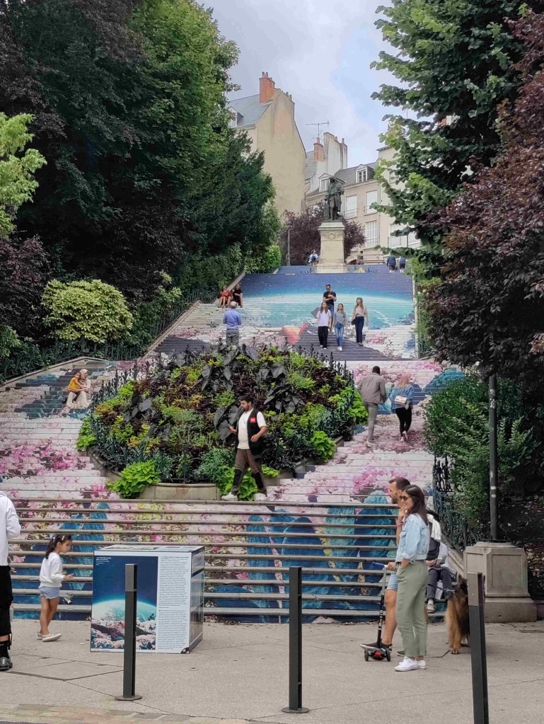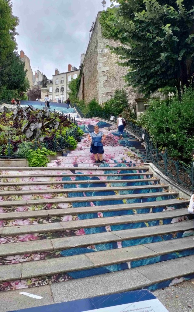 We wander up a street drawn in by an interesting set of steps being used as canvas for a huge work of art. It looks fabulous from a distance. Up the steps we get views back along a very long very straight road into the distance.