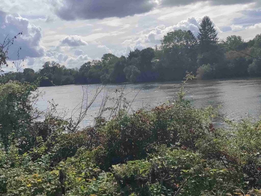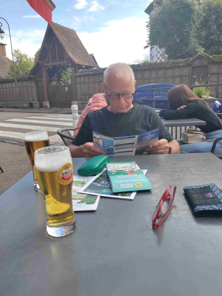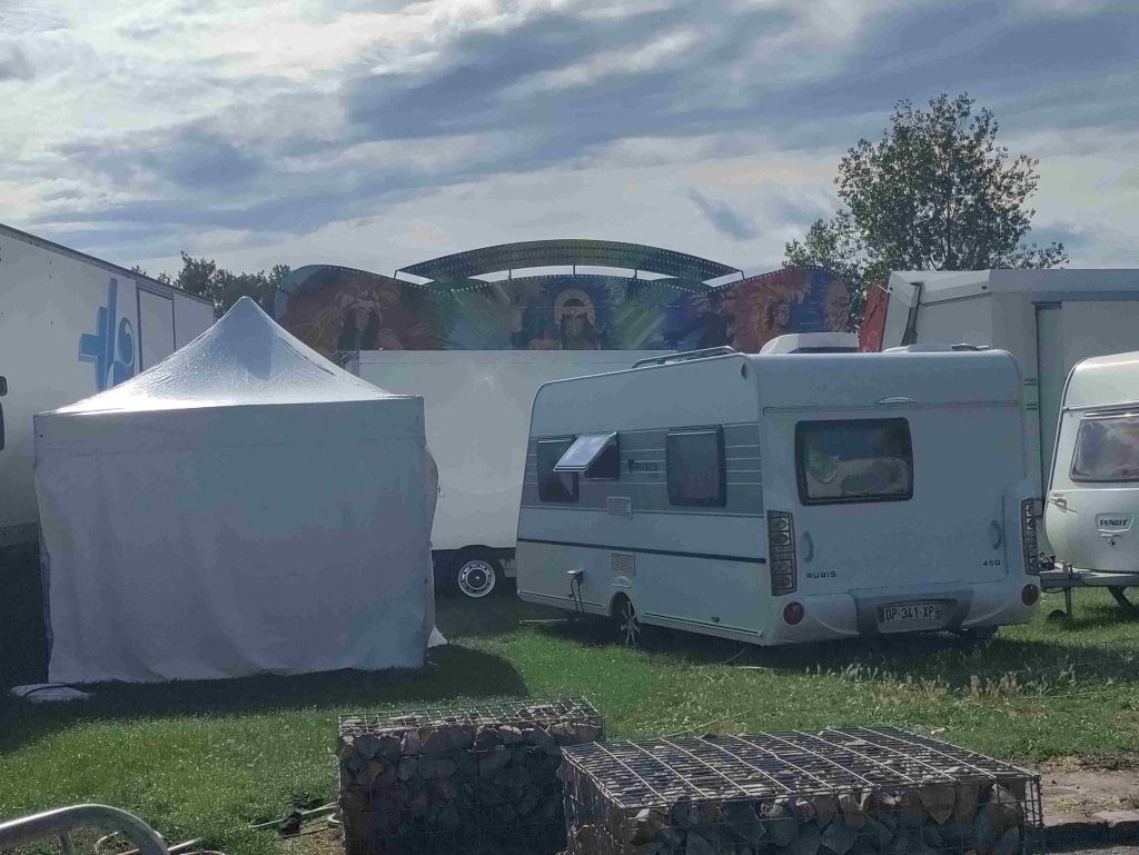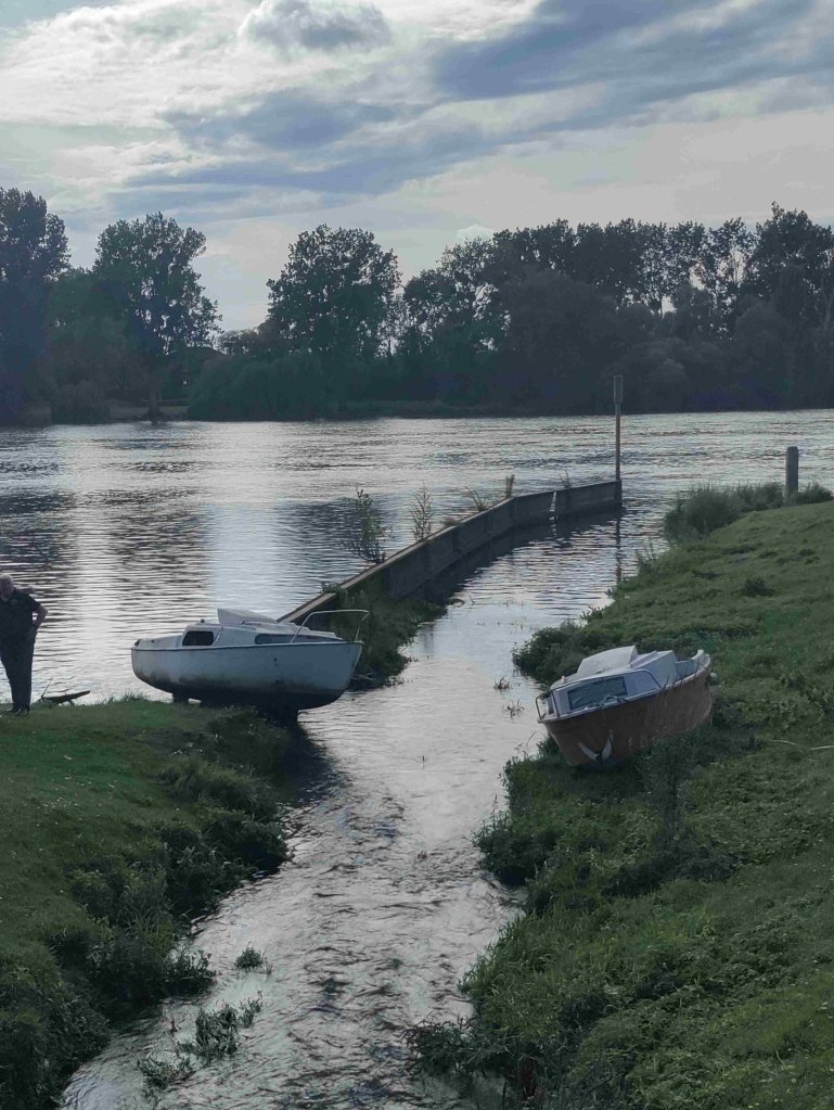 Arriving in Les Andelys it’s raining again so setting up is wet work. Takes us a while as we need the ramps and also have to move pitches because the first one is dark under a large weeping willow tree and also very muddy underfoot.