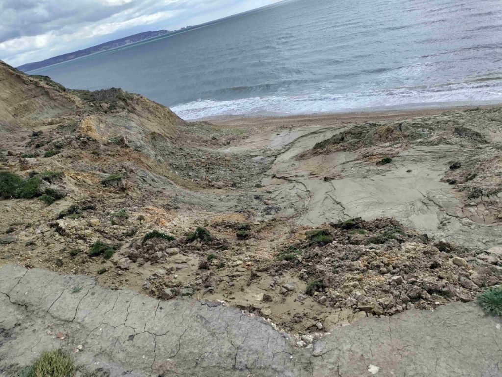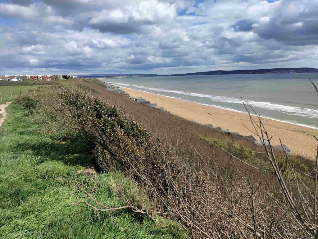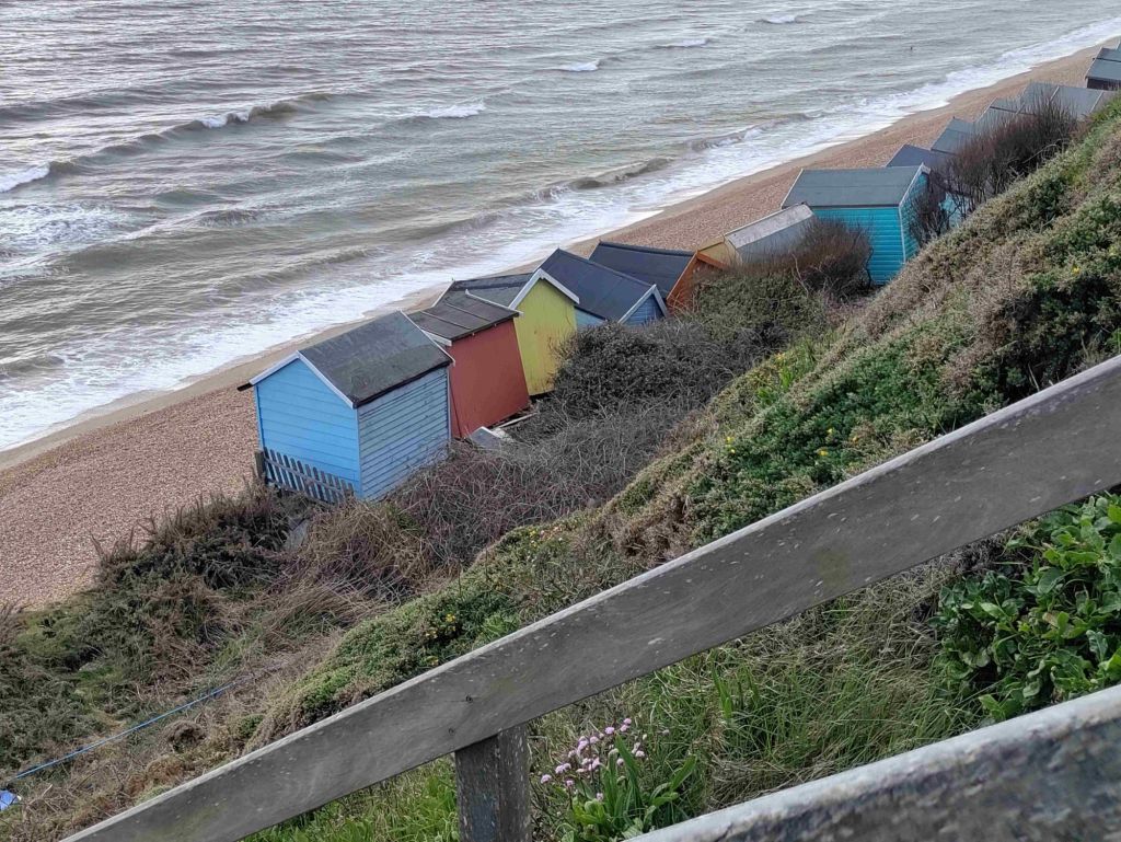 The coast is eroding away and there are signs up about plans to move the coastal path back from the crumbling edge. As we wander along we can see where there have been rock falls and at certain points where the path literally disappears. As we get closer to the town we see signs indicating that a part of the beach is closed and beach huts are literally falling down the slope towards the beach.