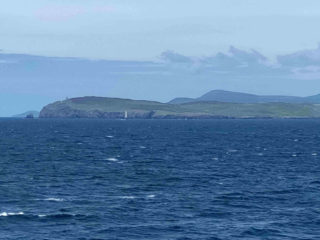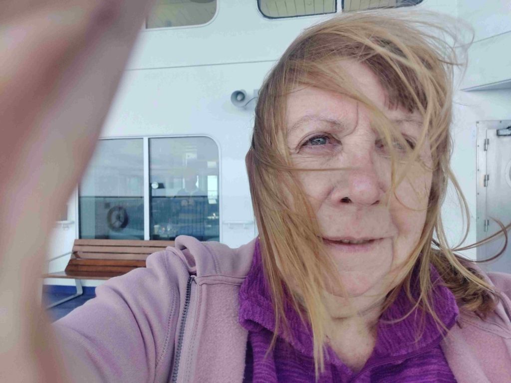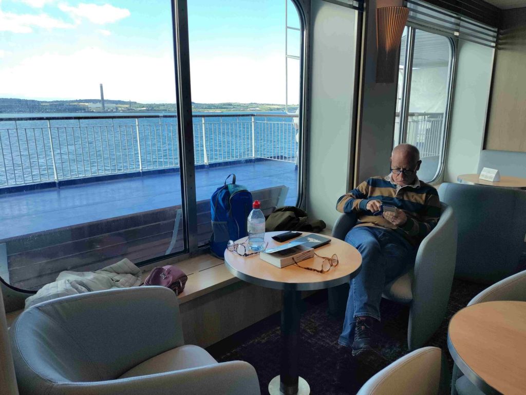 We find ourselves a window seat and spend the next rather tedious eight hours reading, planning and googling. Along the way we pass the Isle of Man and I get blown away taking a photo on the deck.