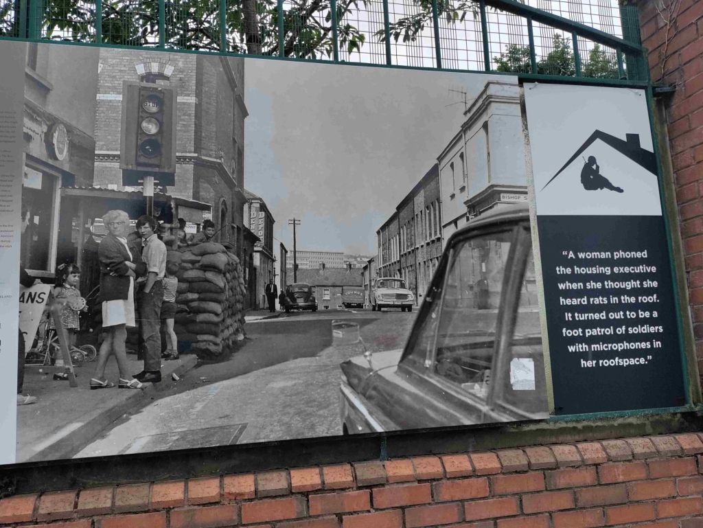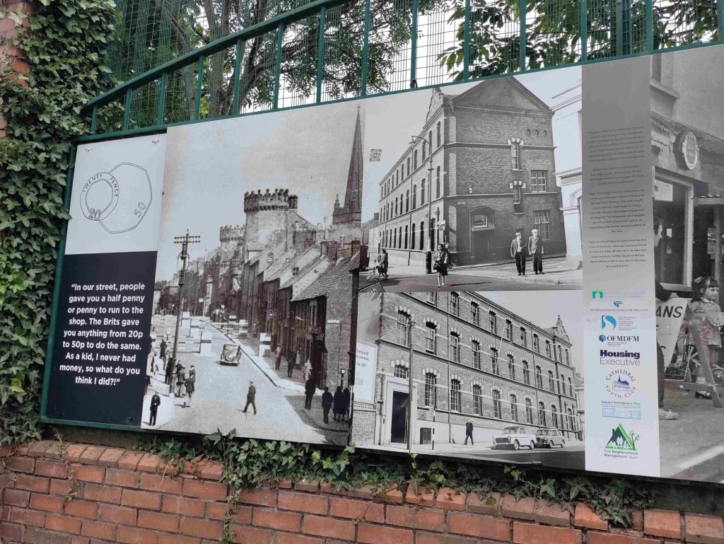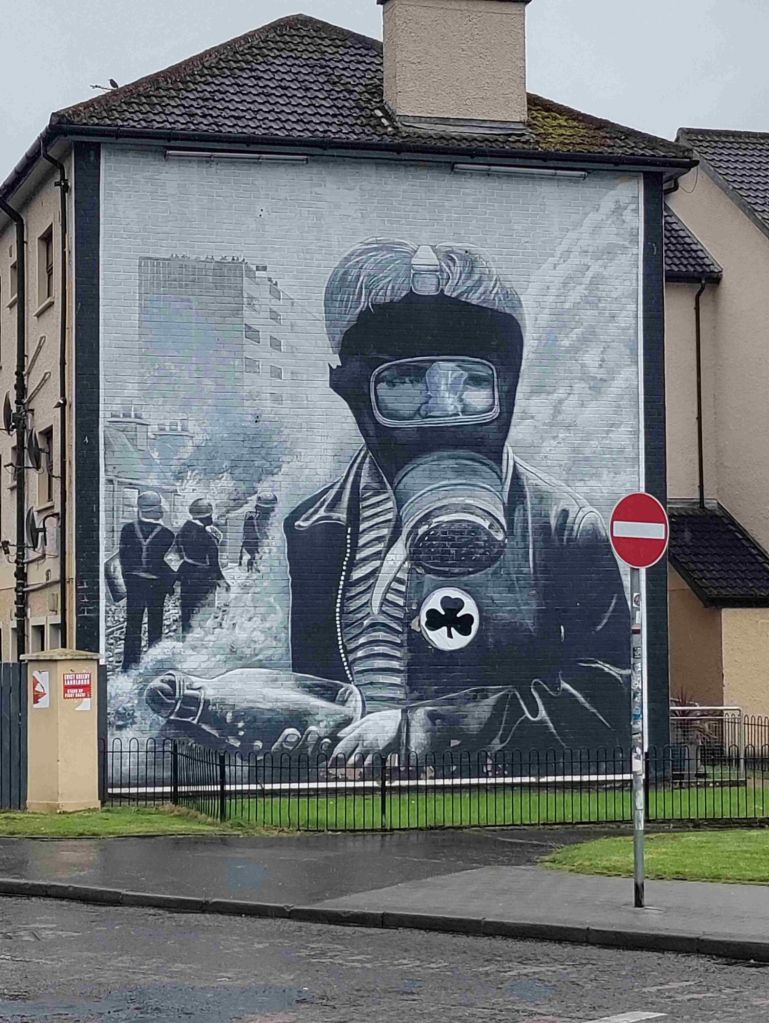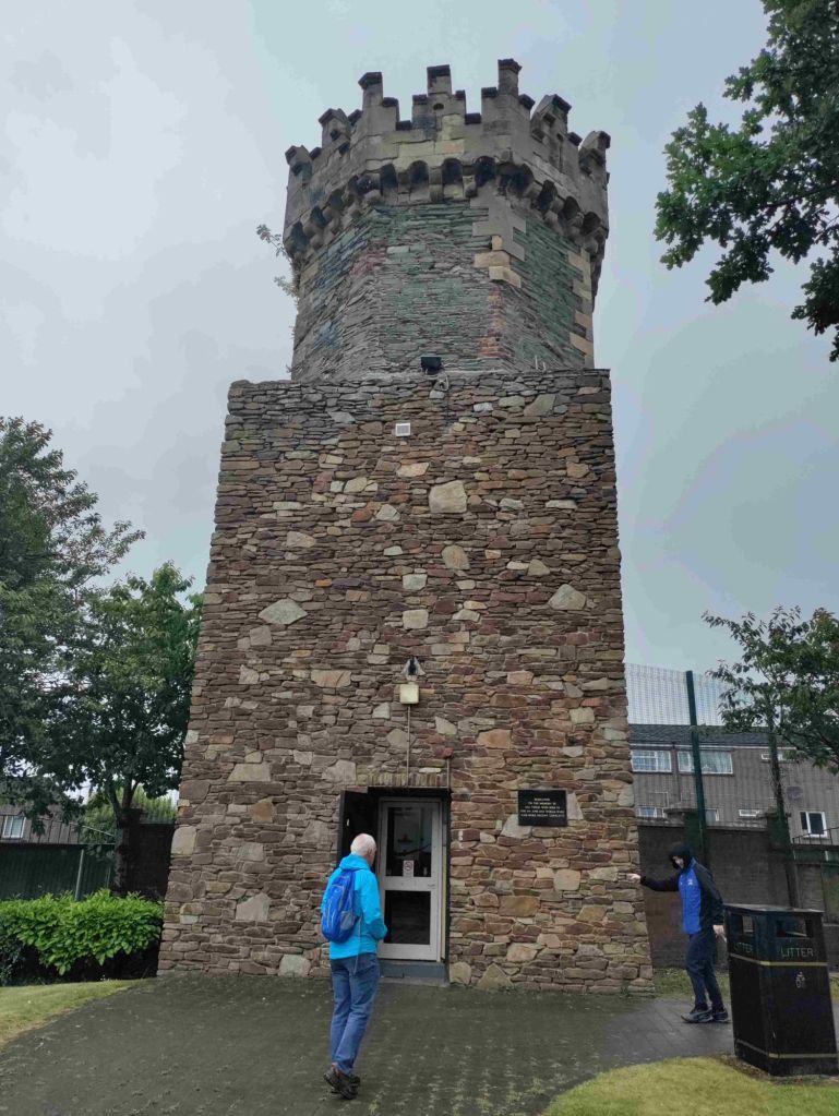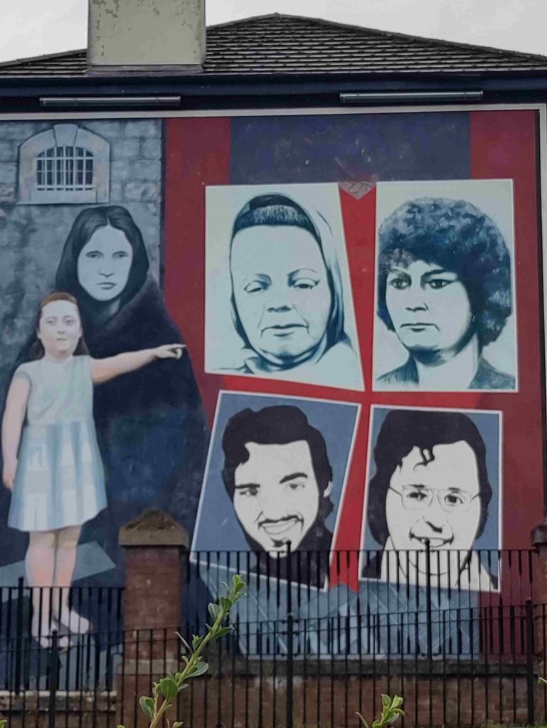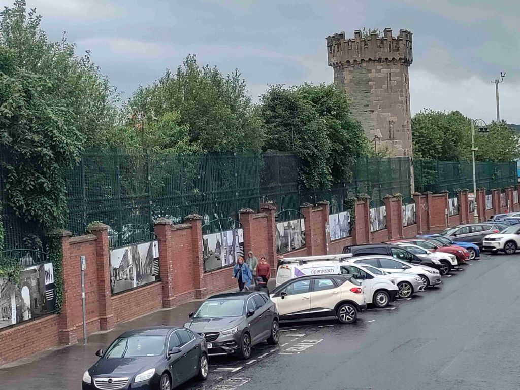 Next we have to retrace our steps to New Gate in order to visit a loyalist area called The Fountains. It’s raining on and off now so our trusty blue macs are on and then off. There’s murals and fences and the Heritage tower museum that used to be part of a much larger prison.