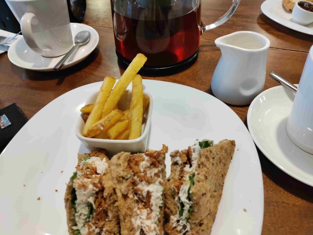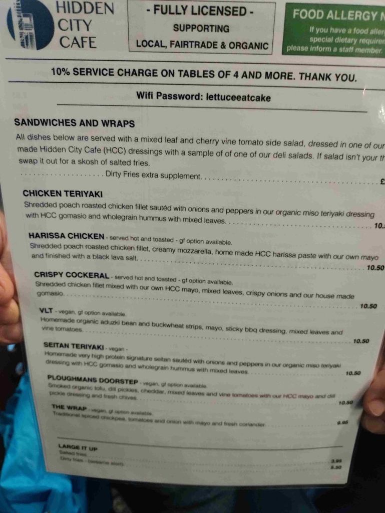 By now we are ready for a break and find an unusual spot called The Hidden City Cafe where we buy a sandwich and cake and a huge pot of Belfast tea. Some very unusual ingredients on the menu though like gomasio and seitan.