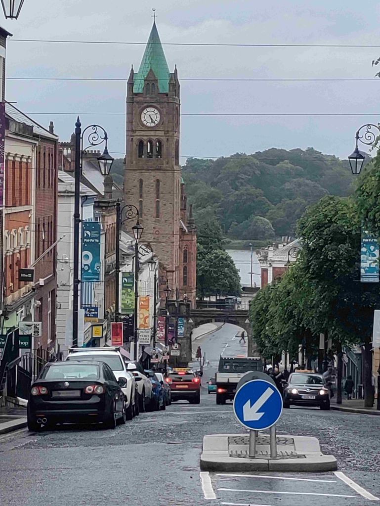 On arrival we march swiftly to the free shuttle bus which takes us to the centre of Derry close to the Guildhall. It’s now raining so we dart in for tea and toast in a little cafe called Cappuccinos.