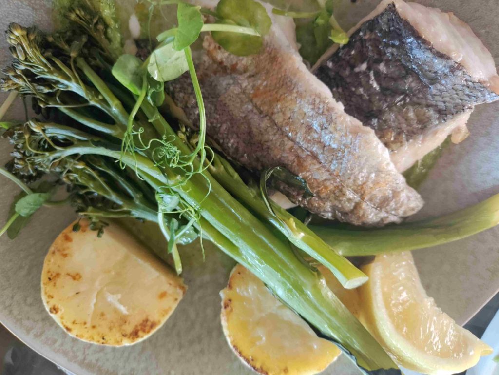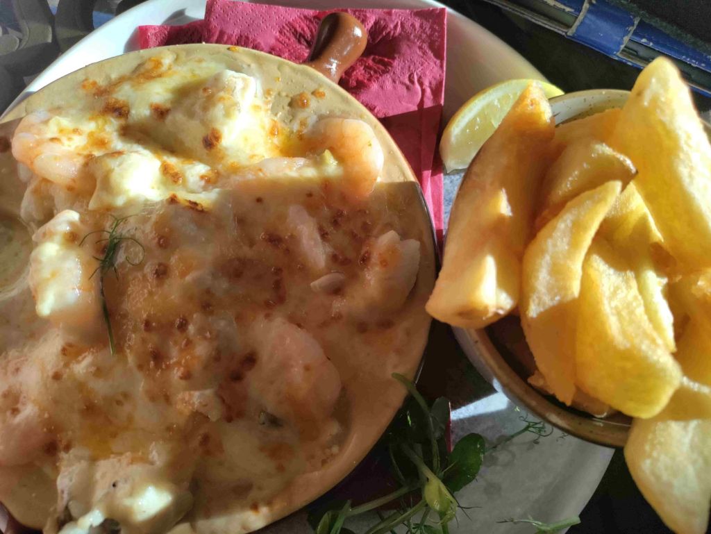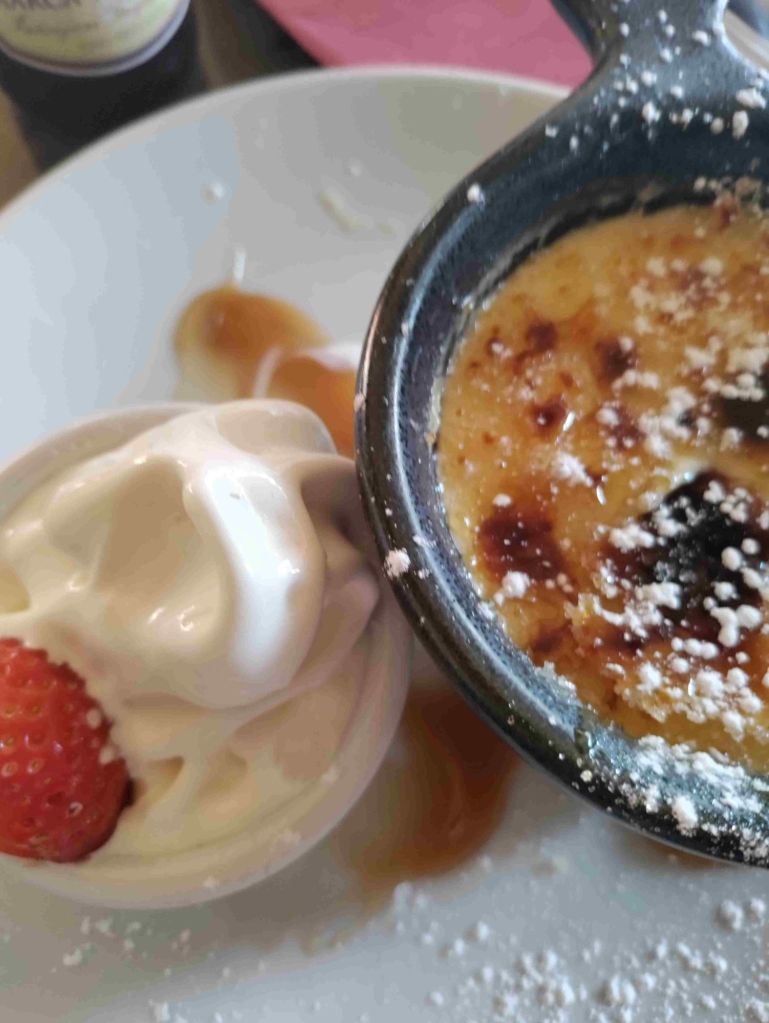 We decide as we’re so close to the sea we have to have fish again. I choose the daily market special Hake and Tony gets Monkfish and Prawns. We eat half each and they are both delicious but the monkfish is the winner. Follow it with a Creme brulé to share which is yum.
