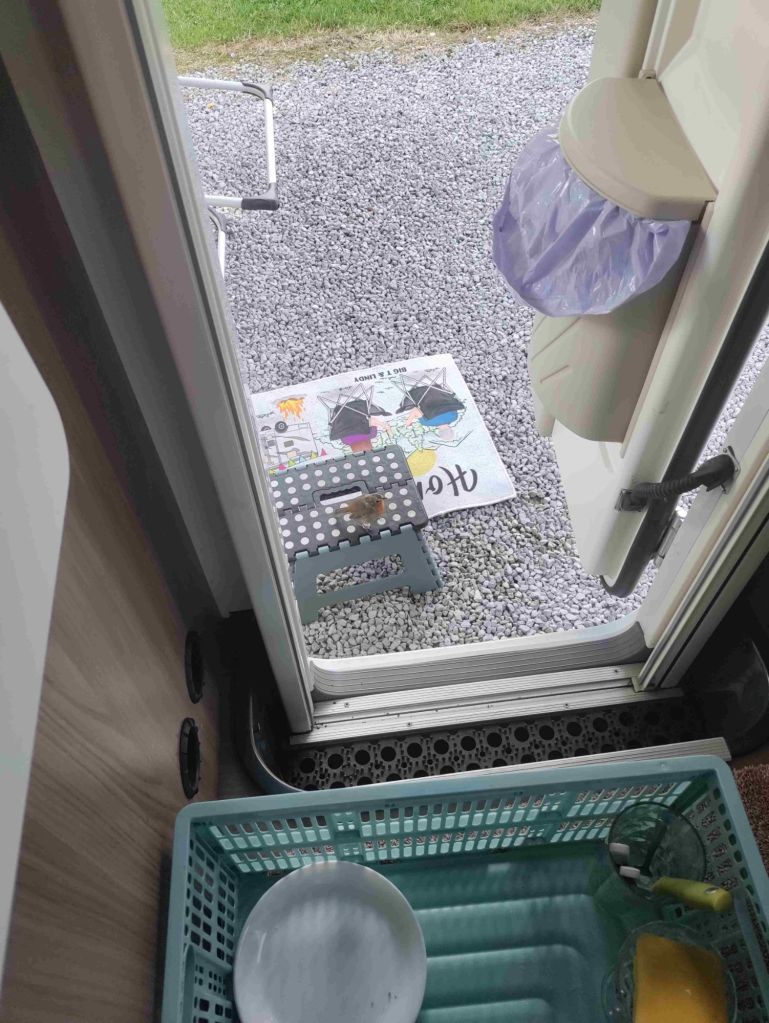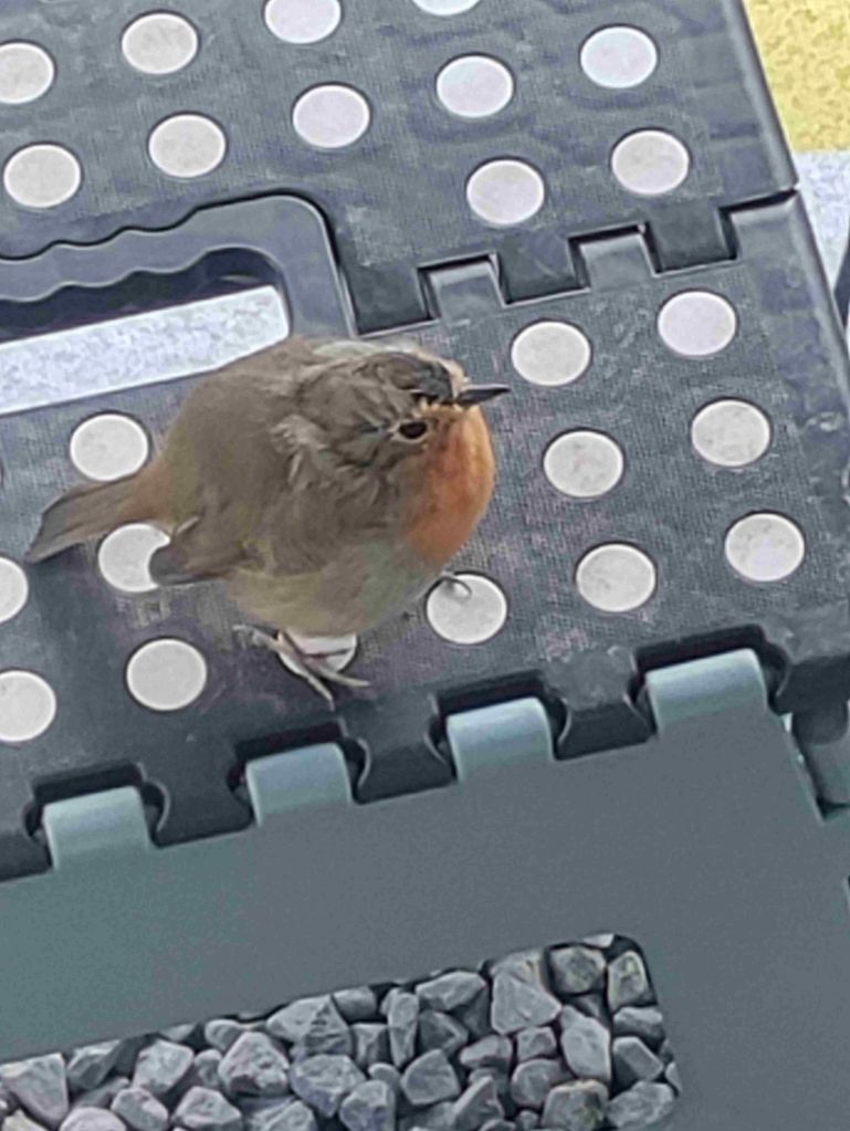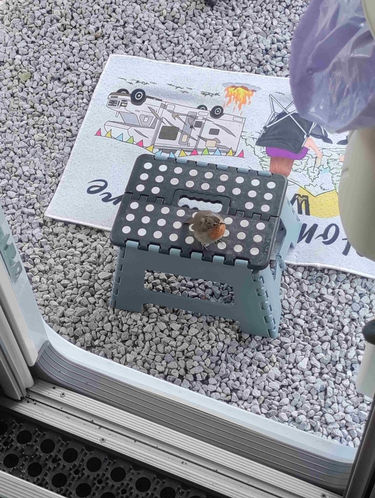 The sun is shining so we enjoy a cold beer and a snack sitting outside. We seem to have our own friendly pair of robins that are very unafraid sitting on the steps of the van and hunting for crumbs. At one point one of them flies into the van and T has to open a window to chase it out!