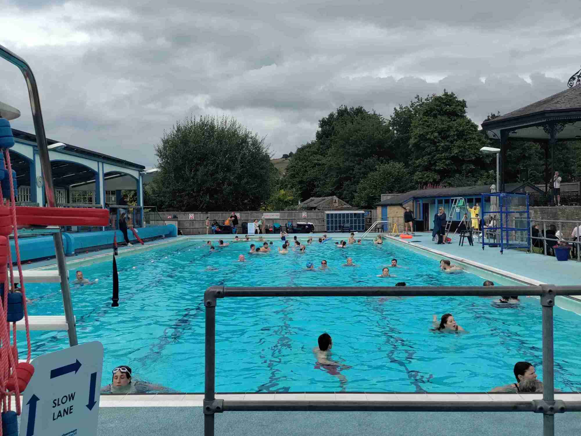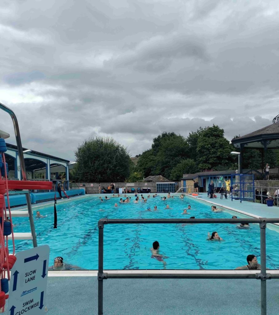 After Elijah’s nap we all get ready to go swimming! We’ve booked a session at a local open air swimming pool in a village called Hathersage about seven miles away. It’s the pools 88 th anniversary today. It’s now grey overhead but the threatened rain hasn’t arrived and it’s still warm.
