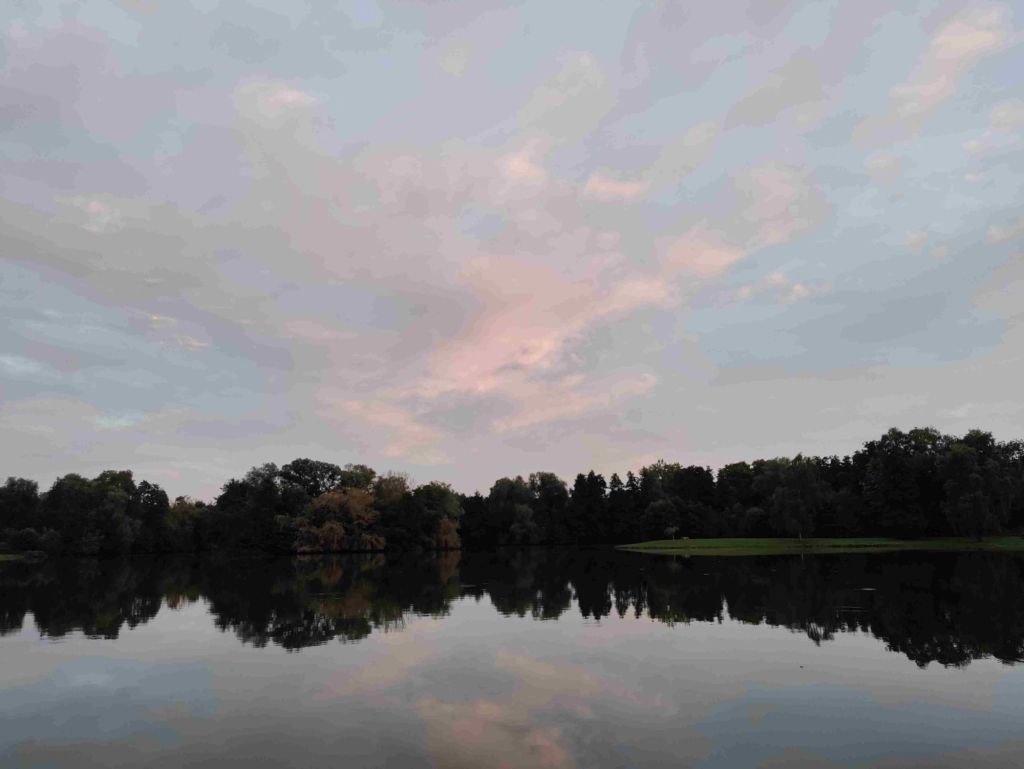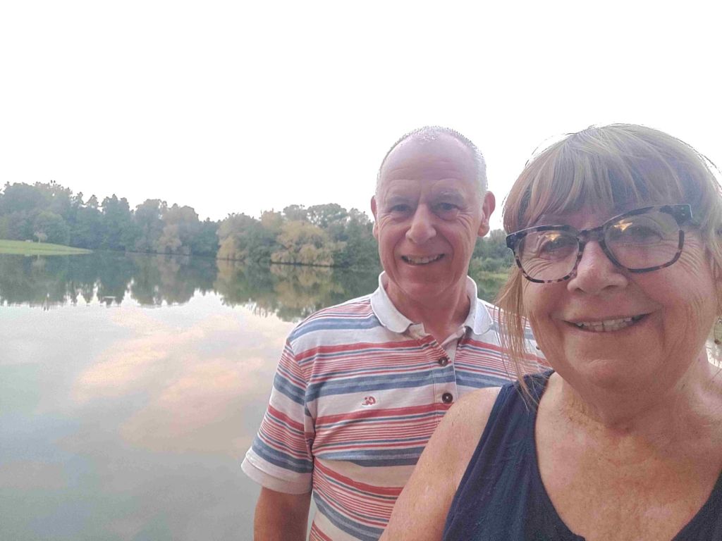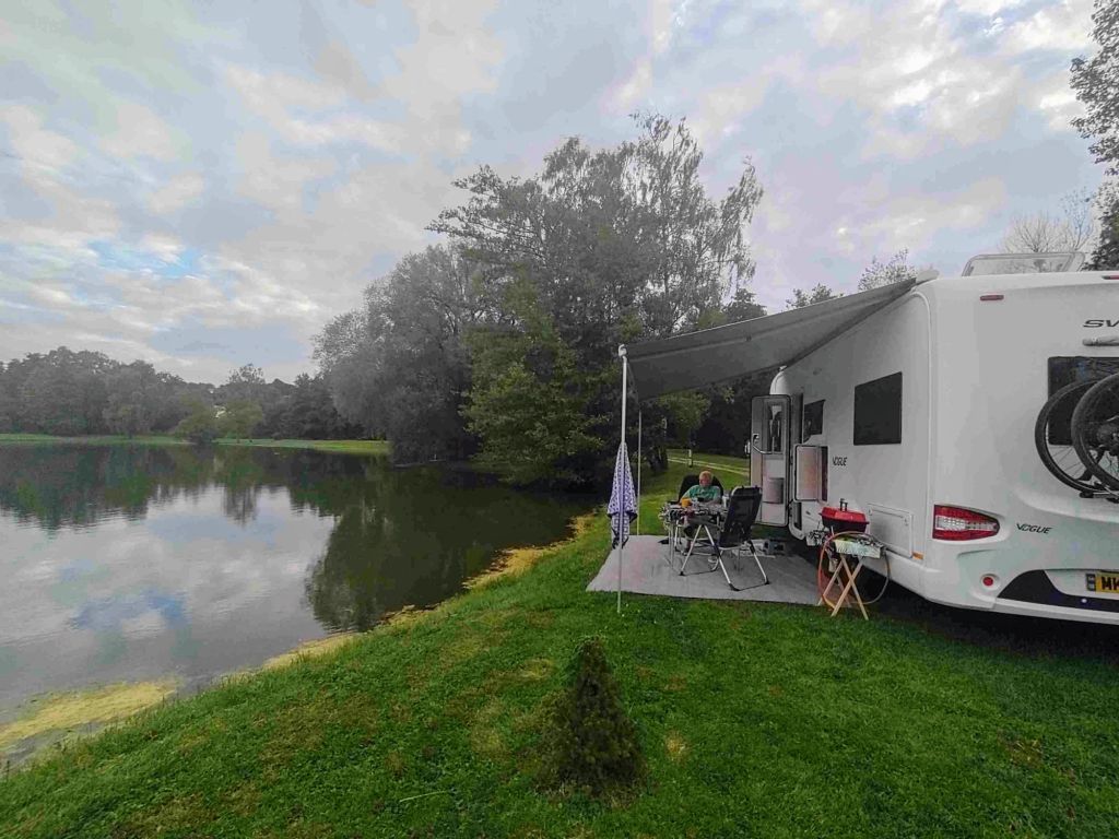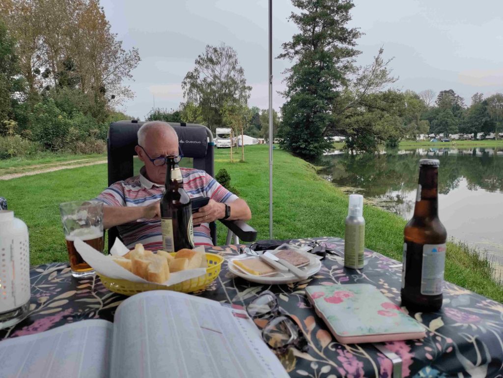 It’s now six pm so we set up on our lovely lakeside pitch and break out a couple of beers and the binoculars and enjoy pate on a fresh baguette. It’s overcast but warm and the view is fab. T sees an otter but I miss it but there’s plenty of interest on the lake with fishermen, a heron successfully catching and gobbling a fish, grebe, coots, pond skaters and dragonflies.