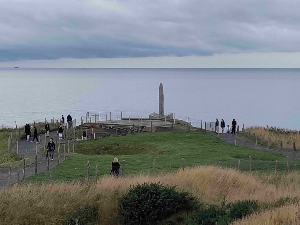 A monument to the rangers of a granite dagger stands on a bunker overlooking the cliffs below.
