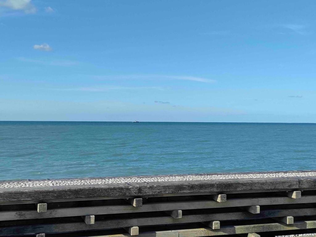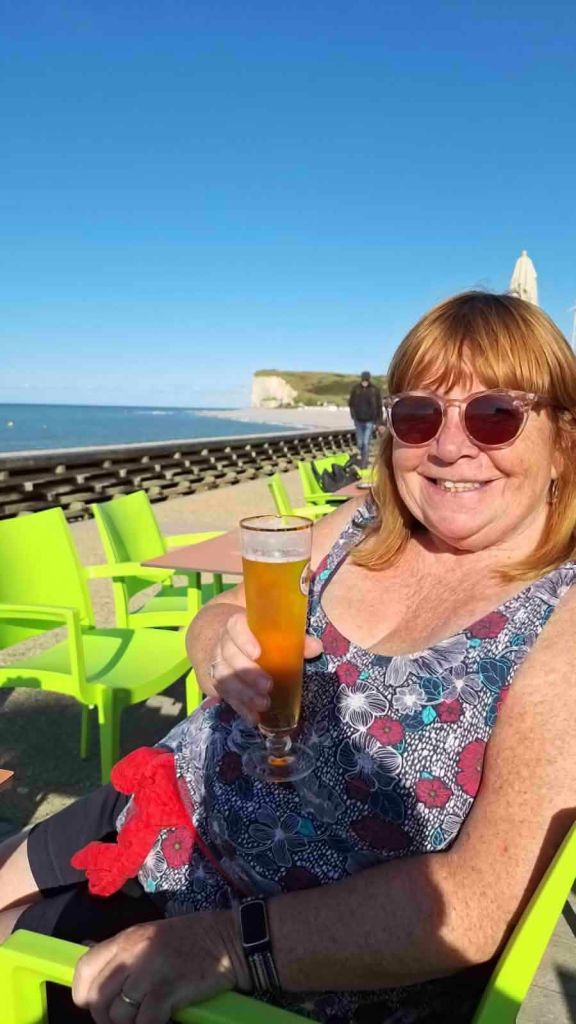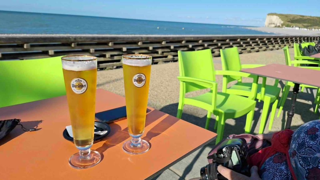 We stop for a beer overlooking the beach and sea. It’s warm enough without long sleeves which is a nice change.