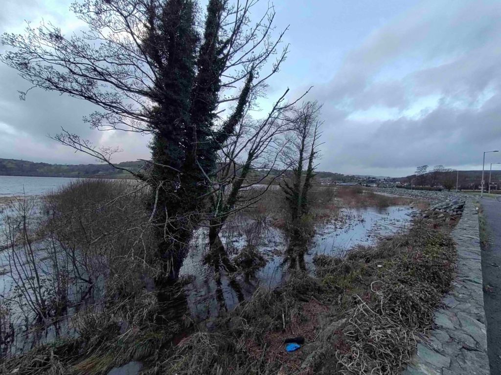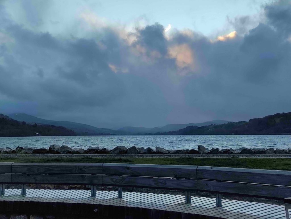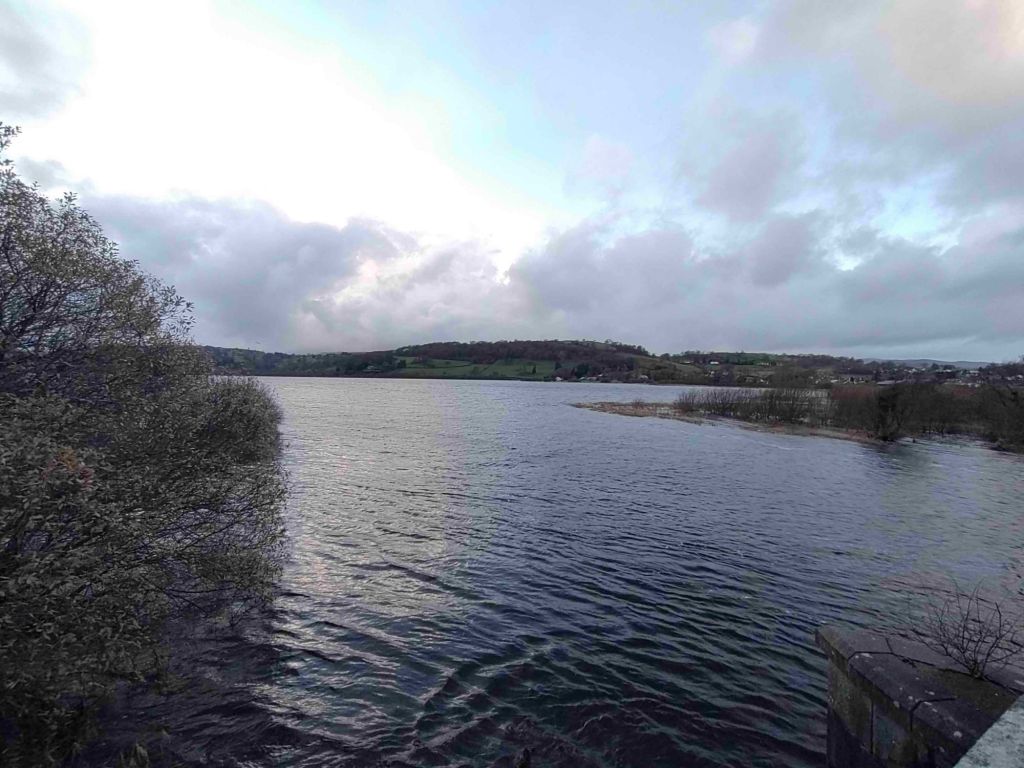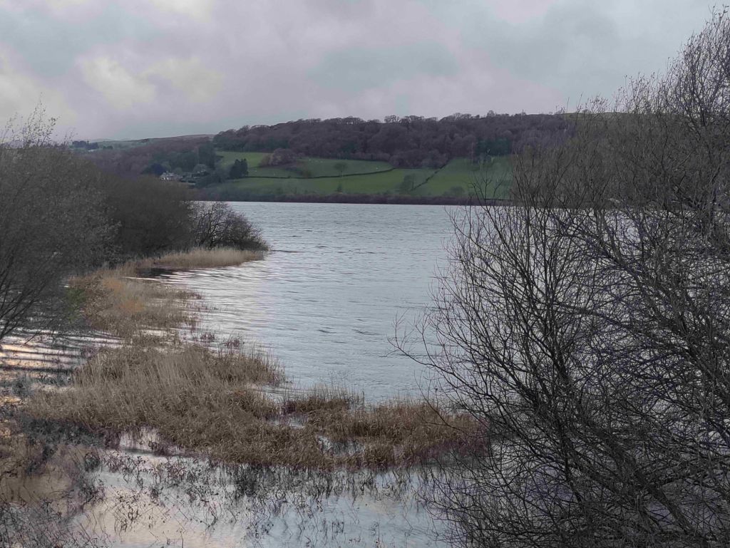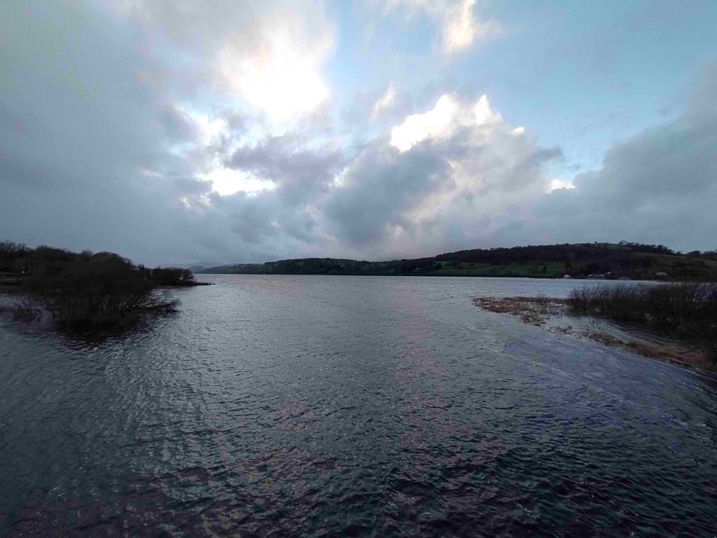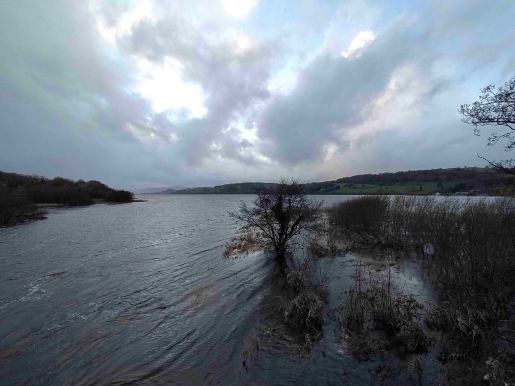 The lake is incredibly full with trees near the waters edge standing in a couple of feet of water. No surprise considering the recent storm and heavy rains. The skies are grey and overcast with the odd shaft of blue poking through.