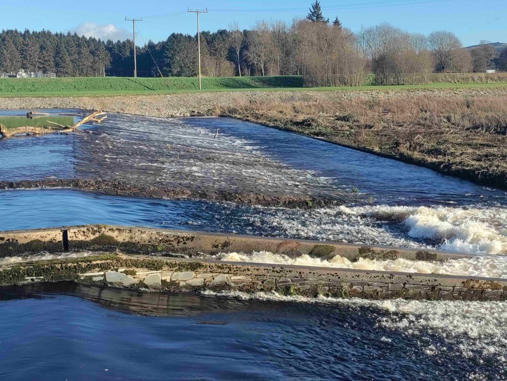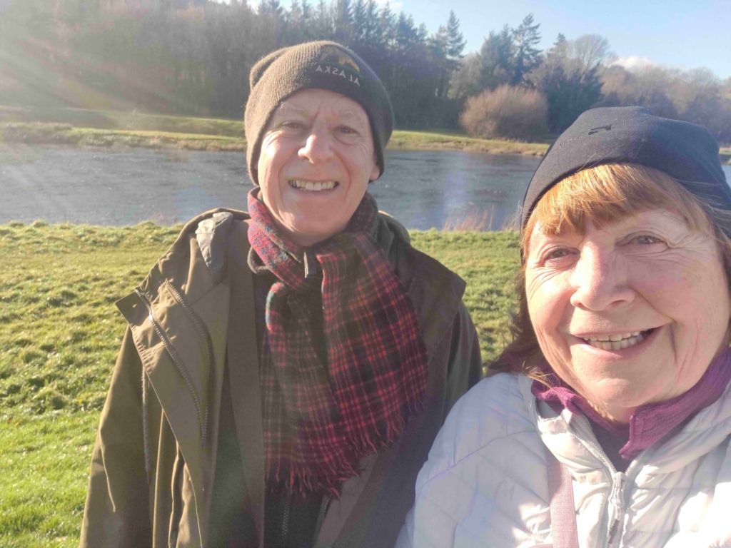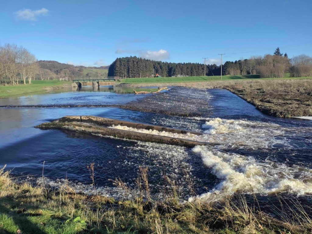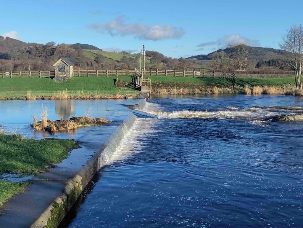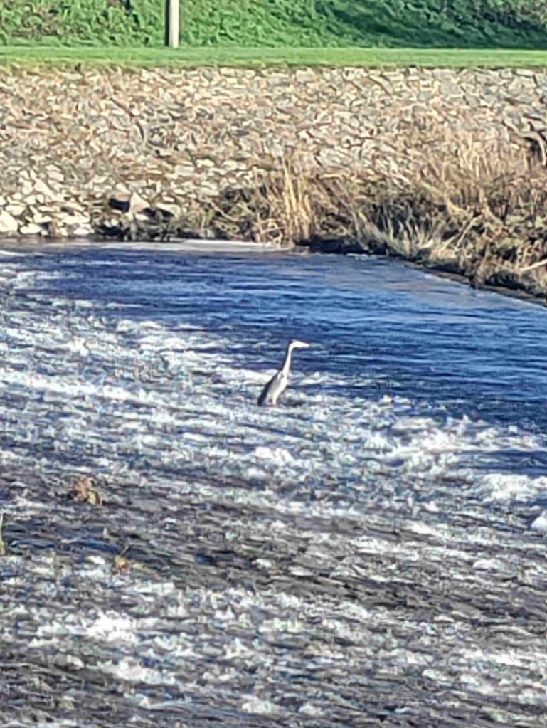 The start runs along a paved dyke next to the River Dee past multiple weir’s and various sluice’s and flood defences. The river is very high but hasn’t spilled over. The defences were all renewed and updated in 2023. We are excited to see a large grey heron standing to attention in the weir.