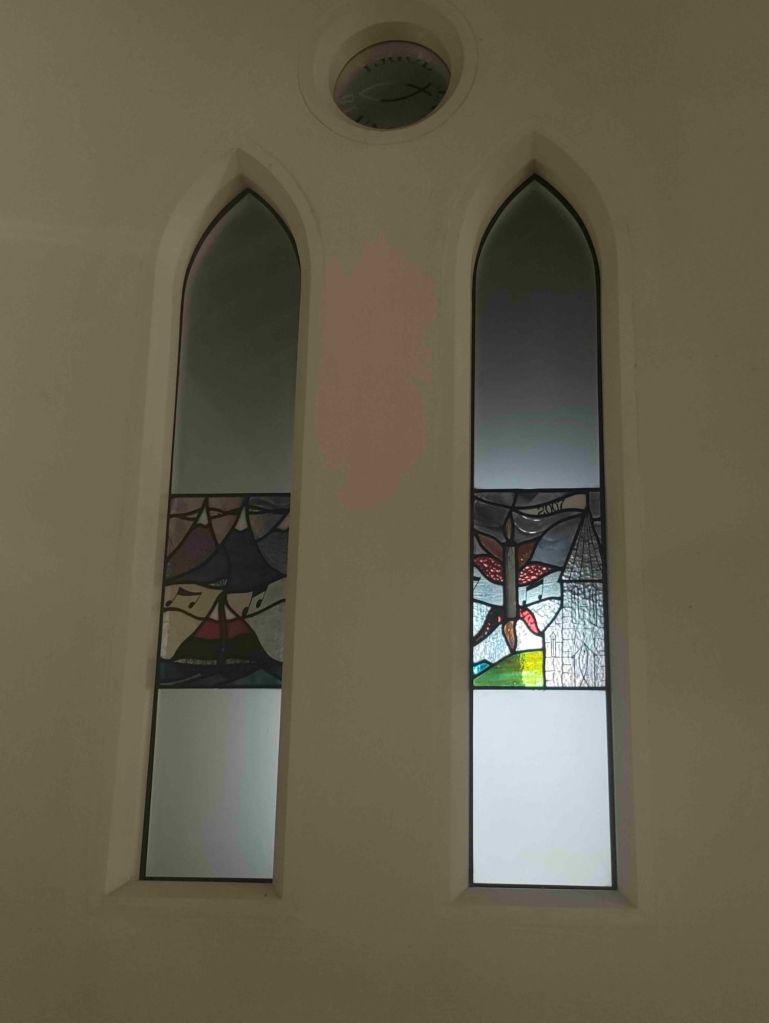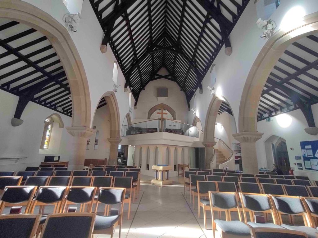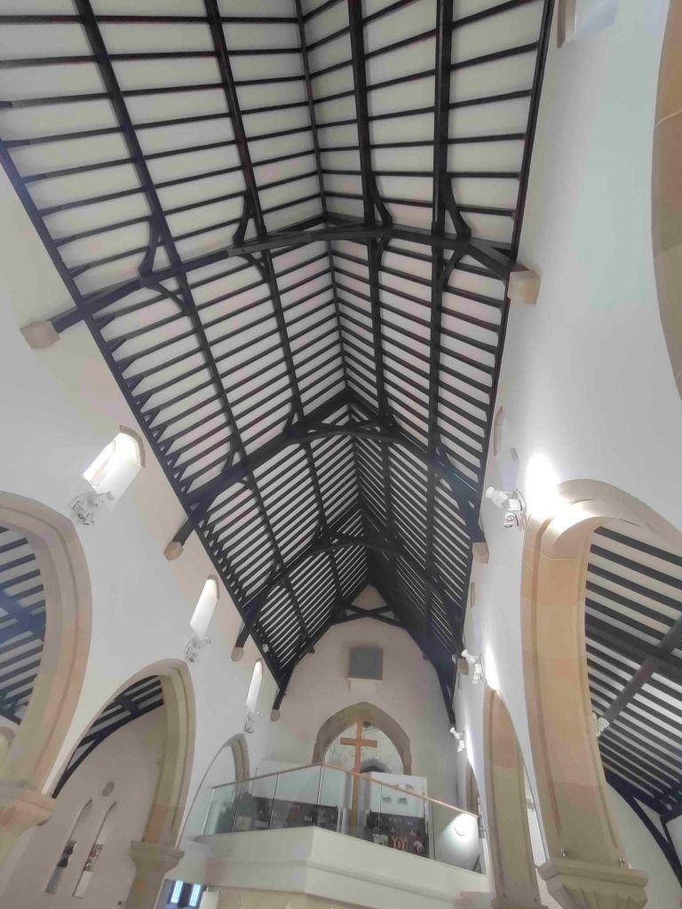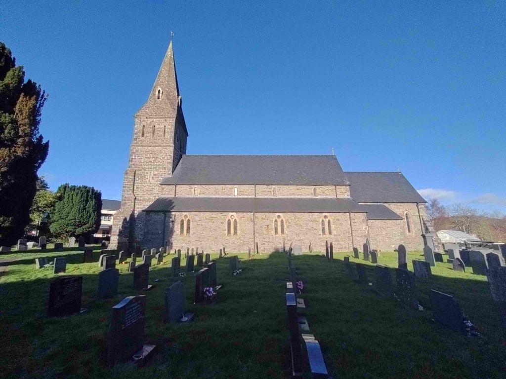 We leave the river and land basically at the top end of Bala high street. We spot a church and graveyard behind the high street and decide to visit. Christ Church is locked but in the graveyard we bump into the very friendly church warden who invites us in for a look around inside. It’s a beautiful space blending original and modern with a gorgeous timbered ceiling.