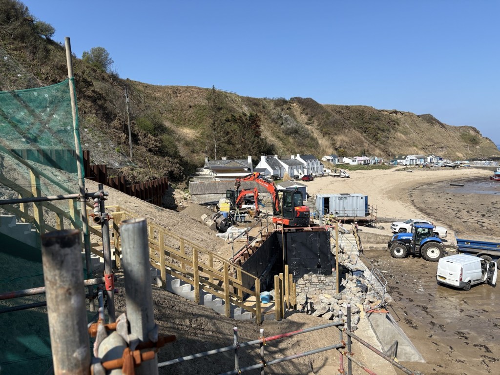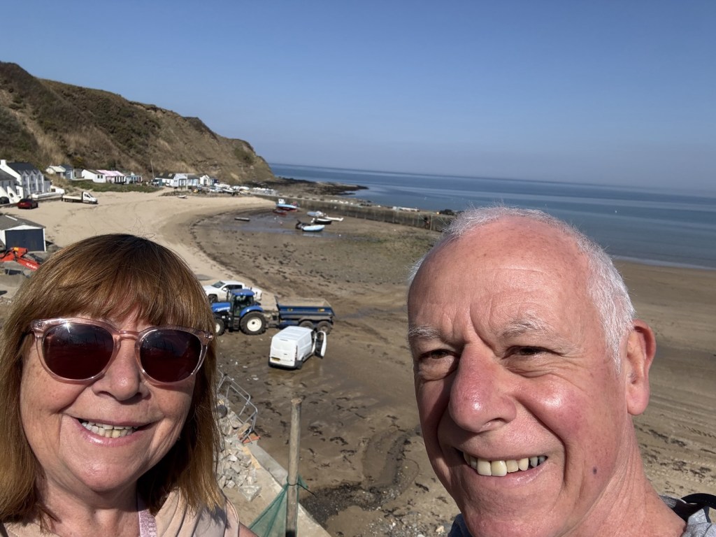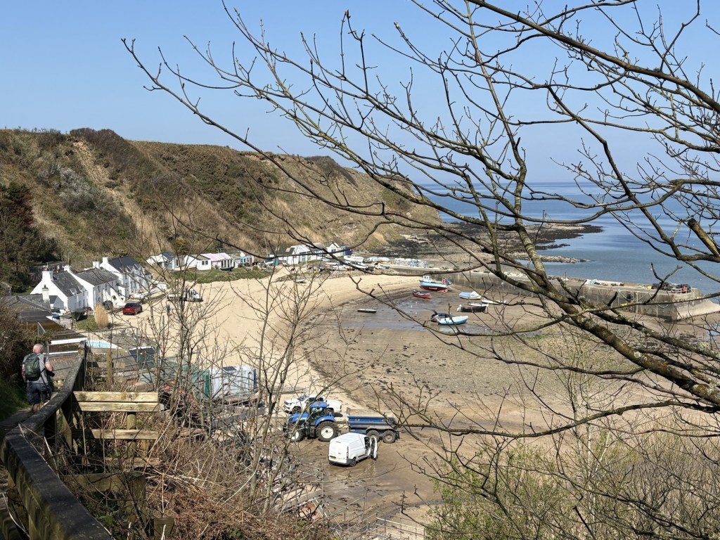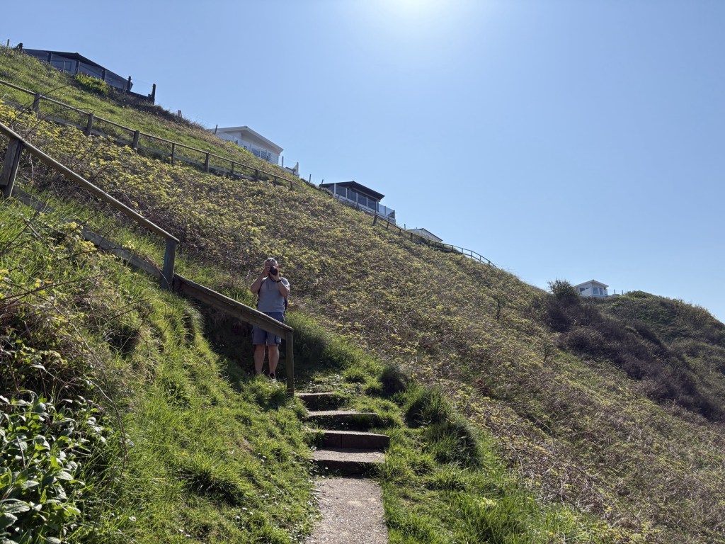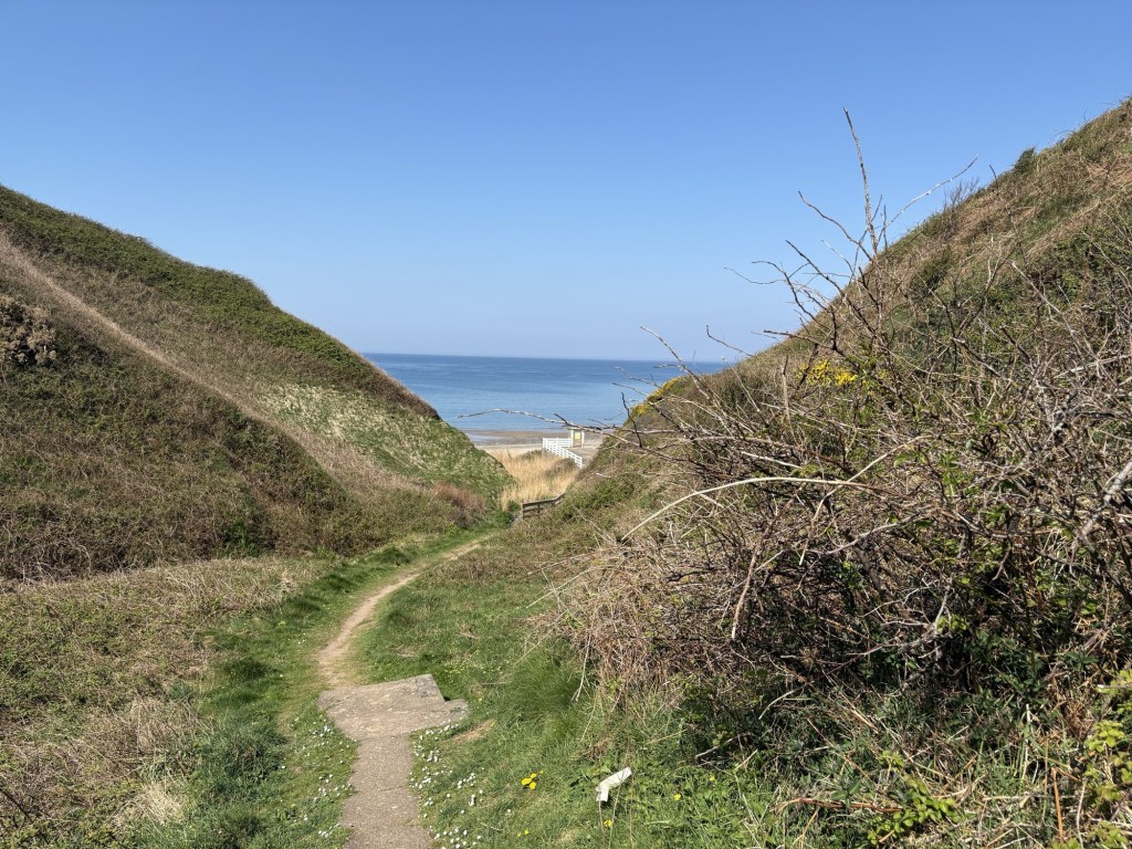 We pass the cute duck pond and are very soon at the coast. The cliffs to our left are slipping and being pinned so the route to the beach is a scaffolding staircase that’s feels rather rickety. I hold on tight thinking of the people I know who would not make it down here!