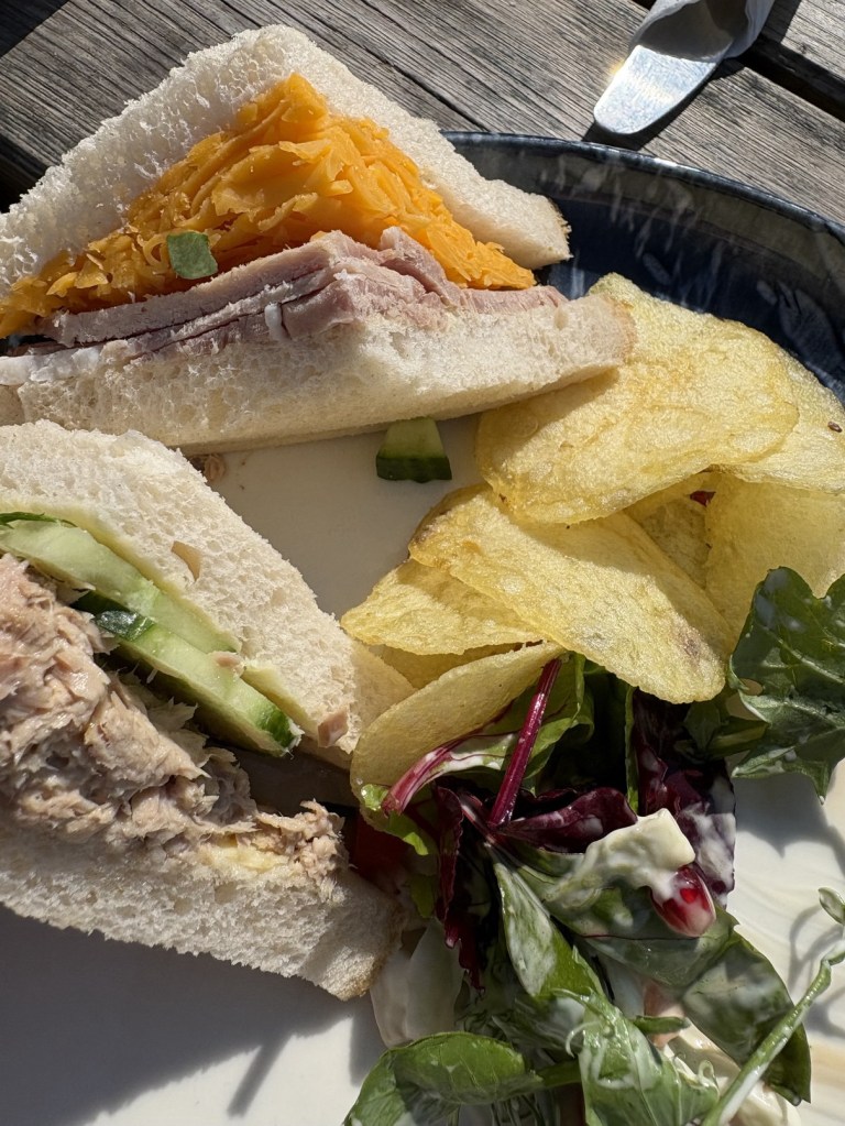 Sitting outside in the sunshine eating delicious sandwiches is a lovely way to do a late lunch.