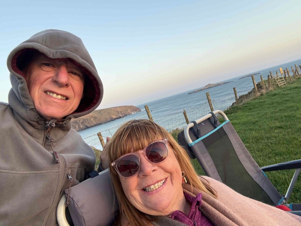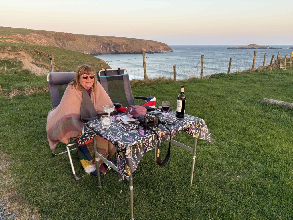 It’s colder now as the sun is setting so we wrap up well to sit outside and watch the sun go down.