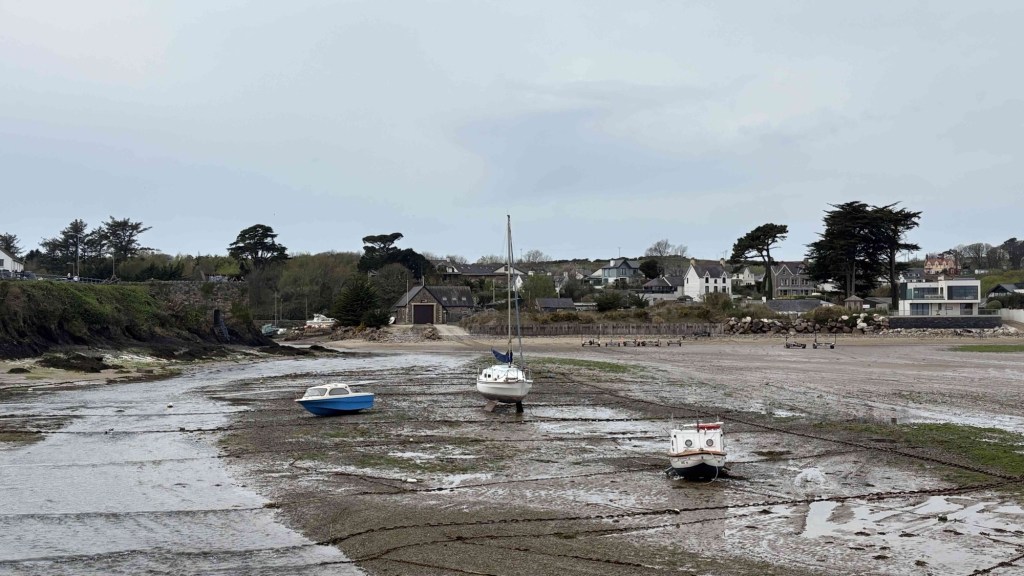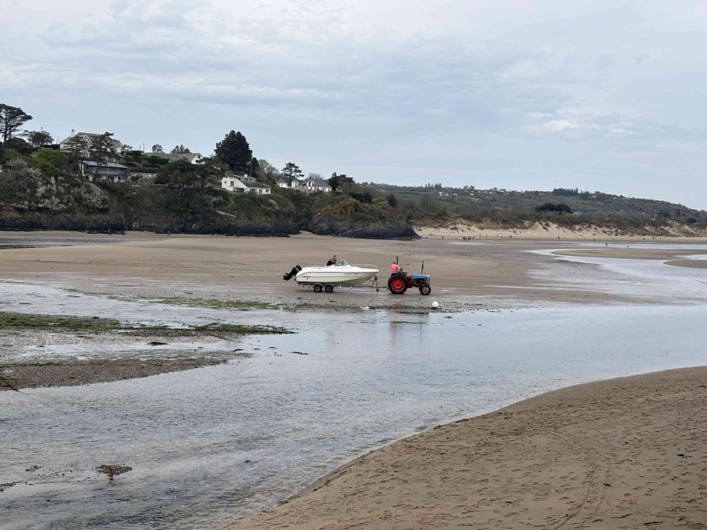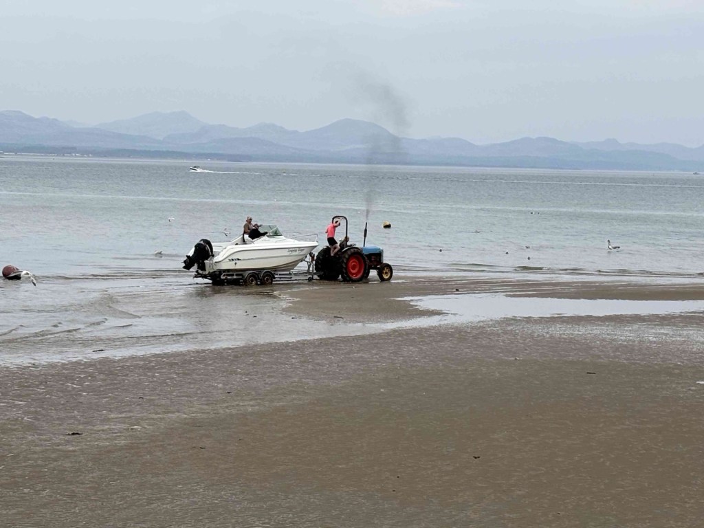 We walk down to the beach around midday. The tide is out and the sand is very wet and spongy. A tractor pulling a boat in a trailer has to drive quite far out to launch it.