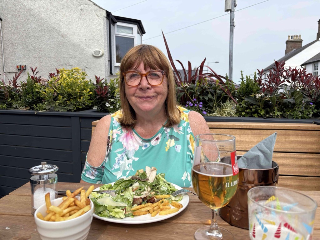 We enjoy a lovely lunch sitting outside the St Tudwals Inn mostly in the sunshine. A final drink in the Vaynol before heading back to the van in time to miss the rain, just after 4pm.