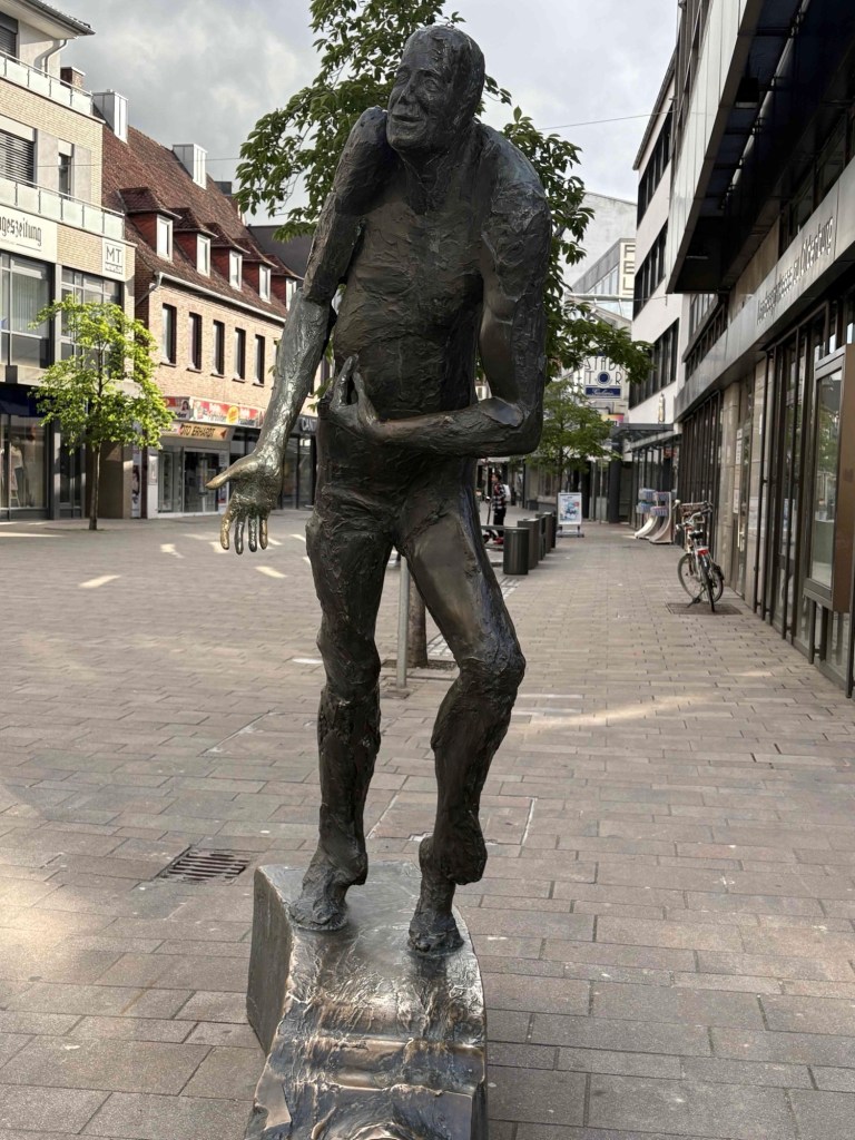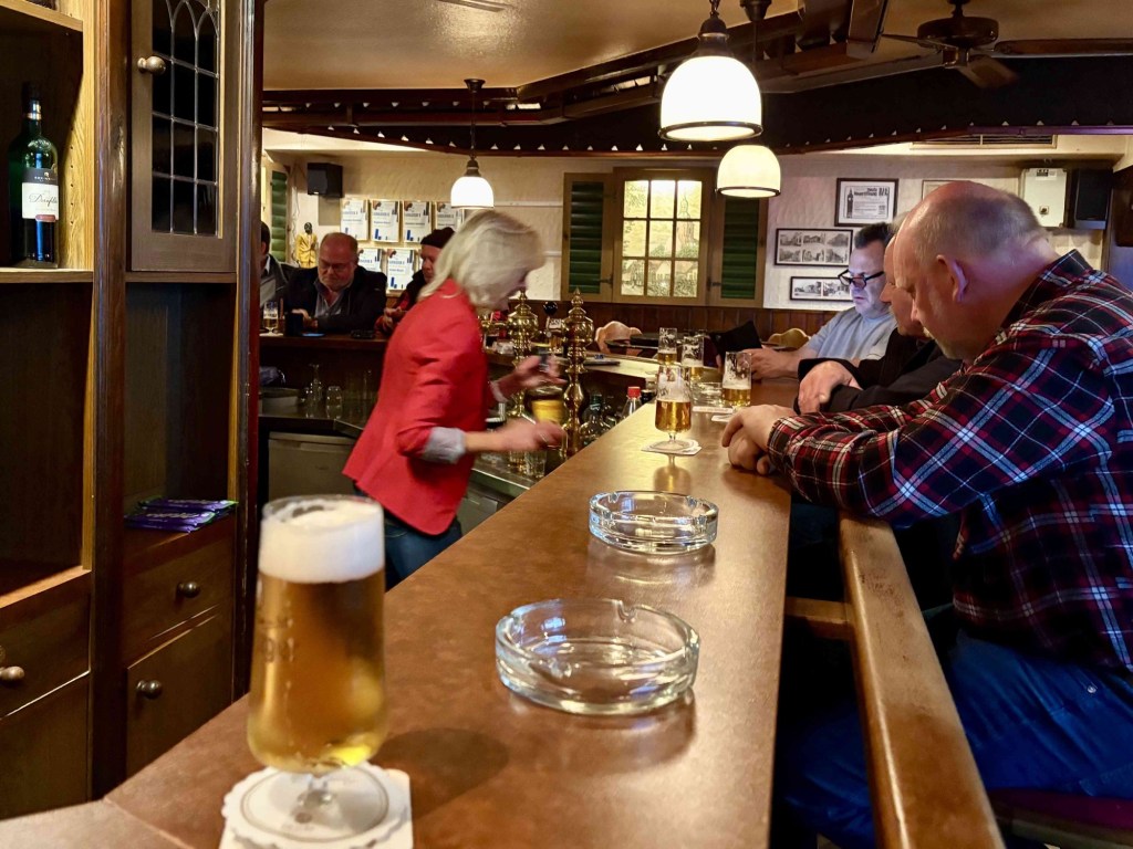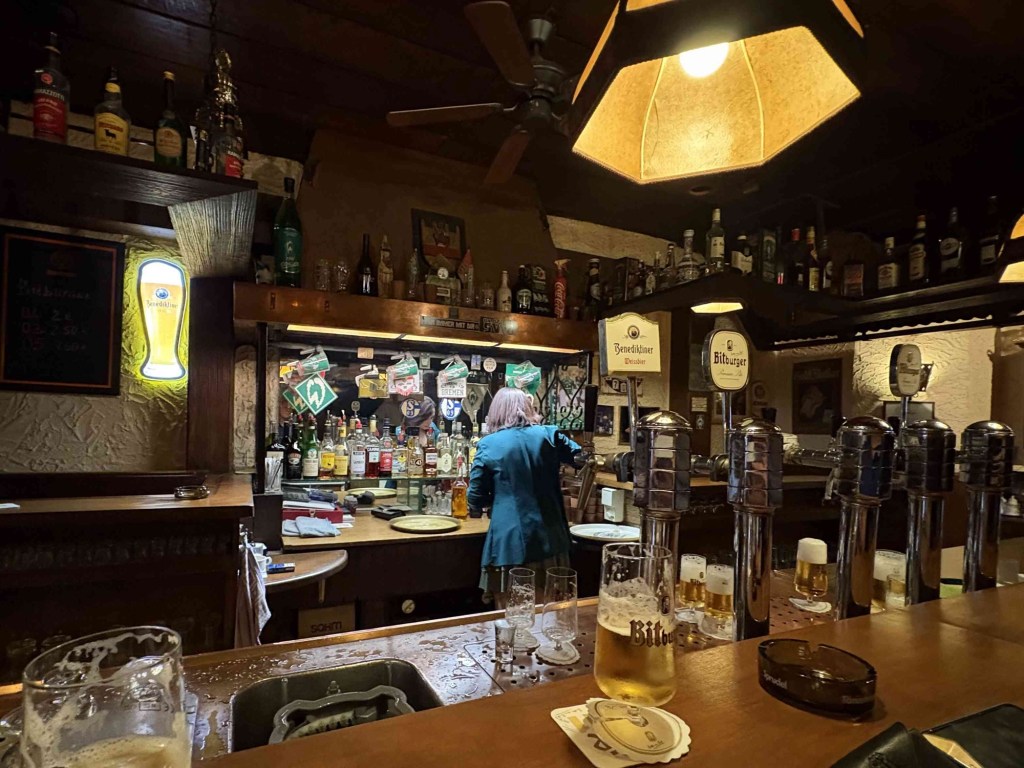 Around 6:30pm we go out to explore Cloppenburg. It has a new town sixties feel to it at least the bit we see. We find a pub literally called Bierhaus and sit at the bar. It’s full of smokers which feels weird and we try a small glass of Bitburger Pils which is very nice. It takes an age to pour the beer as it’s very frothy. Lots of people, mostly men, are playing a dice game we discover later is called Schock. After a second slightly larger glass of pils we wander out thinking of food.