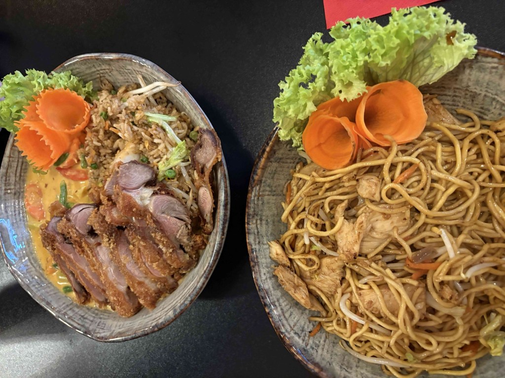 We enjoy a delicious meal of spring rolls, chicken noodles and crispy duck and red thai curry and rice with food to take home!