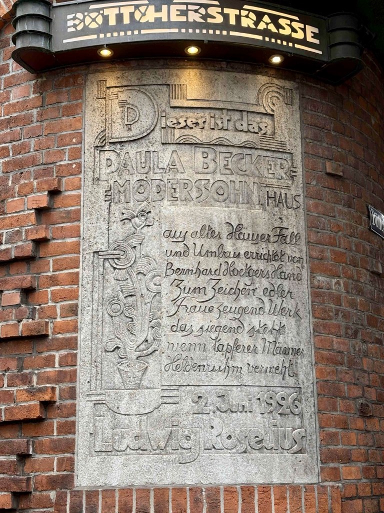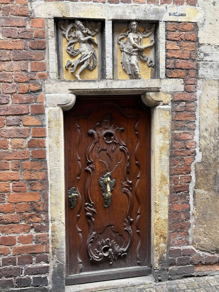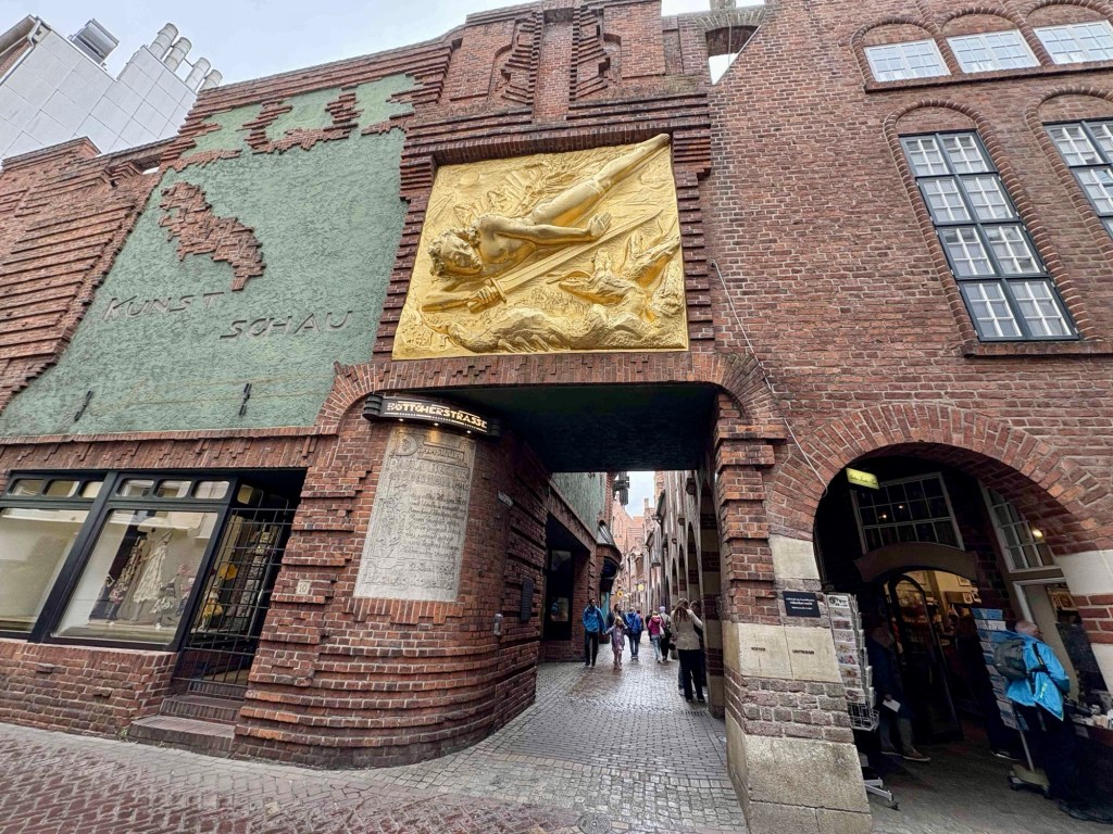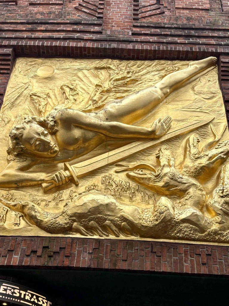 Raincoat’s on again we wander down Böttcherstraße a street full of gorgeous old buildings with a massive and beautiful gold coloured relief over the entry archway. Made by German sculptor Bernhard Hoetger in 1936 and dedicated to Hitler, it was accompanied by the words now removed, “Our leader’s victory over the powers of darkness”.
