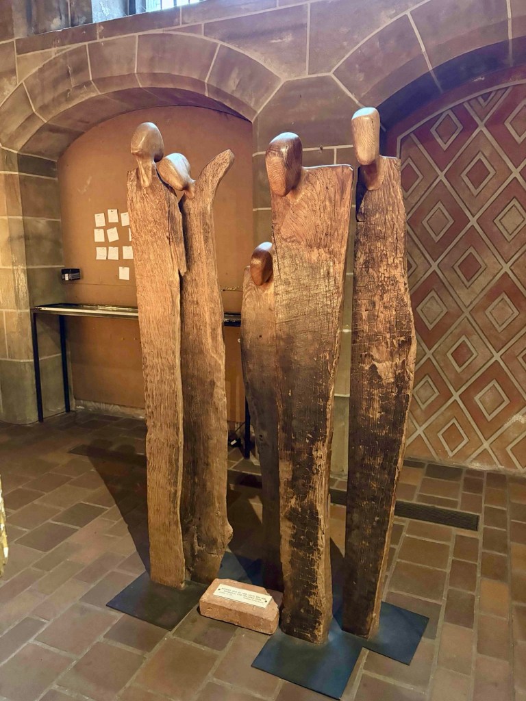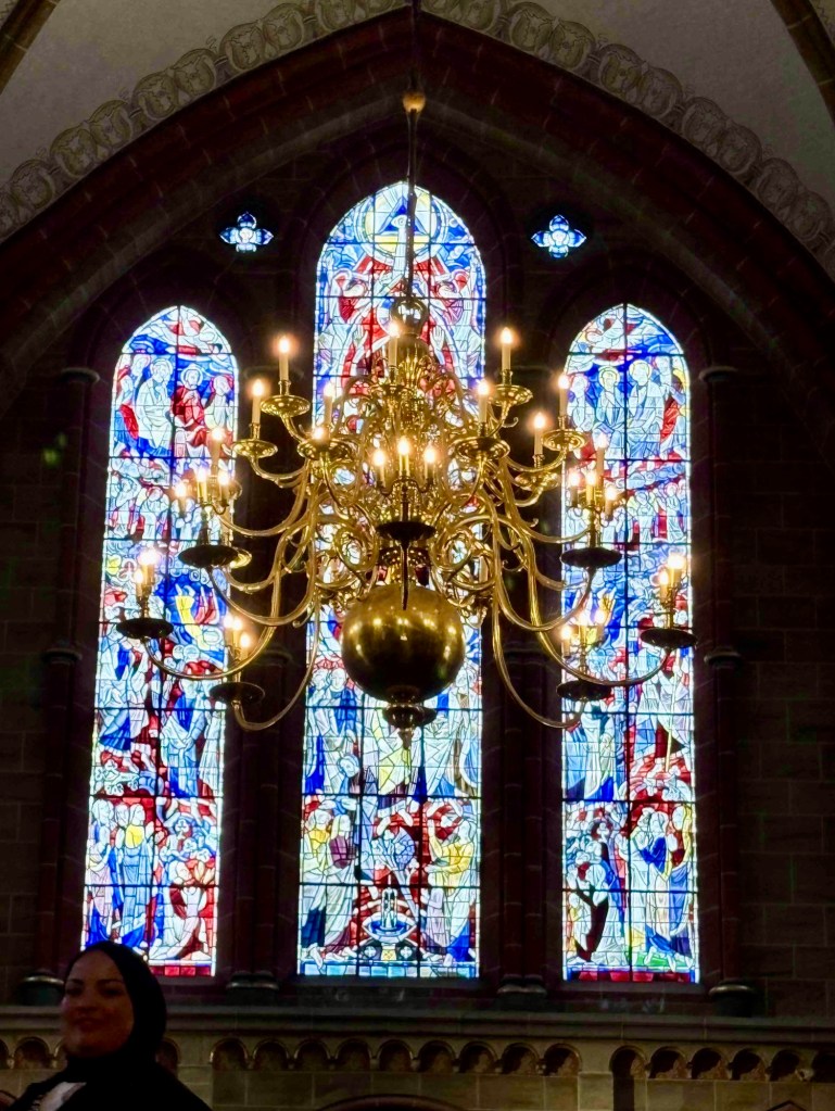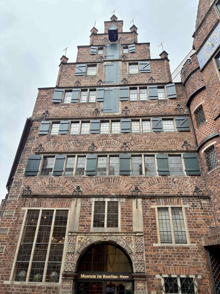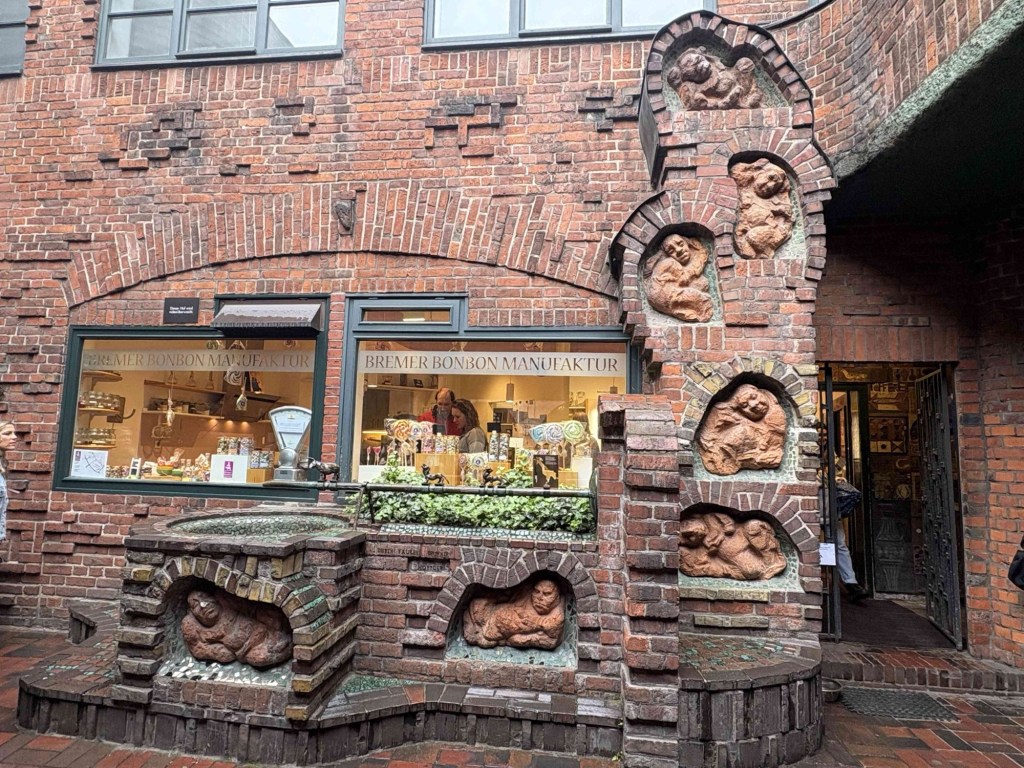 Raincoat’s on again we wander down Böttcherstraße a street full of gorgeous old buildings with a massive and beautiful gold coloured relief over the entry archway. Made by German sculptor Bernhard Hoetger in 1936 and dedicated to Hitler, it was accompanied by the words now removed, “Our leader’s victory over the powers of darkness”.