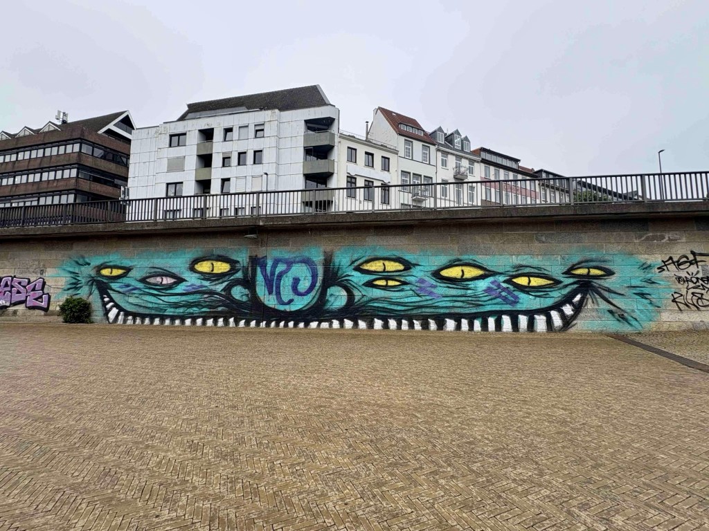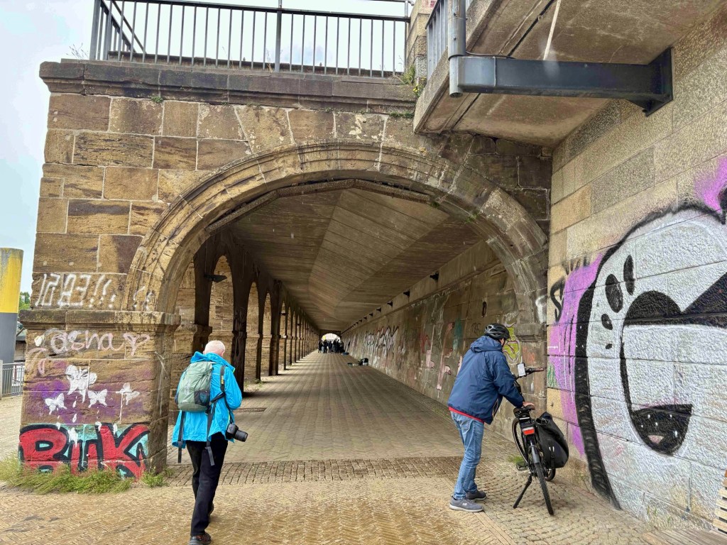 Once across the river we walk along the Weser promenade towards the historic centre of the city. The promenade is lined with graffiti. Stop for a video call with Rach and Elijah. We are entertained by our grandson chomping on a massive piece of watermelon almost as big as his head!