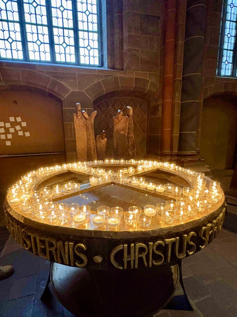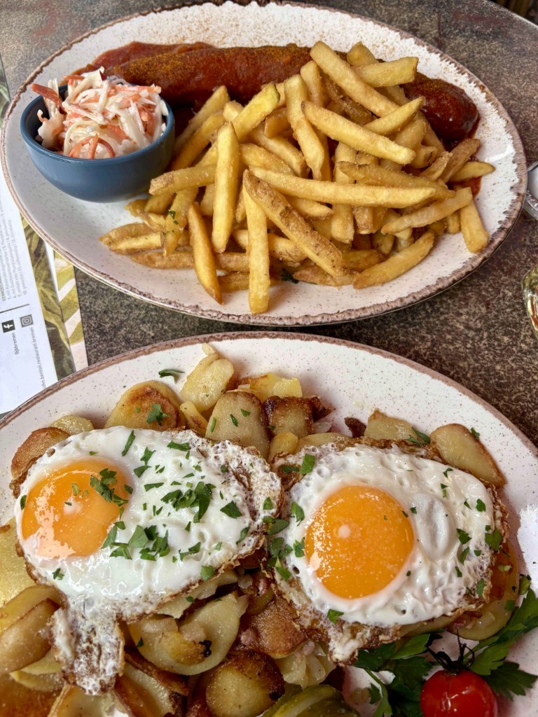 After a wander around the cathedral we sit in the square and enjoy an early dinner. I have Bratkartoffeln, fried potatoes with bacon and eggs and T enjoys Currywurst. It’s started raining more heavily now so we go inside the bar to finish our drinks.