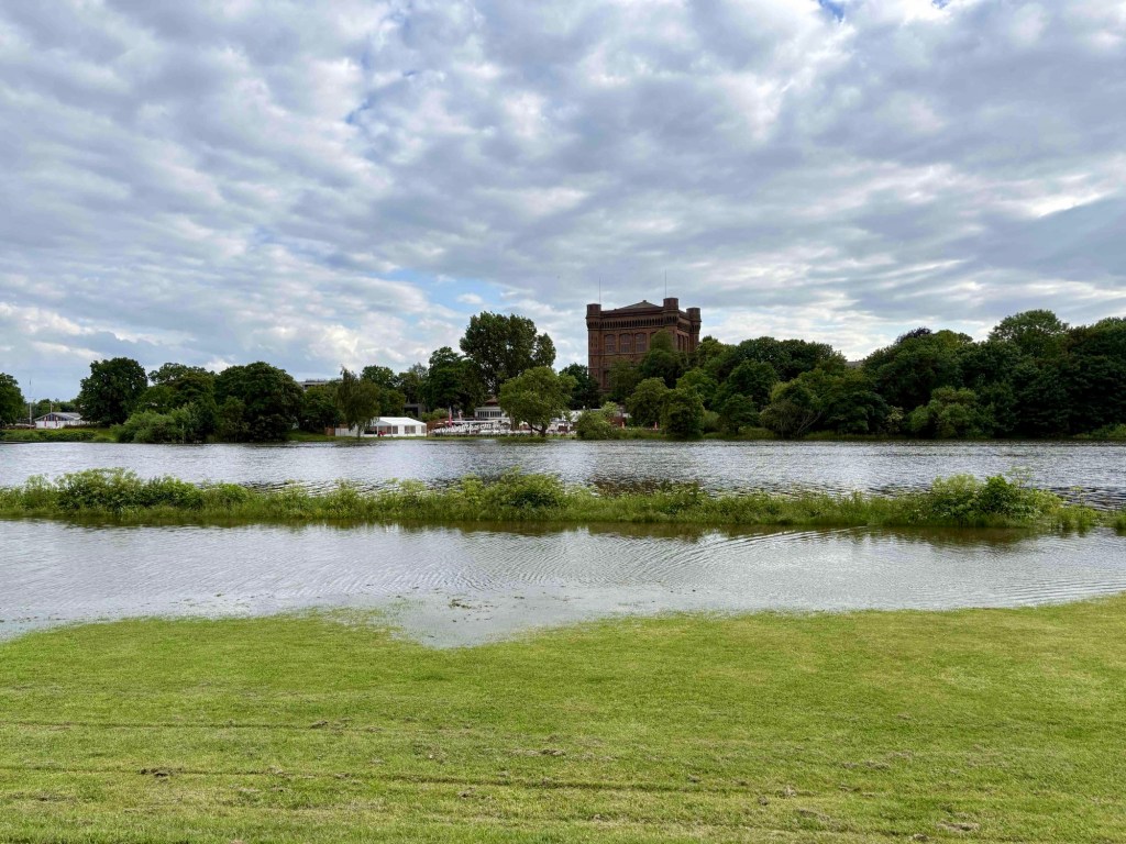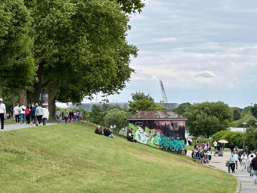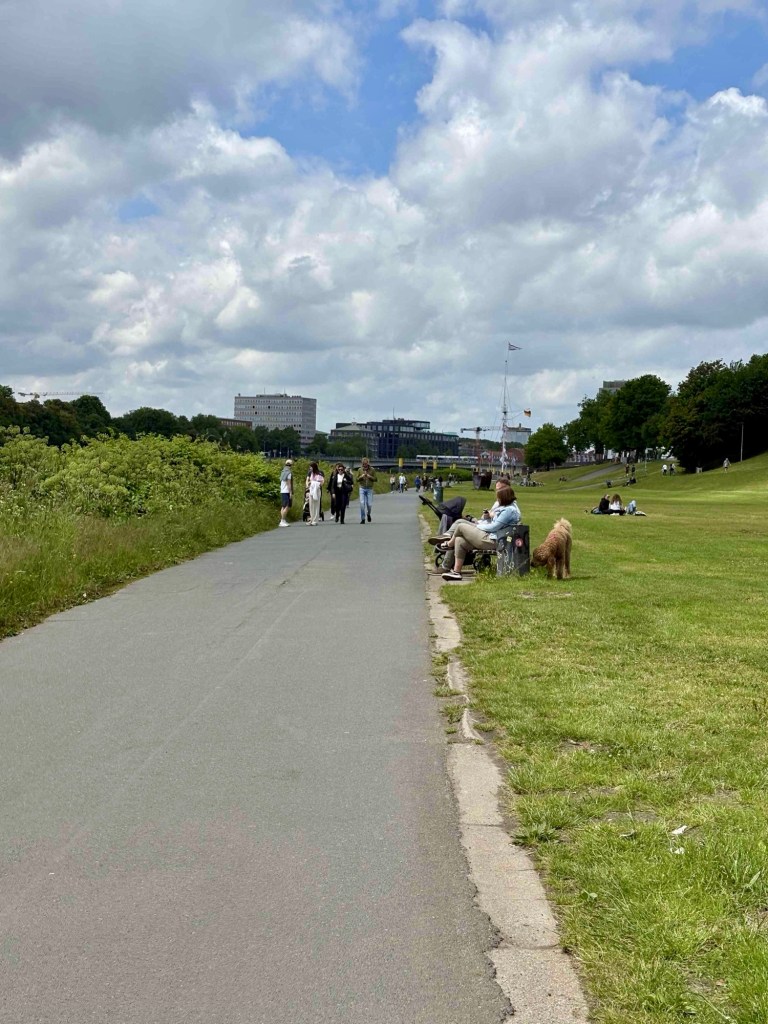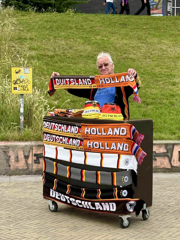 The path along the river is rammed with football supporters. The penny drops. Germany’s women are playing the Netherlands at Bremen’s Weserstadion which is visible a little down the river.
