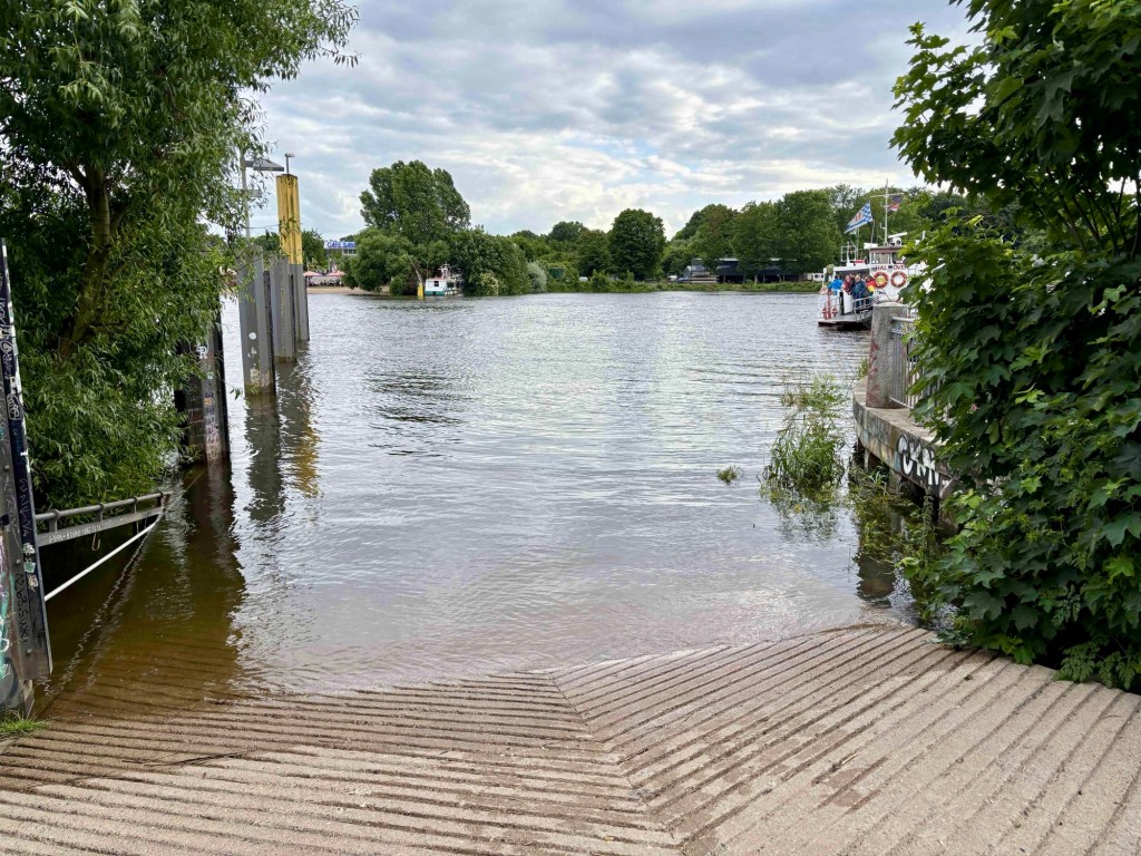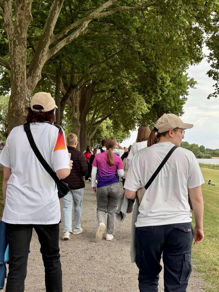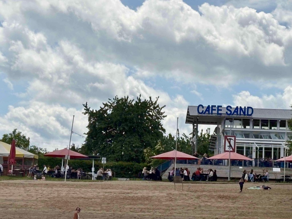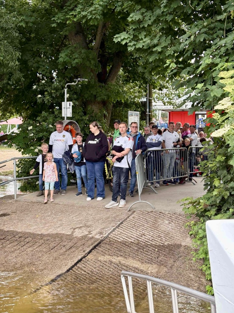 The path along the river is rammed with football supporters. The penny drops. Germany’s women are playing the Netherlands at Bremen’s Weserstadion which is visible a little down the river.
