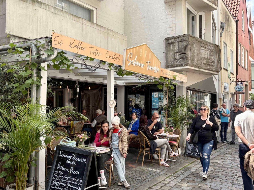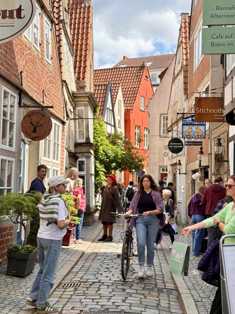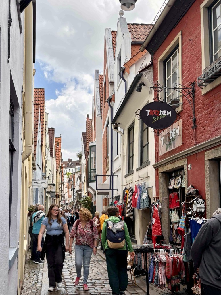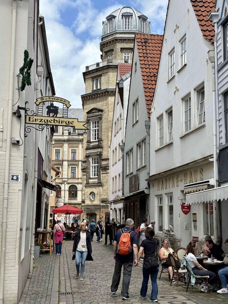 We take the tunnel to the Schnoor (string) Quarter, Bremen’s oldest district with a maze of tightly packed houses on narrow streets full of shops, galleries and cafes. It’s bustling and vibrant.