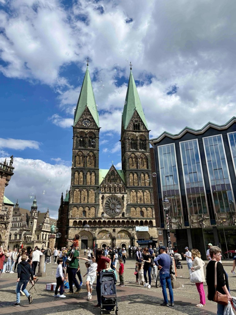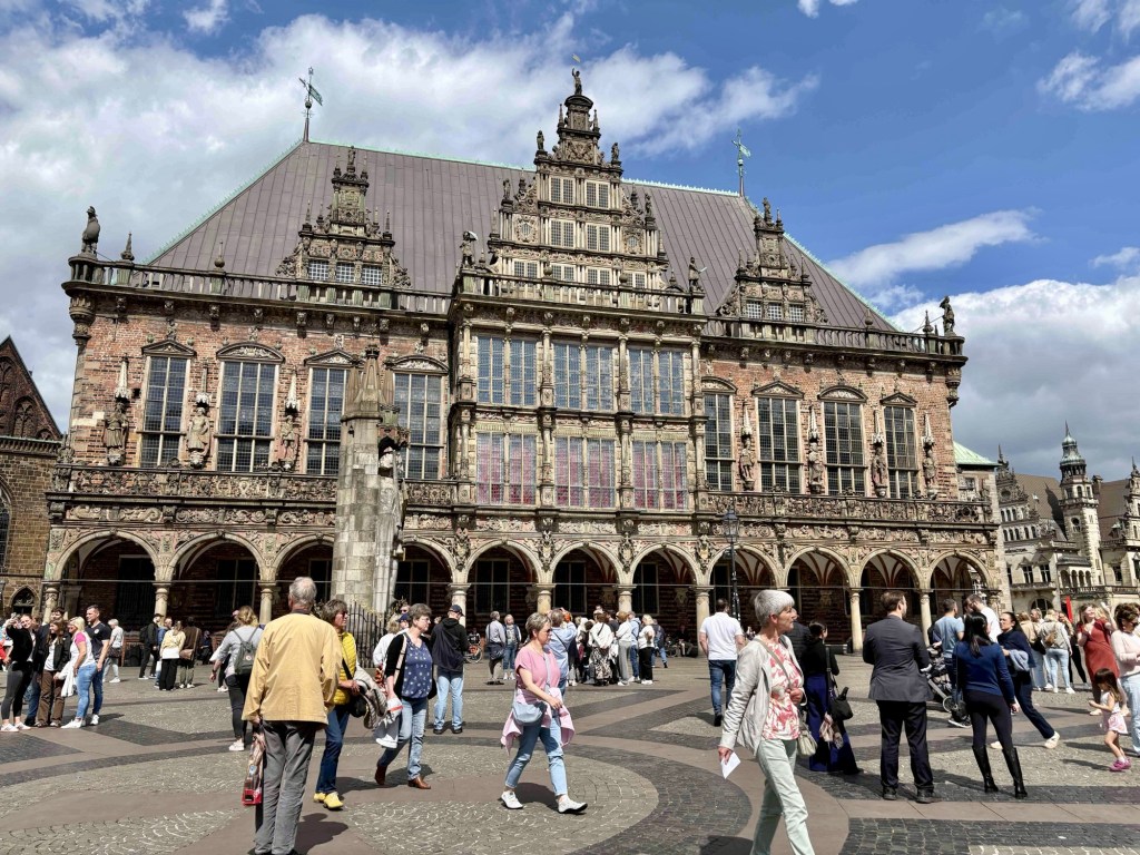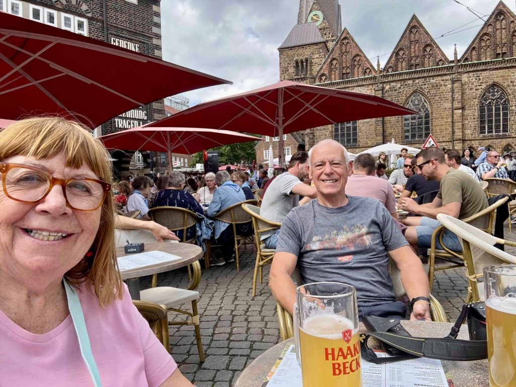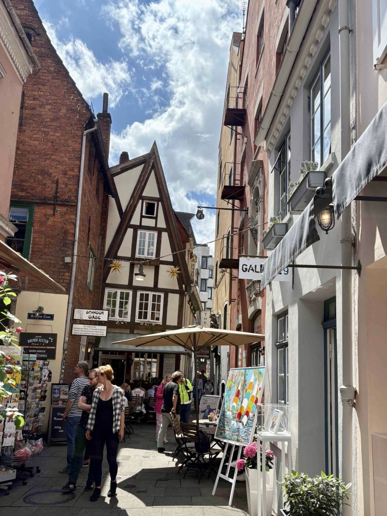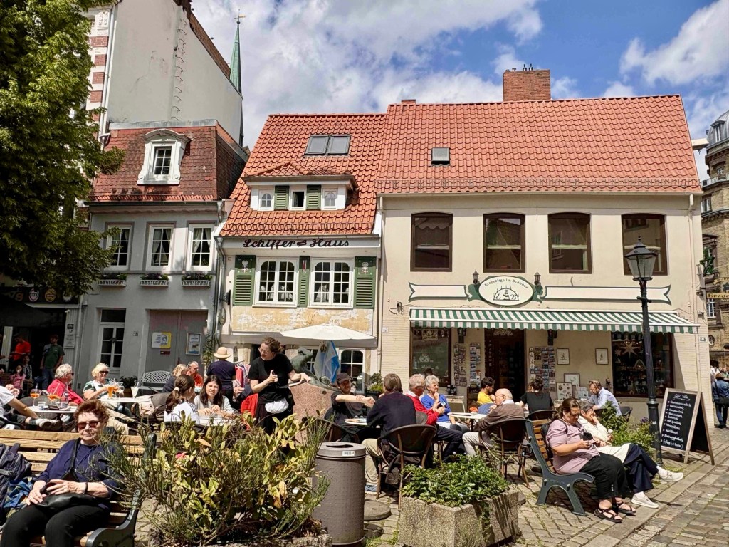 We take the tunnel to the Schnoor (string) Quarter, Bremen’s oldest district with a maze of tightly packed houses on narrow streets full of shops, galleries and cafes. It’s bustling and vibrant.