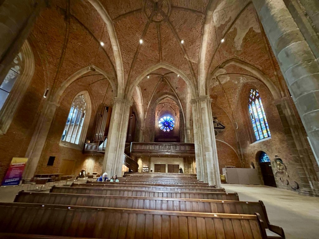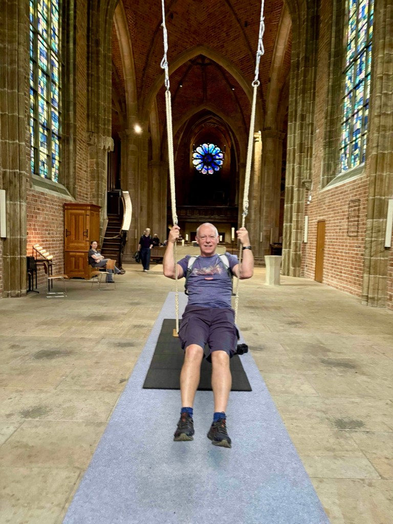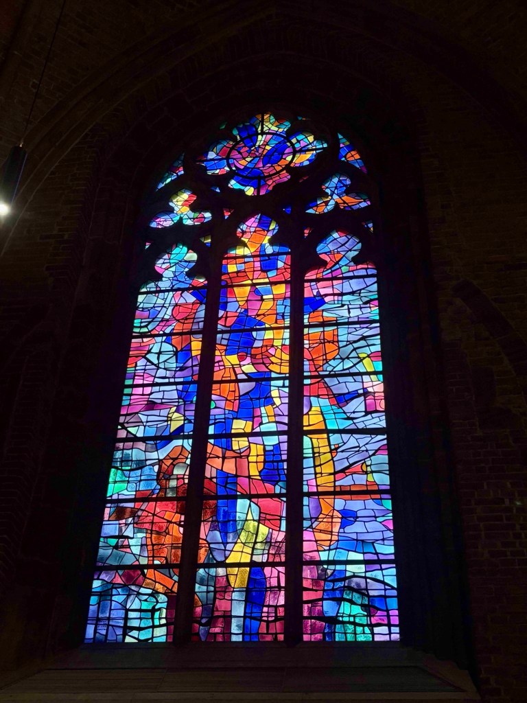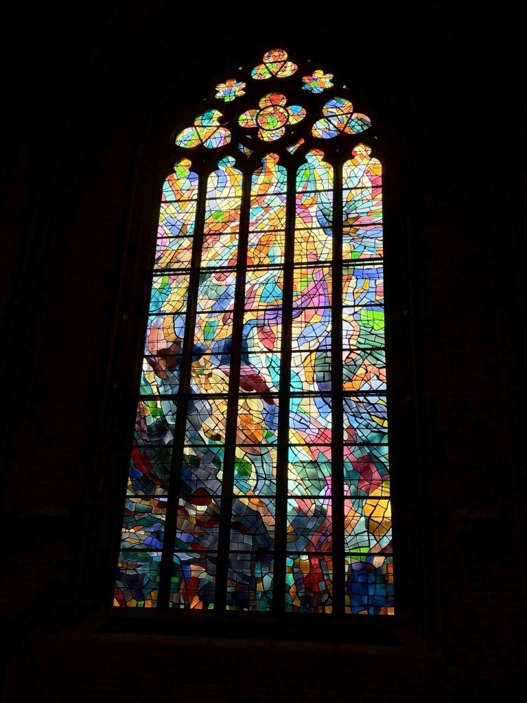 A visit to an unusual church next, Church of our Lady, where there are some beautiful modern stained glass windows and a swing which we both have a go on!