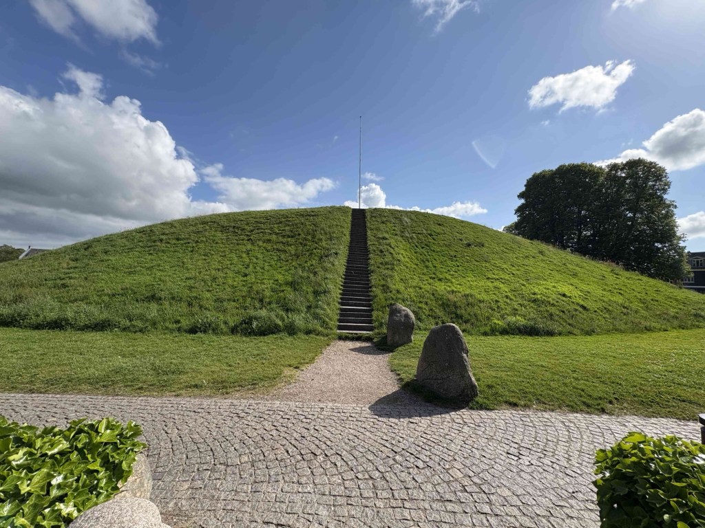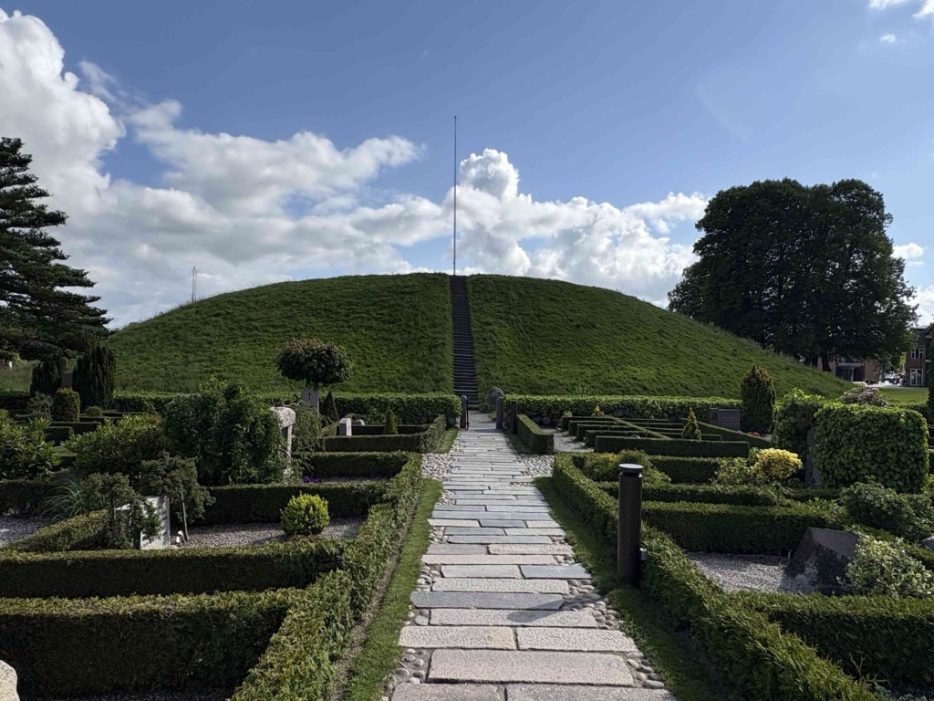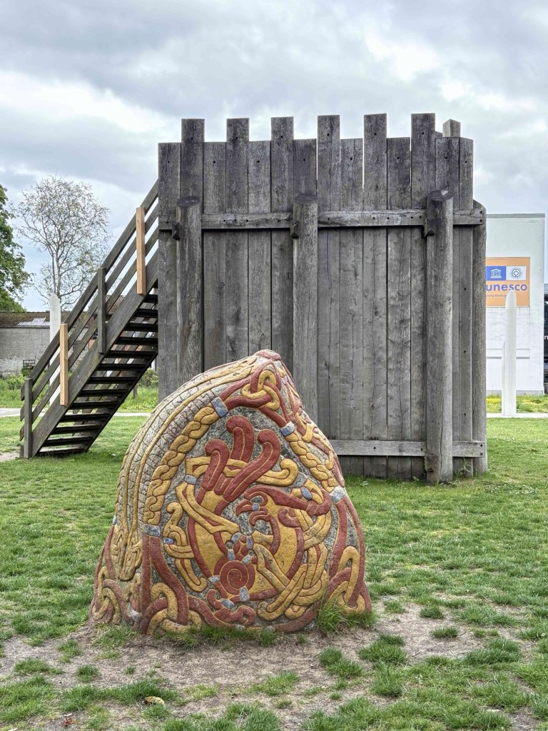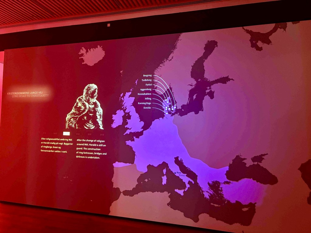 The museum Kongernes Jelling celebrates the viking Kings of the 10th century in their heyday, King Gorm and his son Harold Bluetooth. Guess where Nokia got the inspiration to name its tech discovery! It’s interactive with lots of buttons to press and me and T get to enter Valhalla virtually. From the rooftop terrace we can see the lines of white posts that represent the wooden palisade of King Gorm.