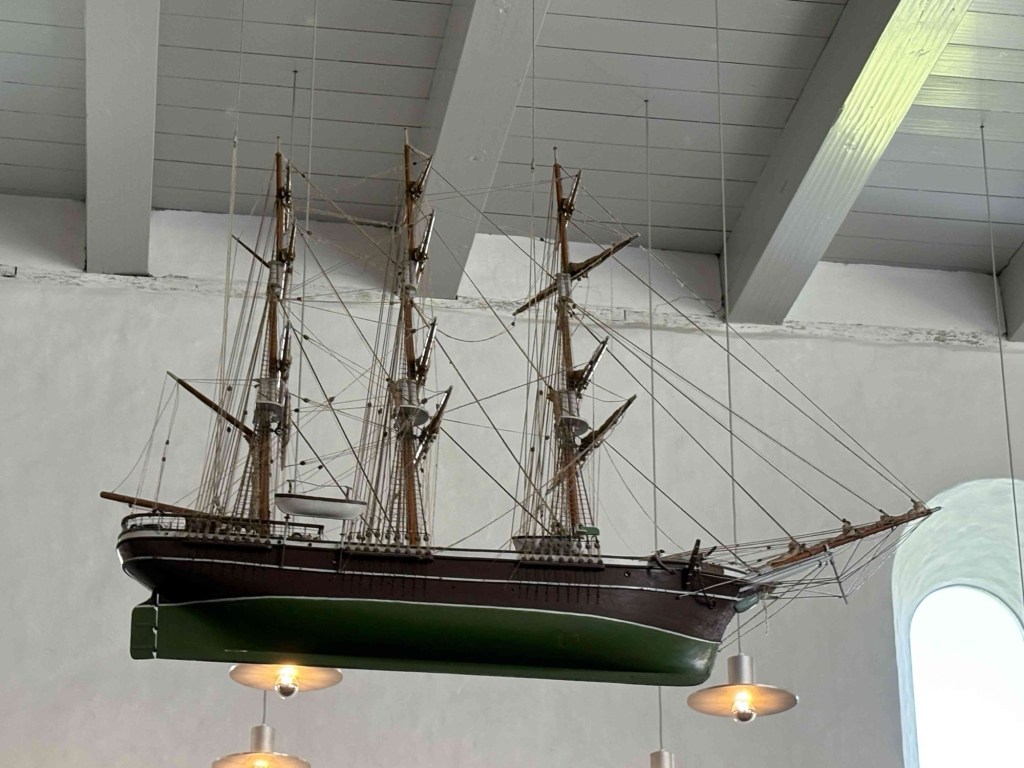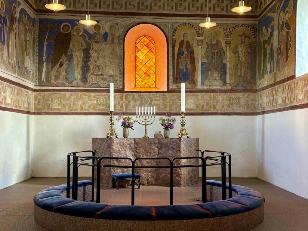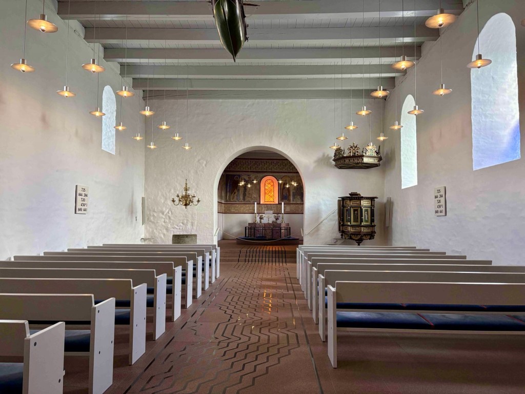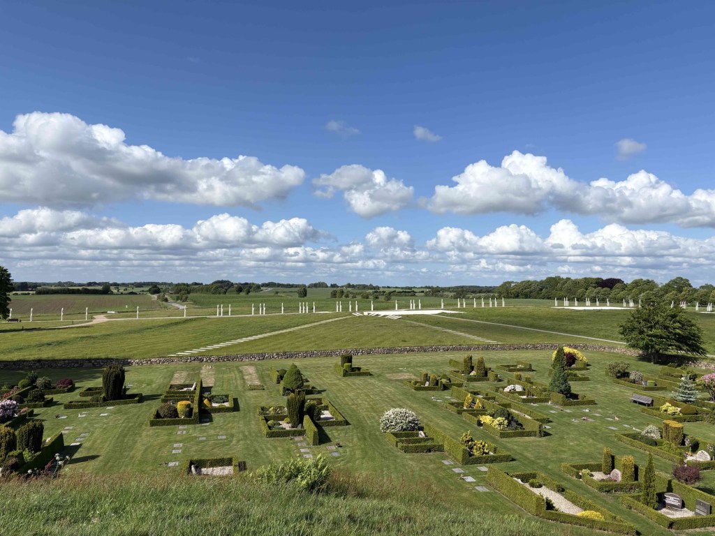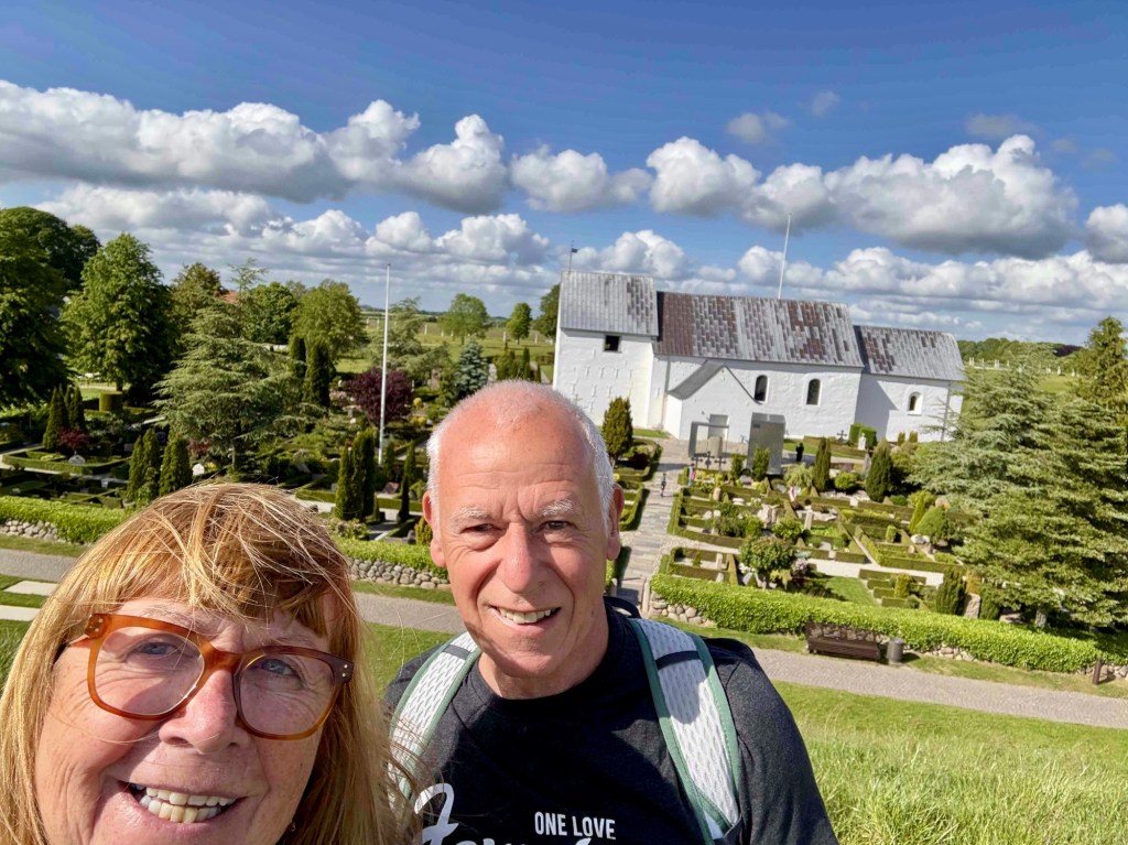 The museum Kongernes Jelling celebrates the viking Kings of the 10th century in their heyday, King Gorm and his son Harold Bluetooth. Guess where Nokia got the inspiration to name its tech discovery! It’s interactive with lots of buttons to press and me and T get to enter Valhalla virtually. From the rooftop terrace we can see the lines of white posts that represent the wooden palisade of King Gorm.