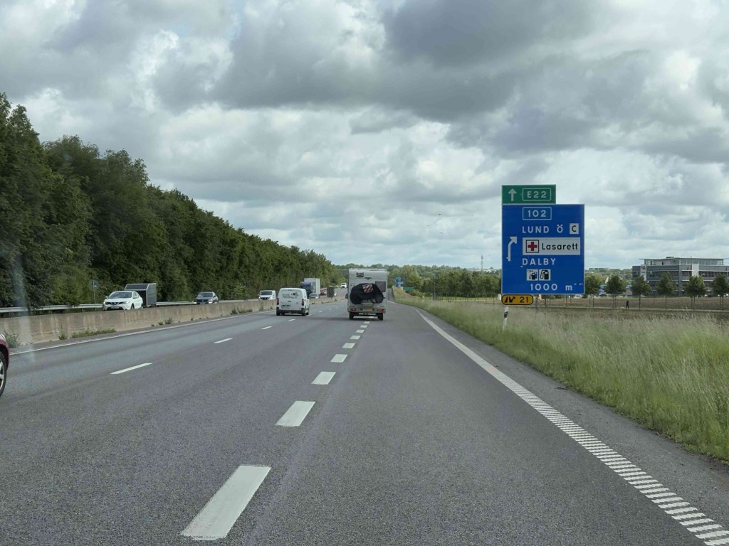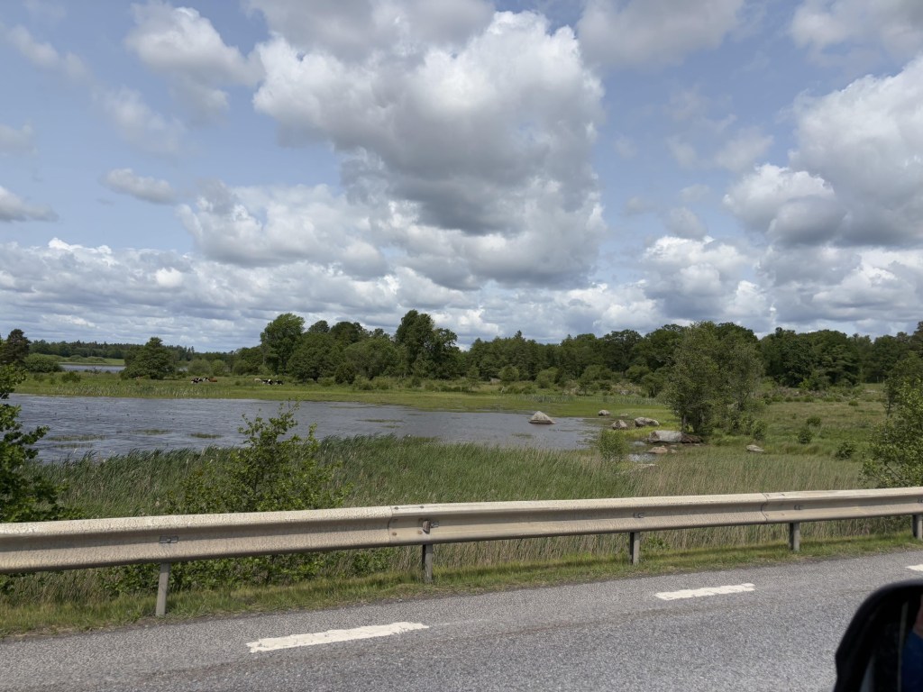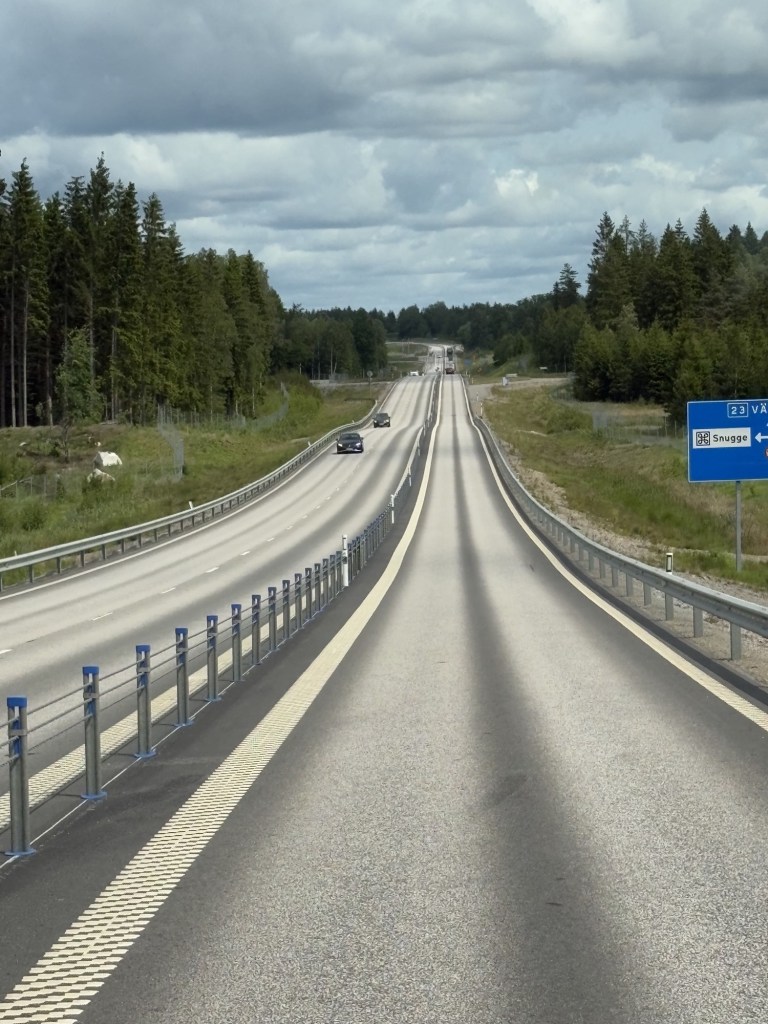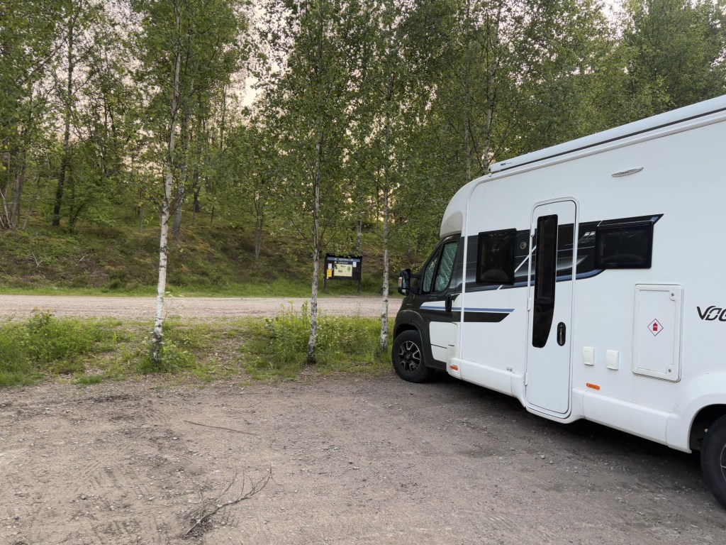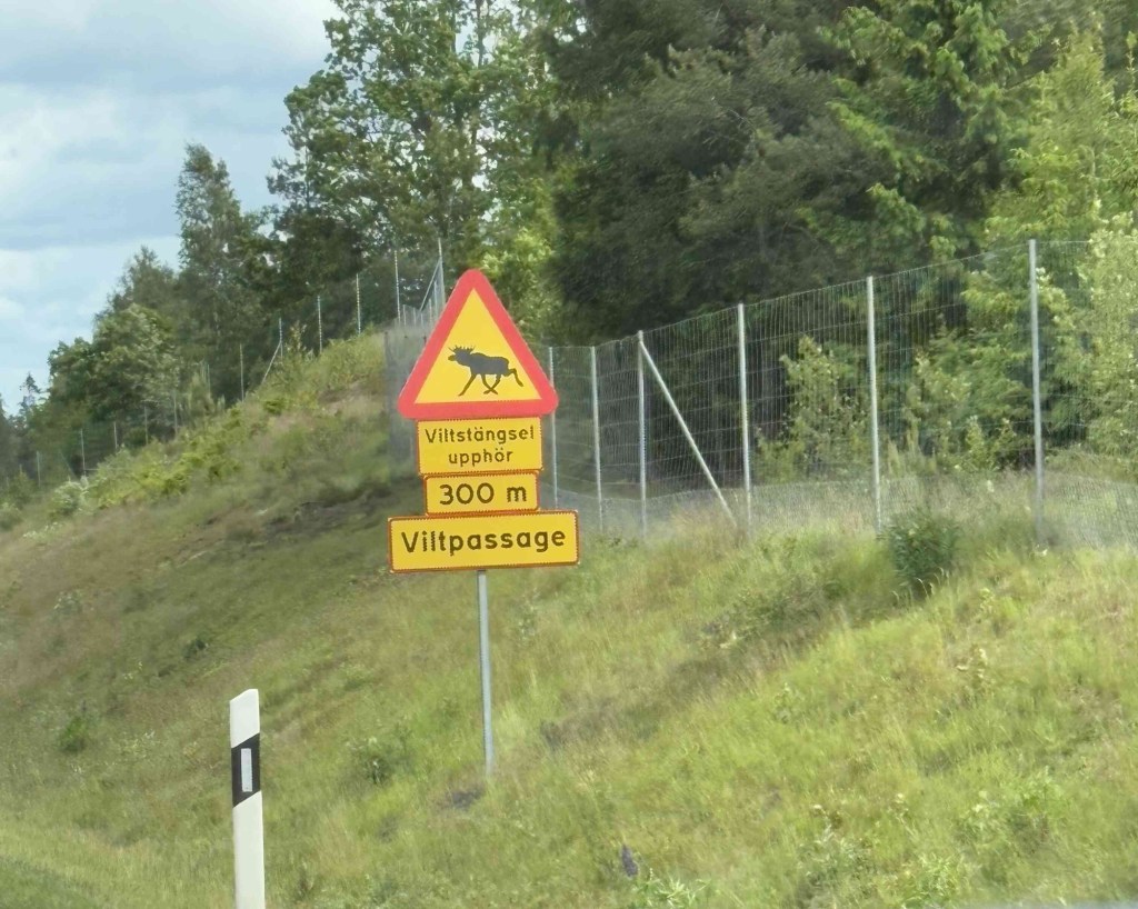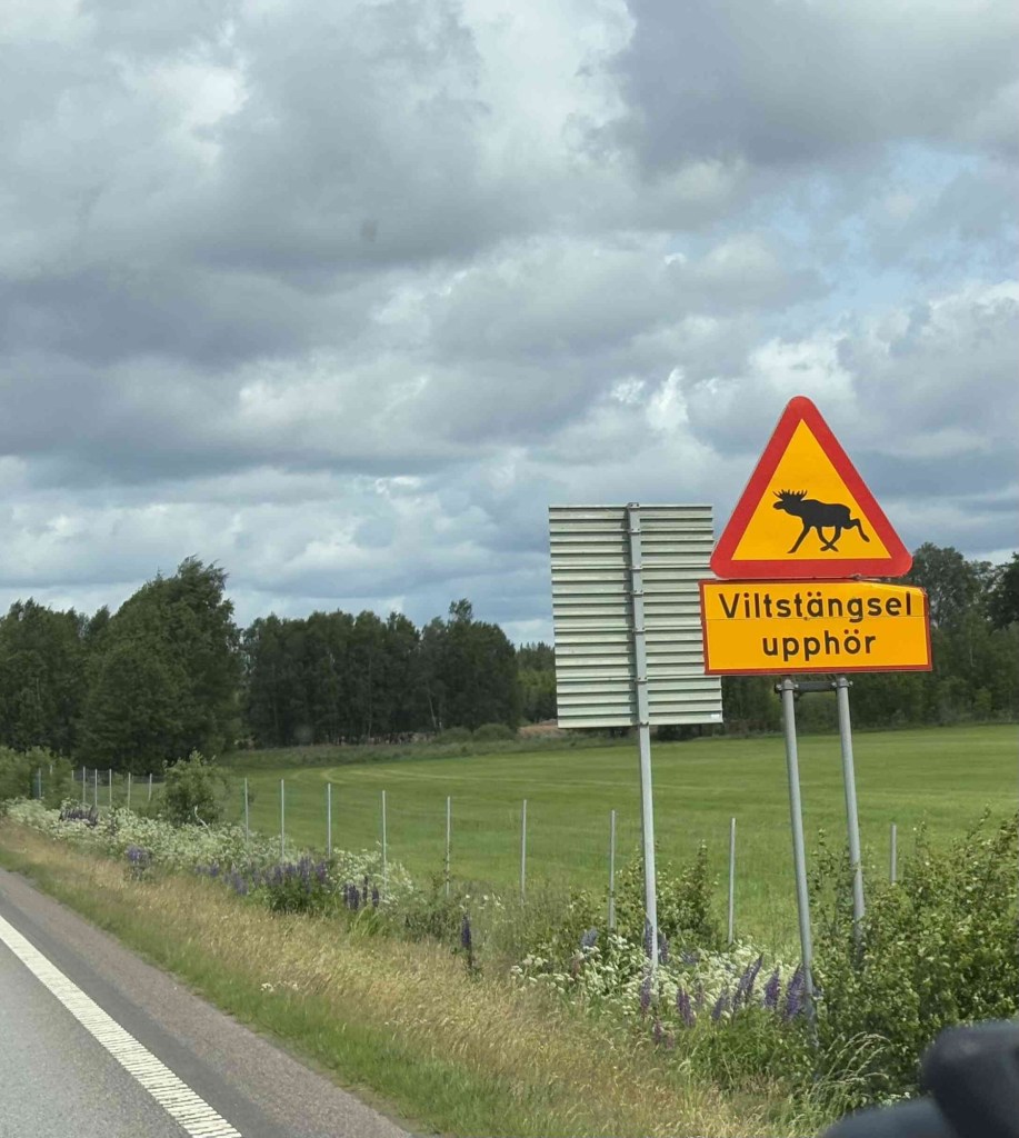See lots of signs about game that appear to translate to no hunting and also game crossing here, the fence has been removed from the side of the road and there’s no barrier in the centre so we assume it’s a migration route. The image of the game looks like a moose. Google says that there are between 300k and 400k moose in the summer in Sweden but we haven’t seen any yet.