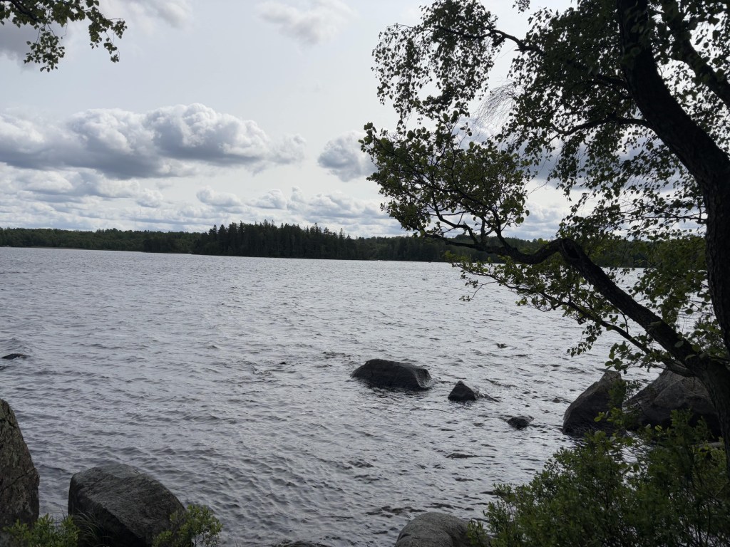 Our place for the evening is a small campsite with a compost toilet. There’s another van and a couple of cars already here. We enjoy lunch and then wander out for a walk. I met a chap at the info board that said it’s a lovely three hour walk around the lake. After half an hour I’m hating it. Tree roots and rocks at every step so I feel like I’m looking permanently down at the ground with an occasional glimpse of the lake through the trees. I head back and leave T to it.