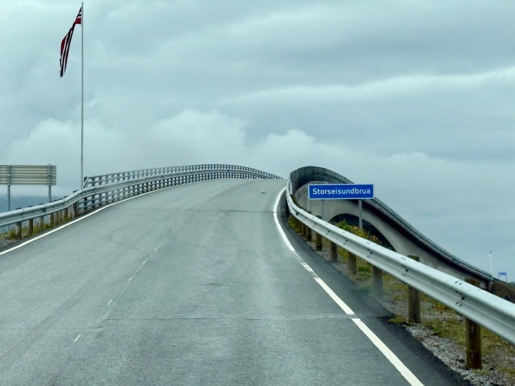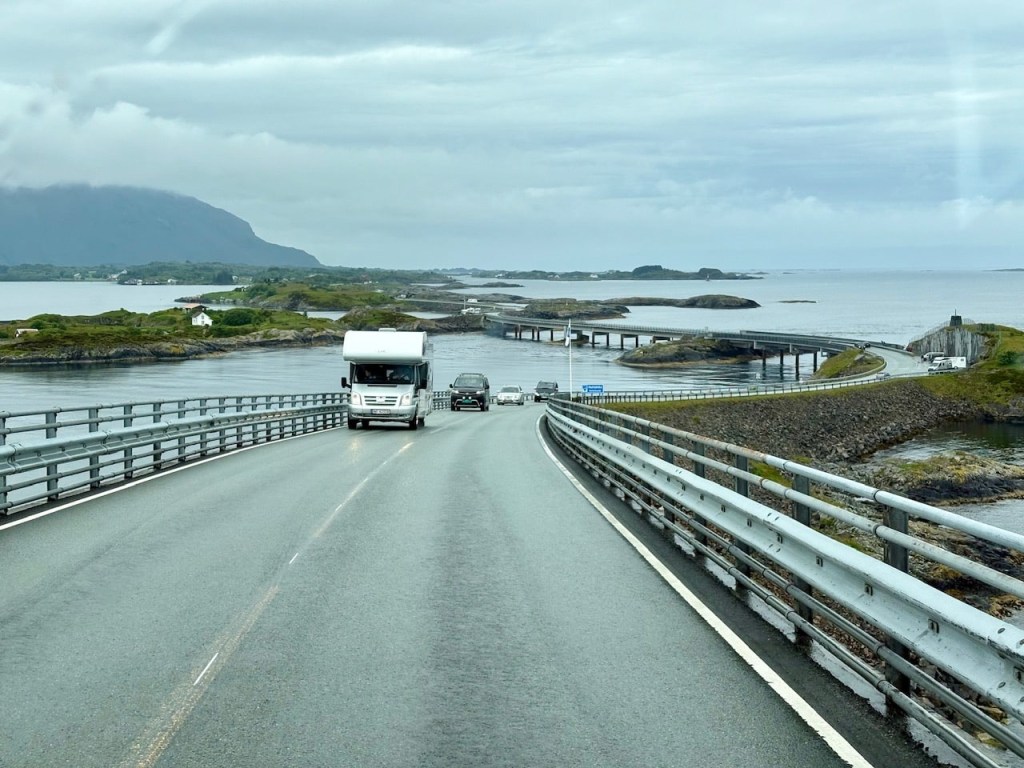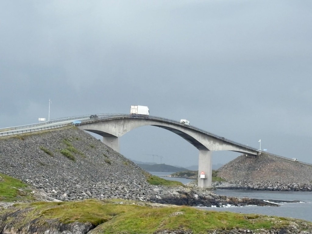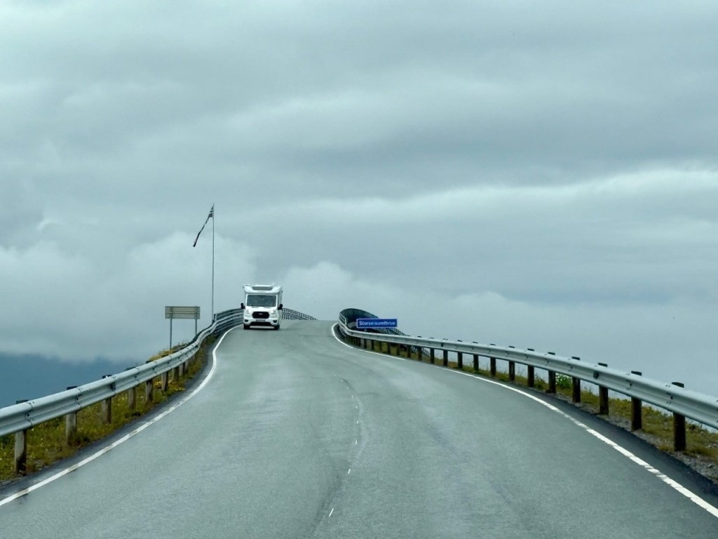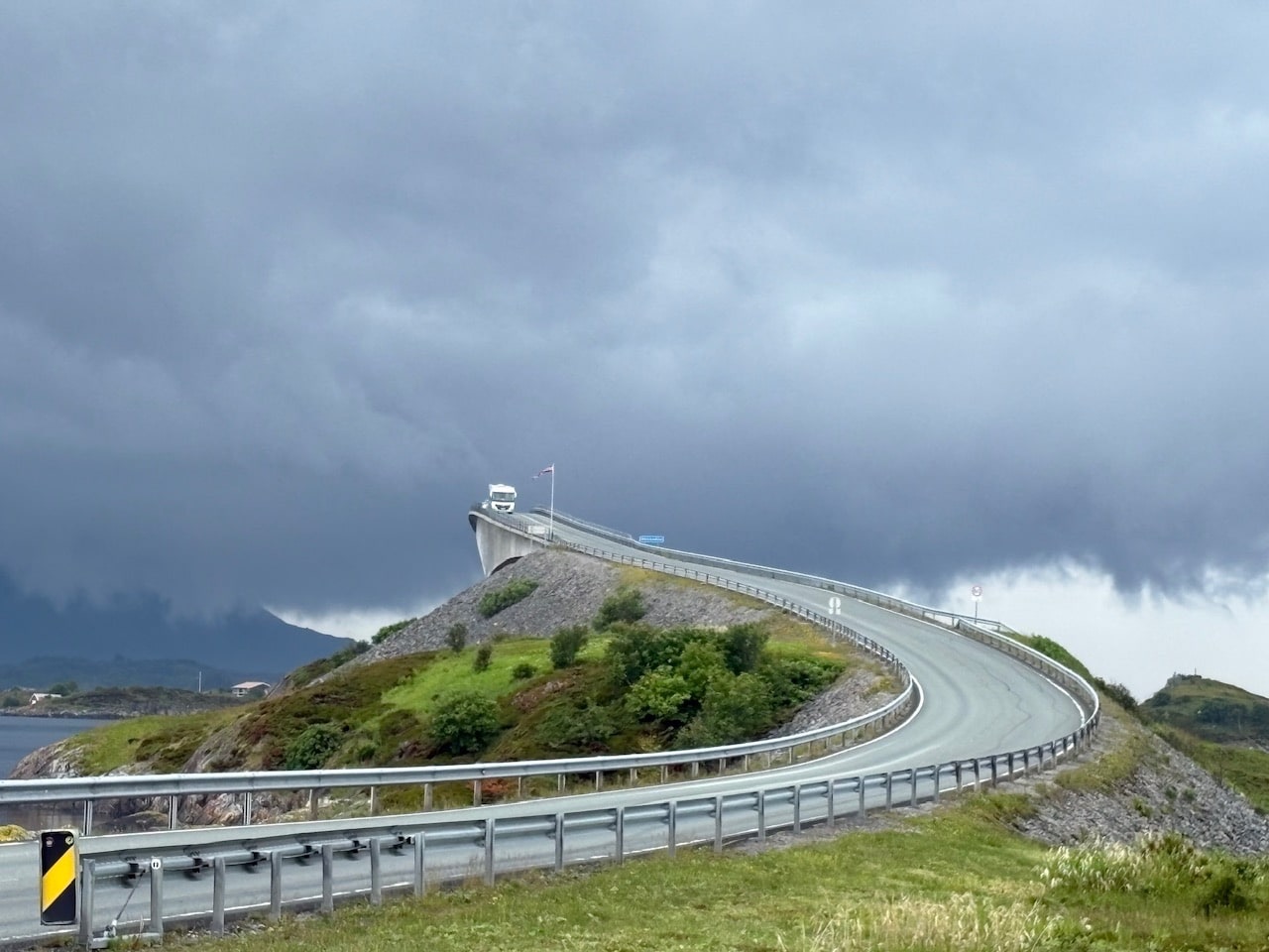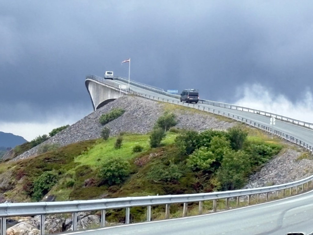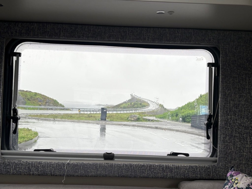 It’s overcast but not raining so we get up and on the road. Our first stop is a viewing point for the odd looking Storseisundet Bridge for a close up before heading across. We can see the rain clouds coming our way.