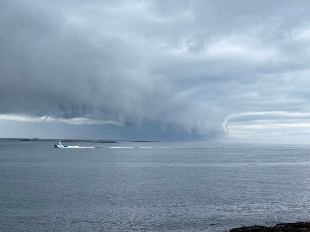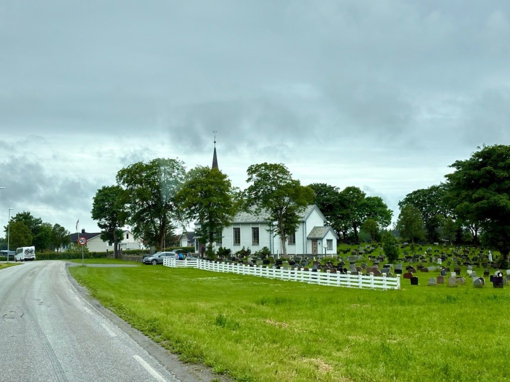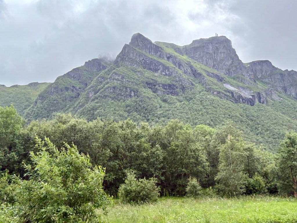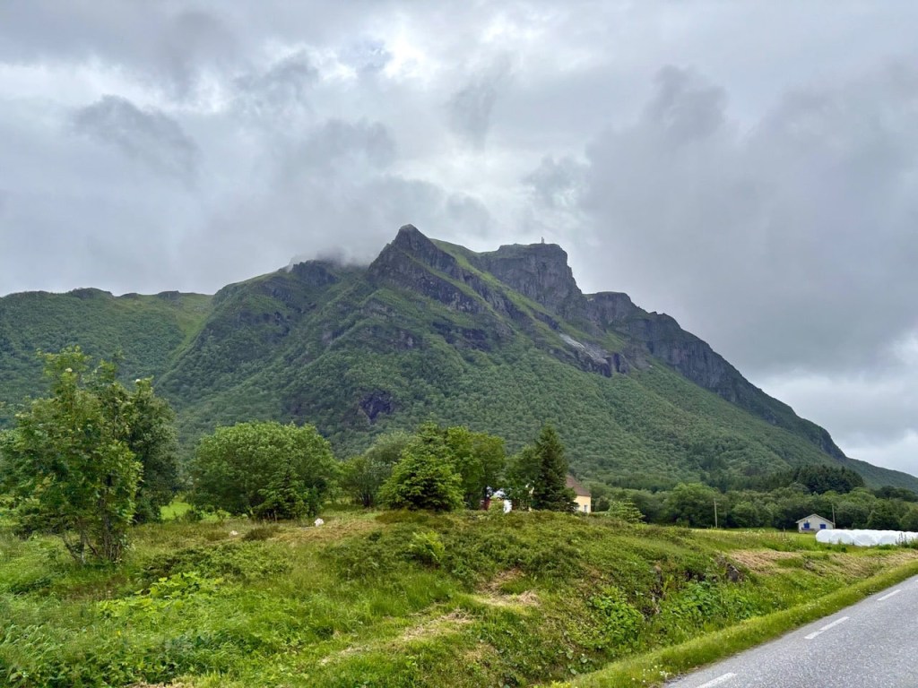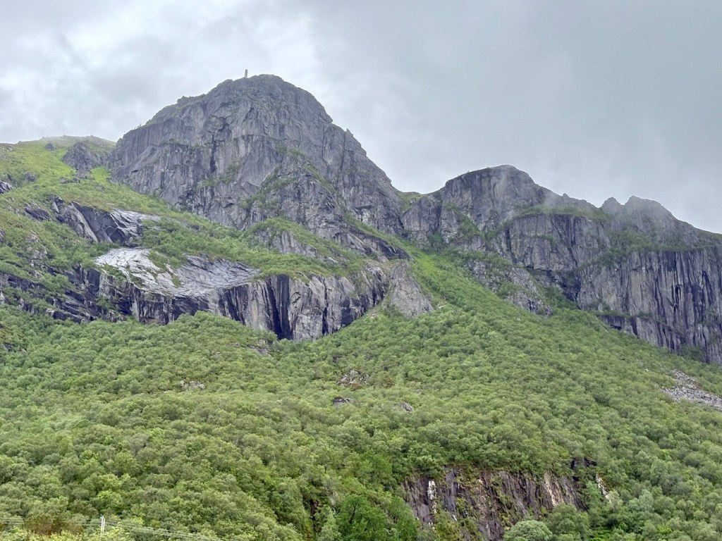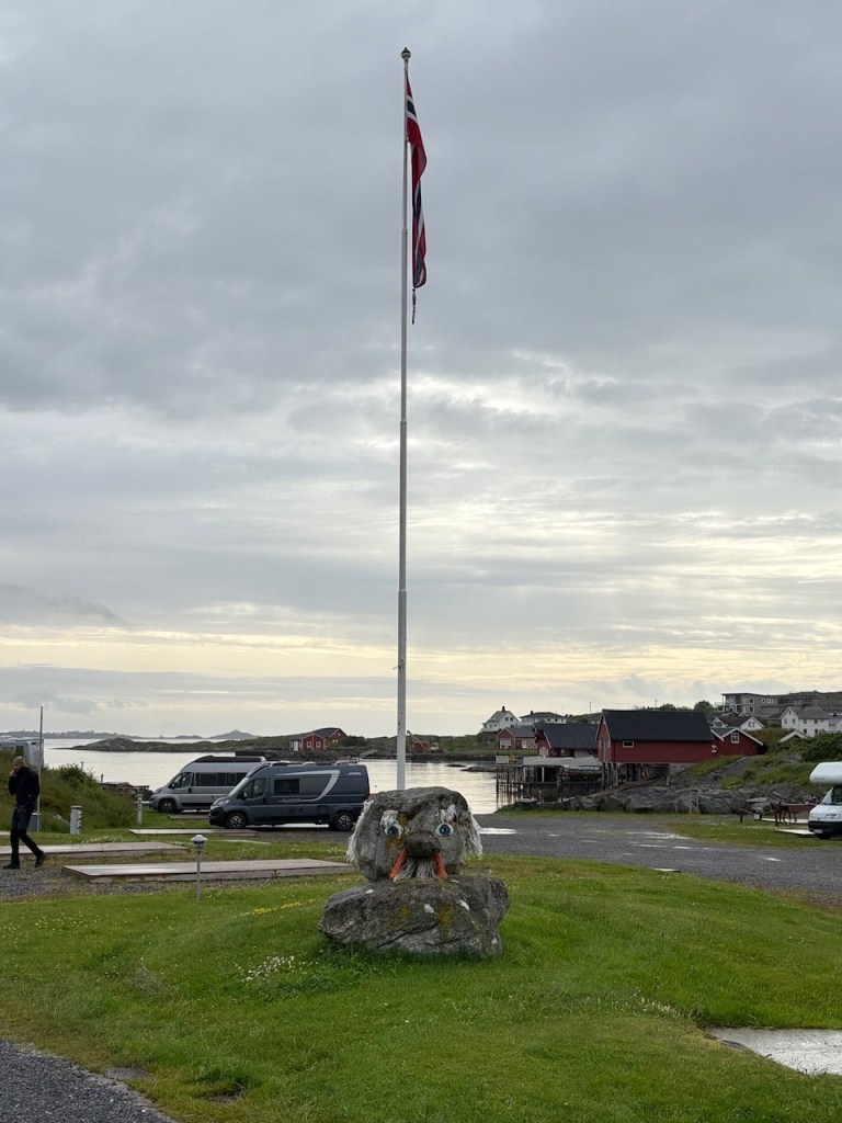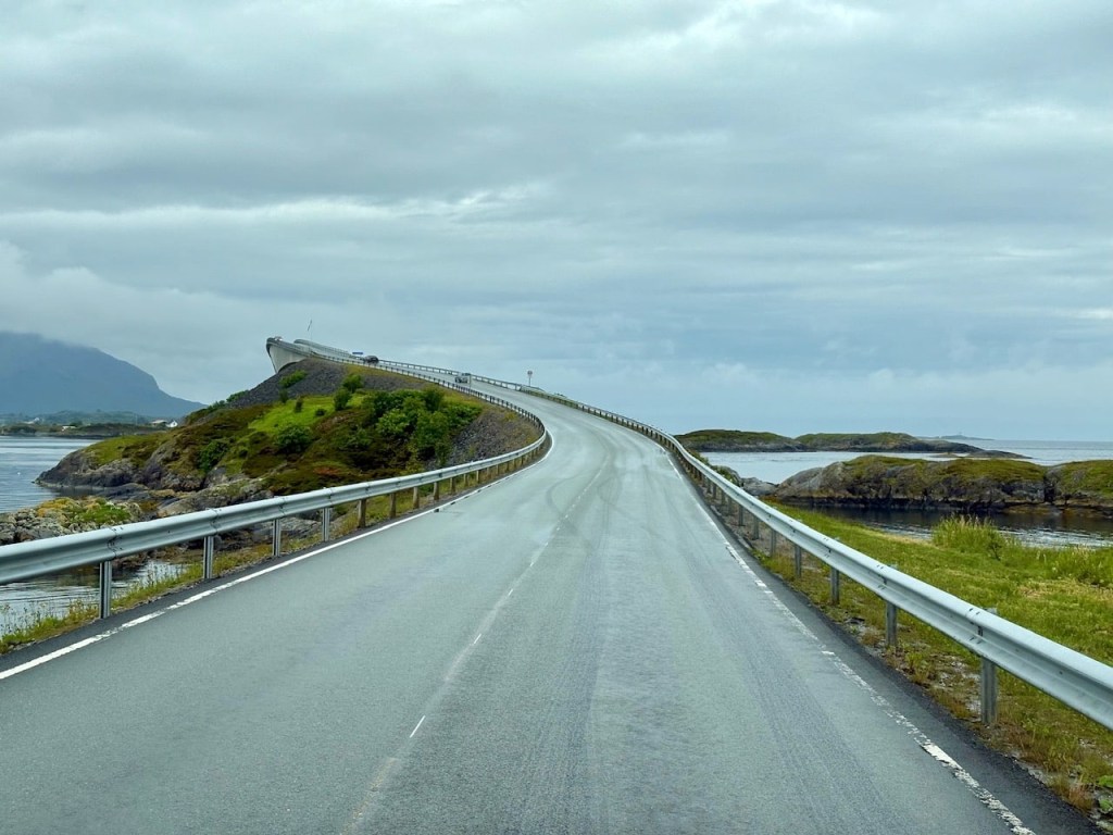 It’s overcast but not raining so we get up and on the road. Our first stop is a viewing point for the odd looking Storseisundet Bridge for a close up before heading across. We can see the rain clouds coming our way.