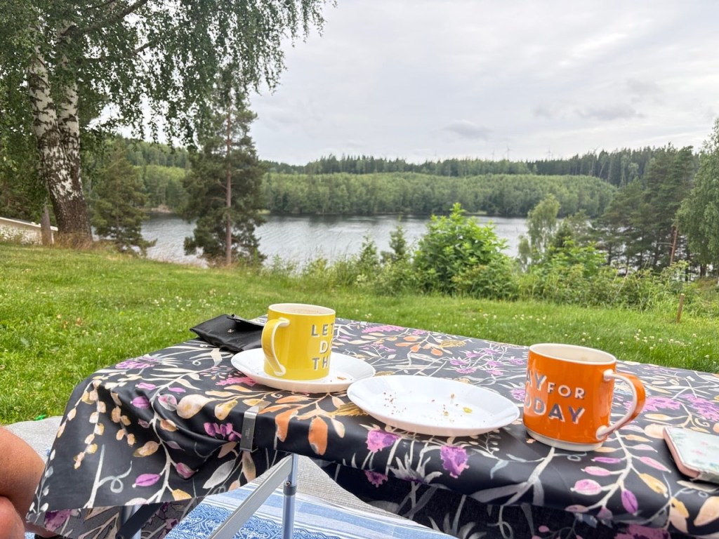 It’s just before 5pm when we land at Årjäng Camping & Stugor Sommarvik. We have a nice spot overlooking Lake Västra Silen part of a network of interconnected lakes accessible via locks. However we are too close to the swimming pool currently full of screaming kids. The site is full though so we have to grin and bear it. It’s sunny and windy outside but warm enough to enjoy a cuppa and some cake.